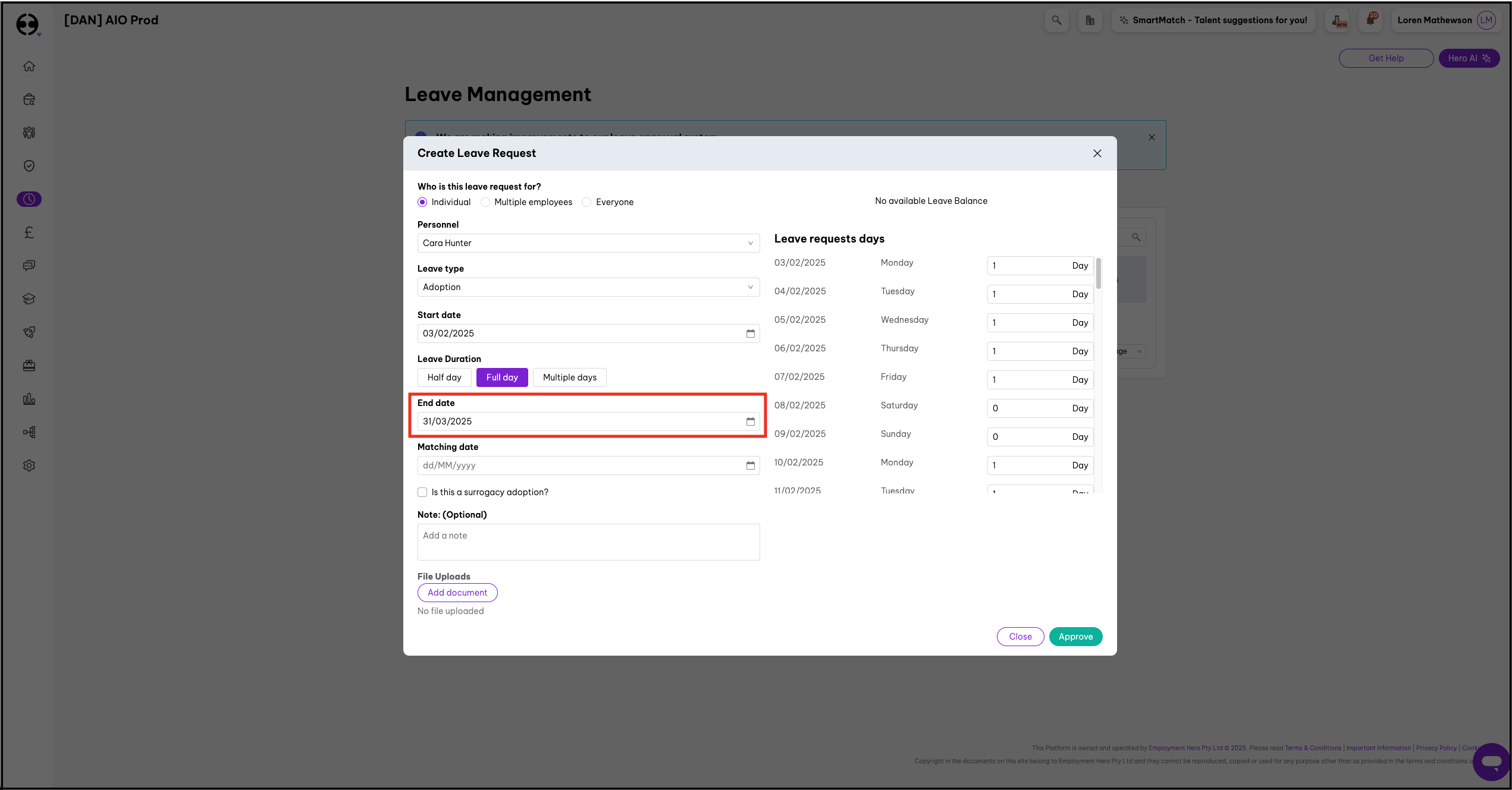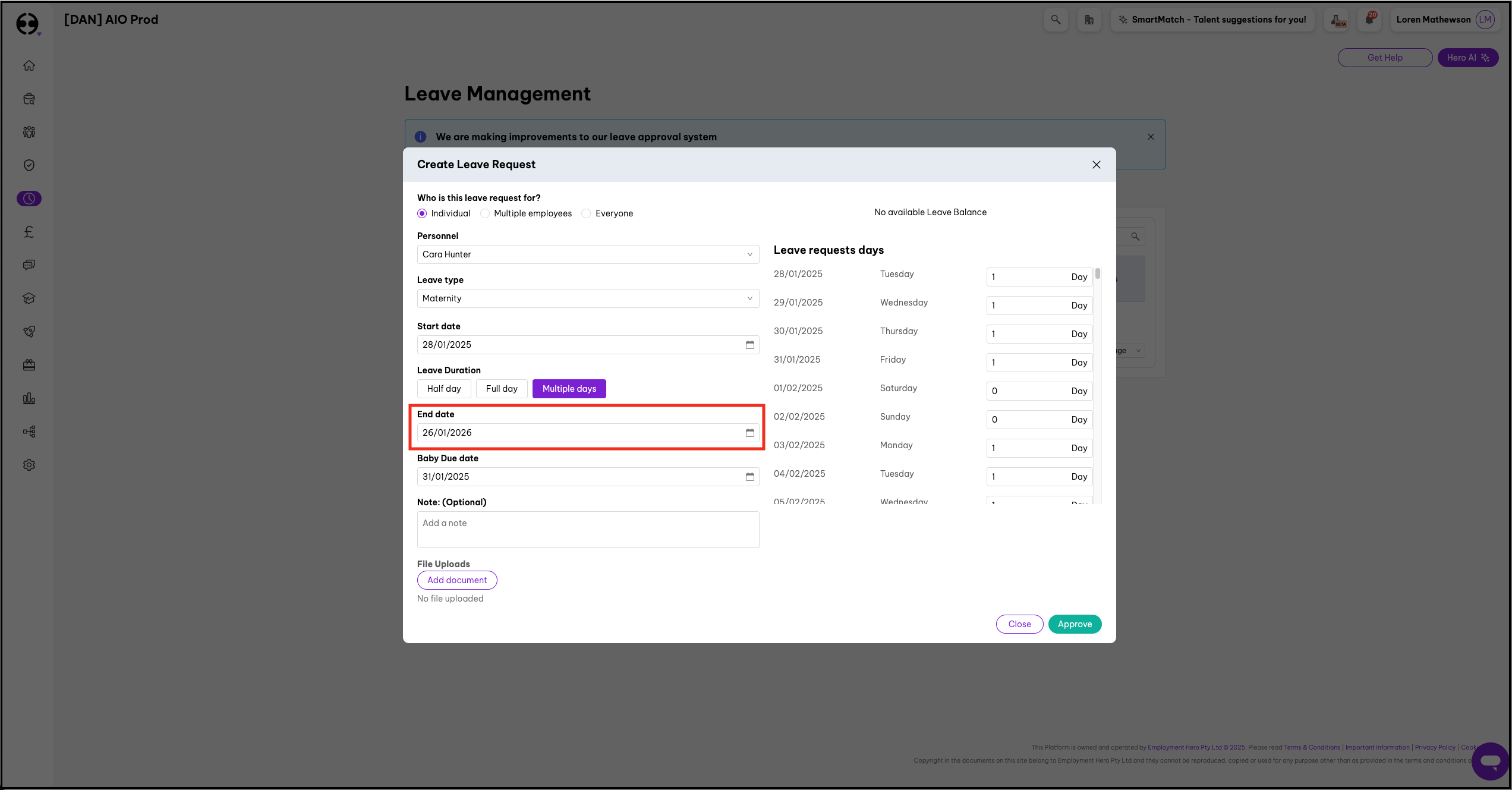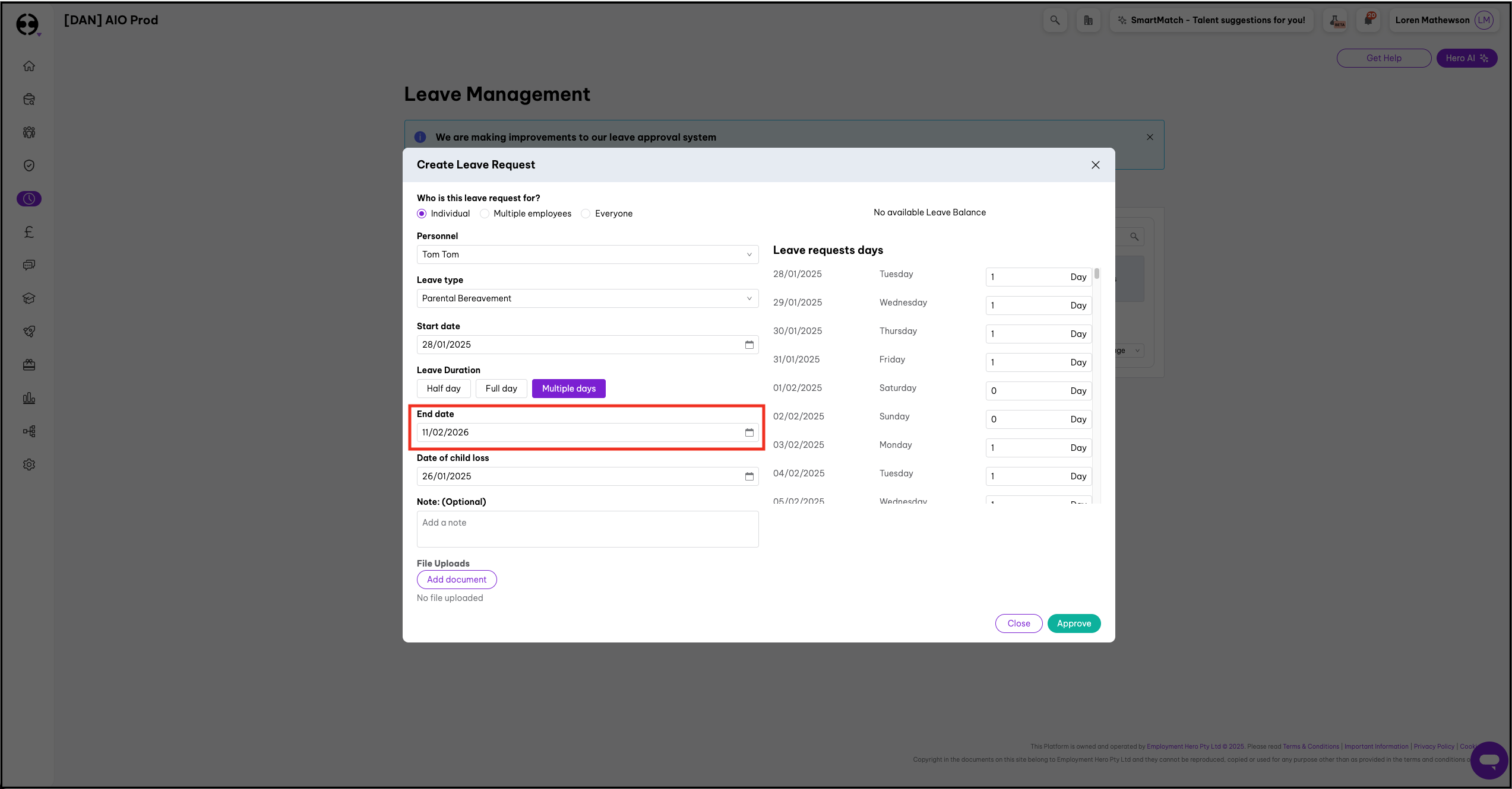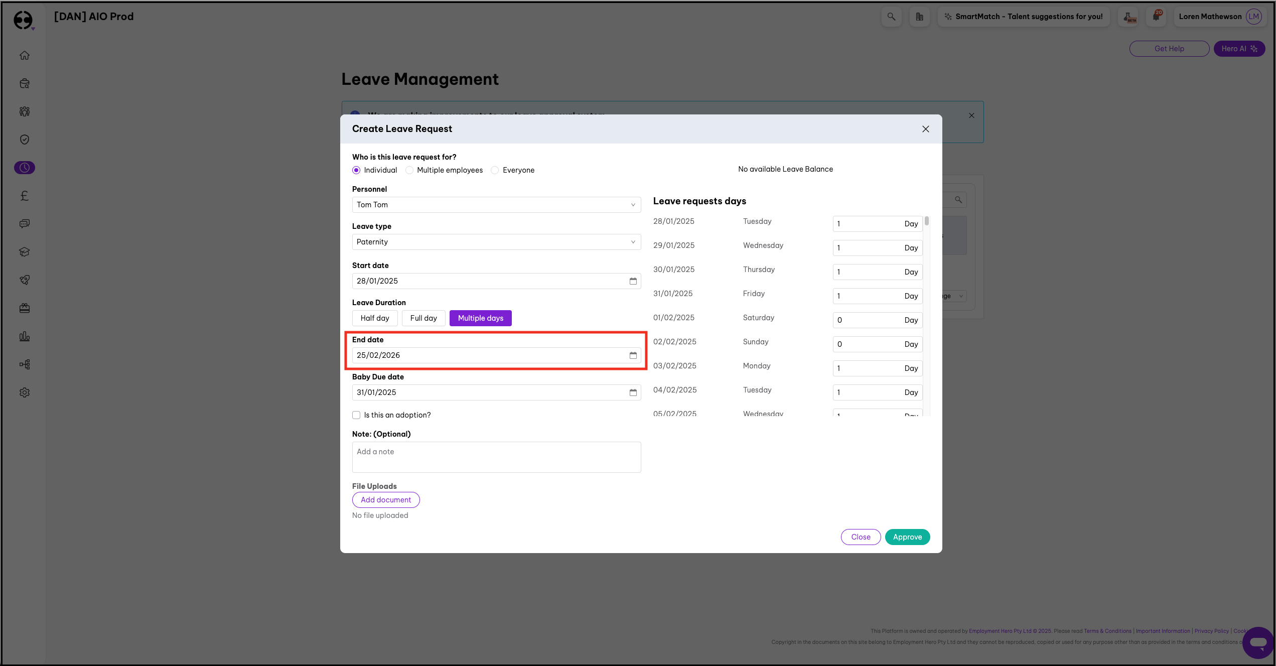 - In the Leave Duration field, select either Half day, Full day, or Multiple days.