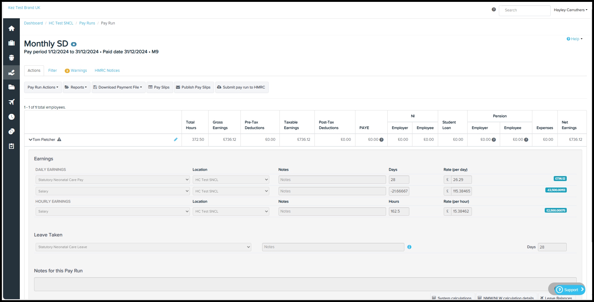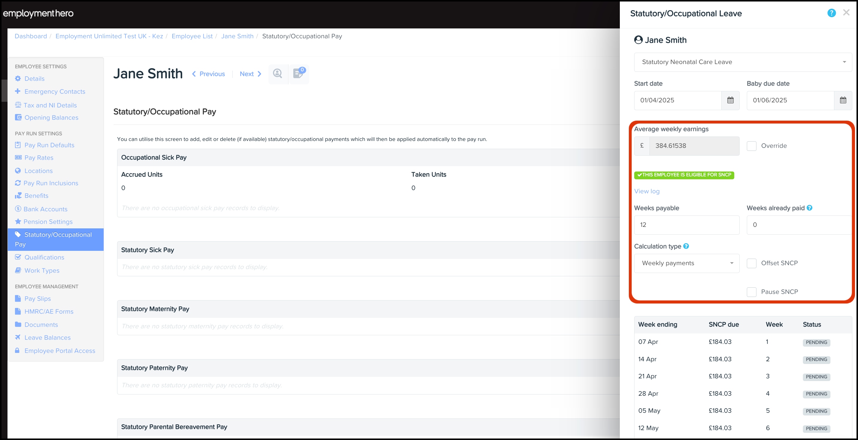 The employee's eligibility for SNCP (statutory neonatal care pay) is calculated automatically. You will therefore either see a green note that says "✓ This employee is eligible for SNCP" or a red note that says "This employee is not eligible for SNCP".