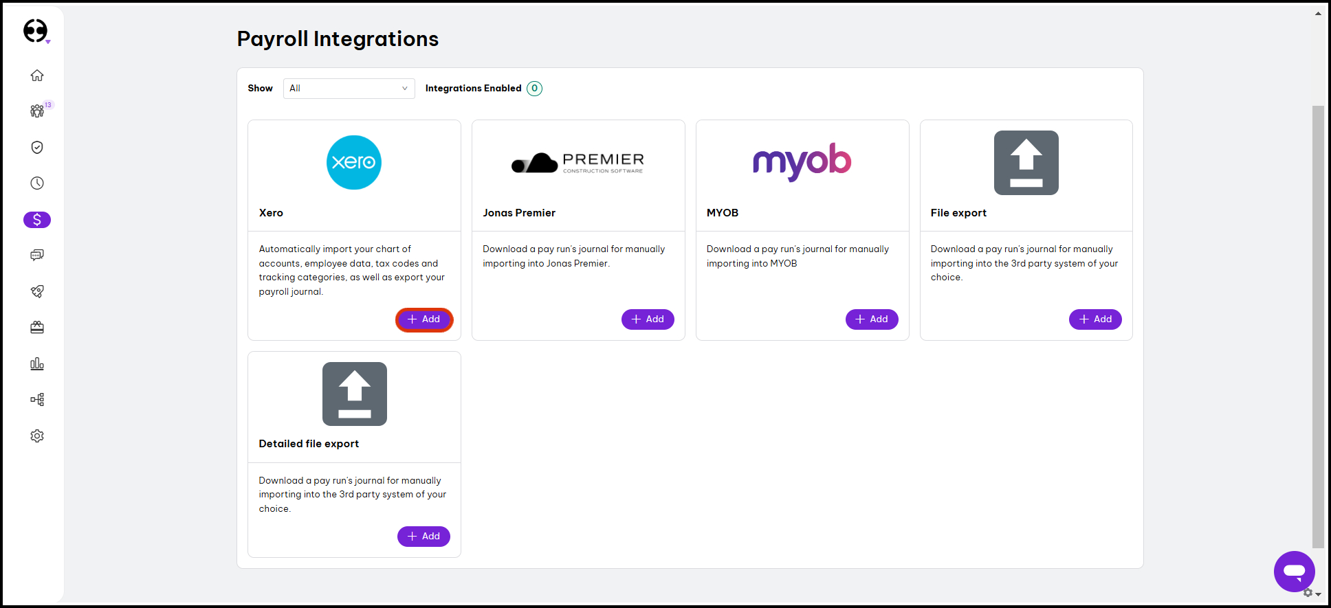 This article explains how to manage payroll integration on the EOS platform. Integrations allow you to import information such as chart of accounts and employee data into your EOS platform. You can enable and disable payroll integrations as needed