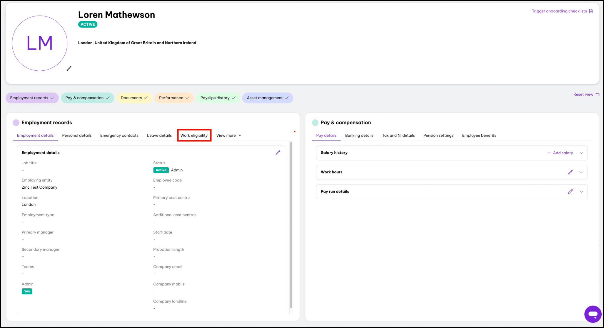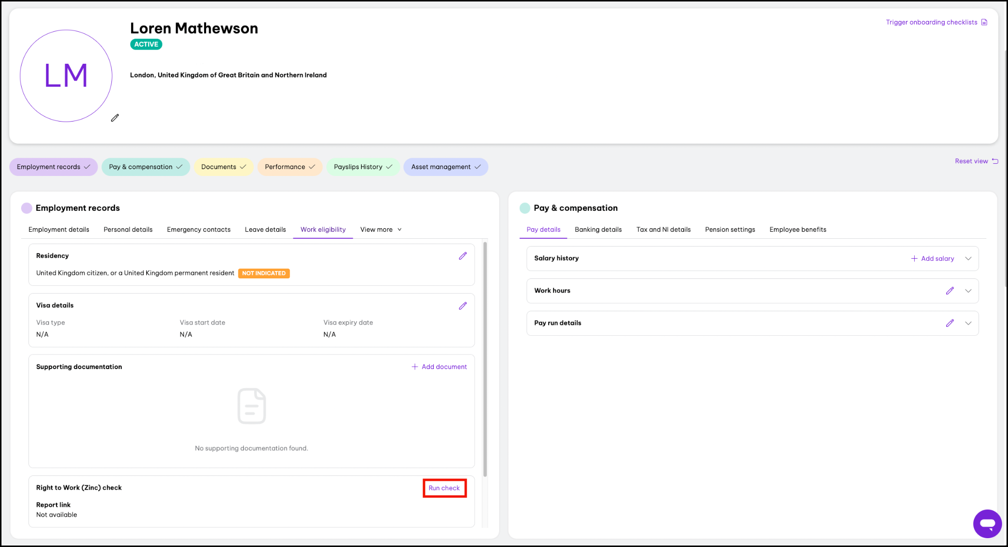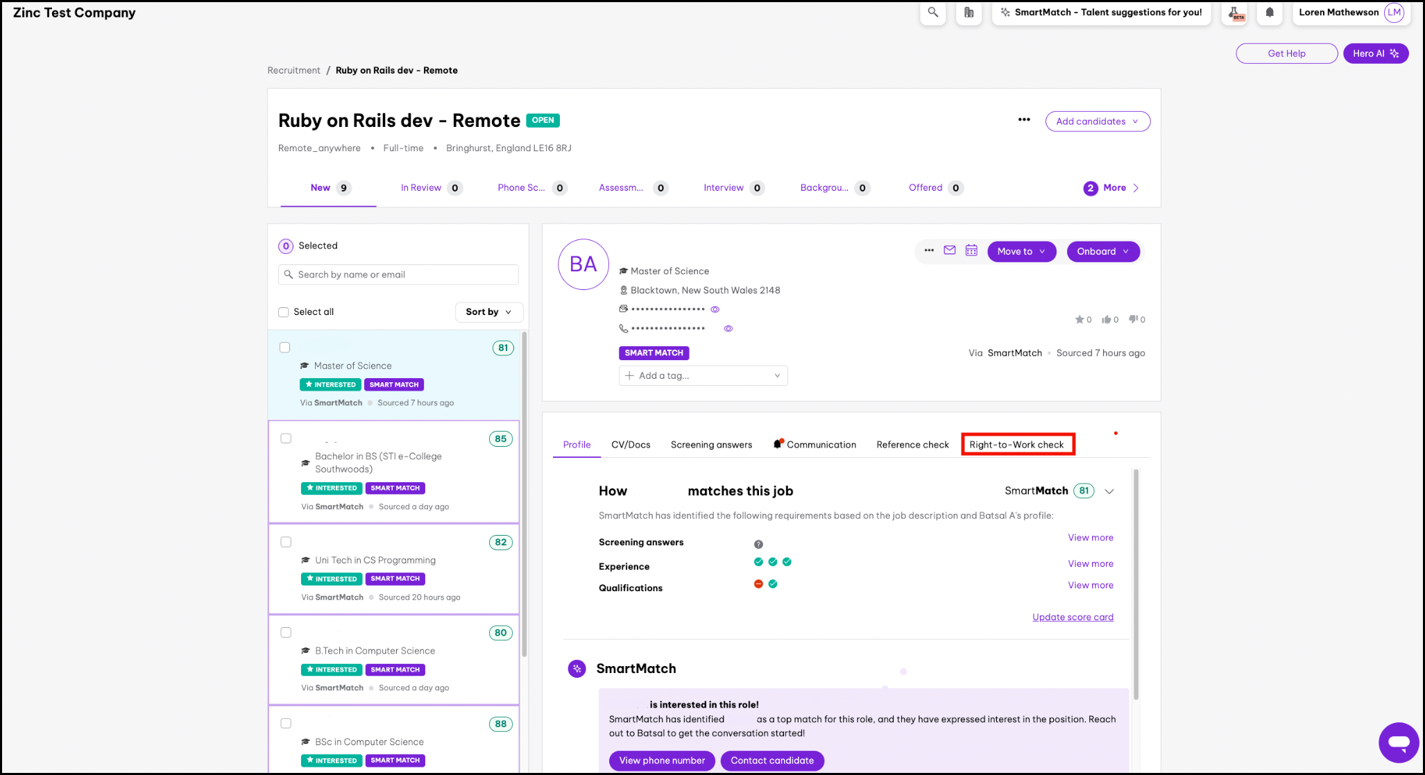 - Next, Zinc will contact the candidate to gather their personal information, perform the independent verification, then the completed right-to-work check will appear in the candidate's profile.