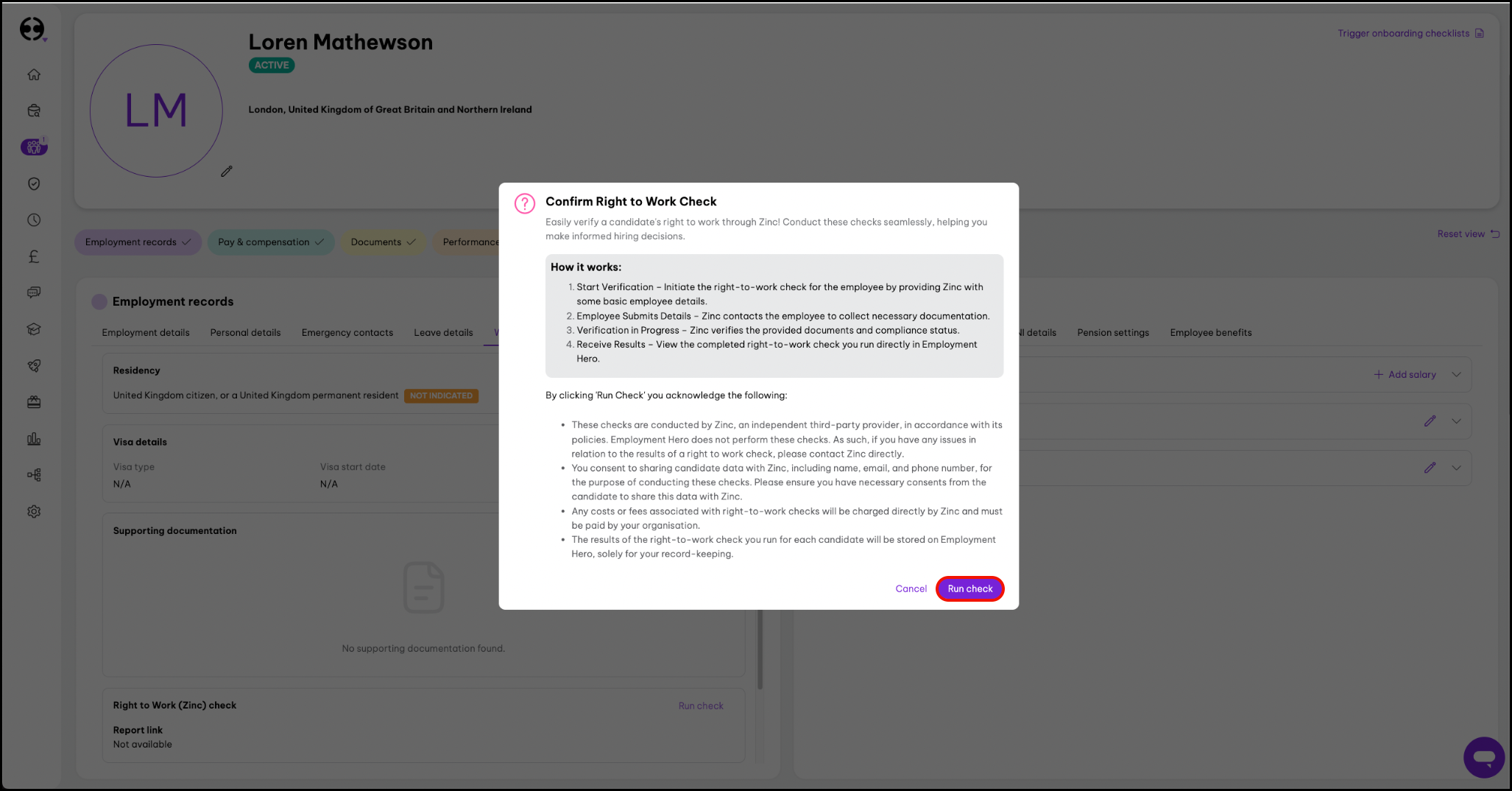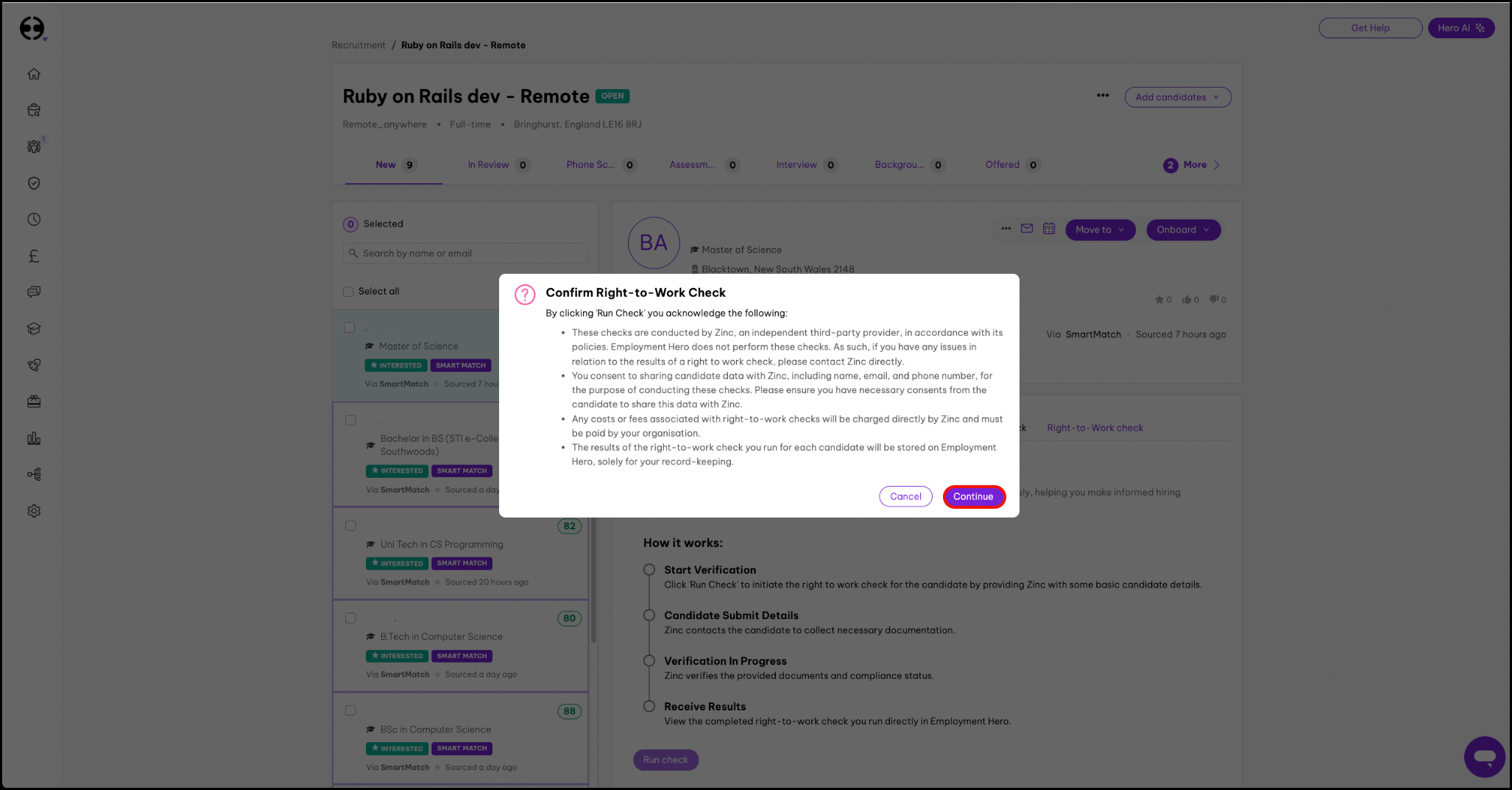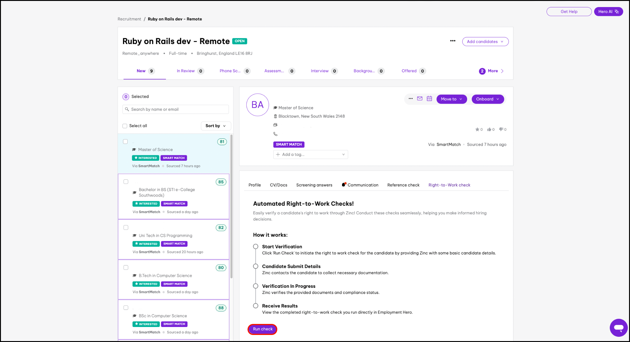 You can integrate your Employment Hero account with Zinc seamlessly to perform your pre-employment right-to-work (RTW) checks.