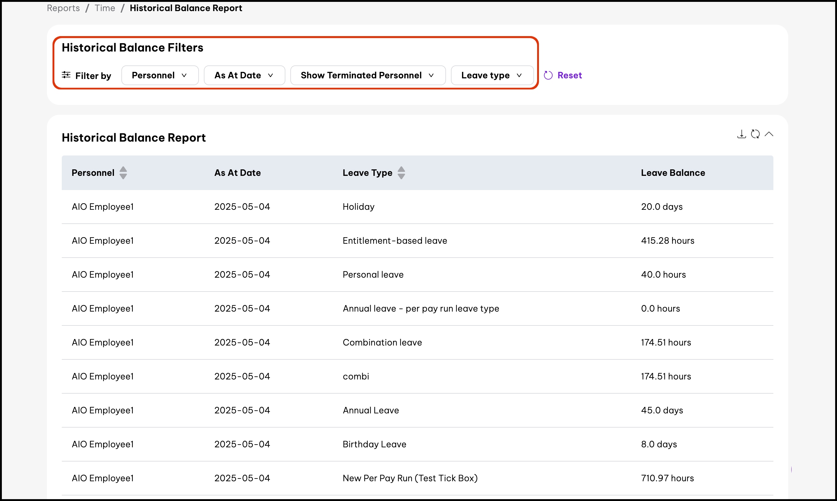 By default, the Historical Balance Report page displays each employee’s current leave balance. To view balances from a past date (e.g. one year prior), use the As At Date filter. For more guidance, refer to this article’s Filter report section below.