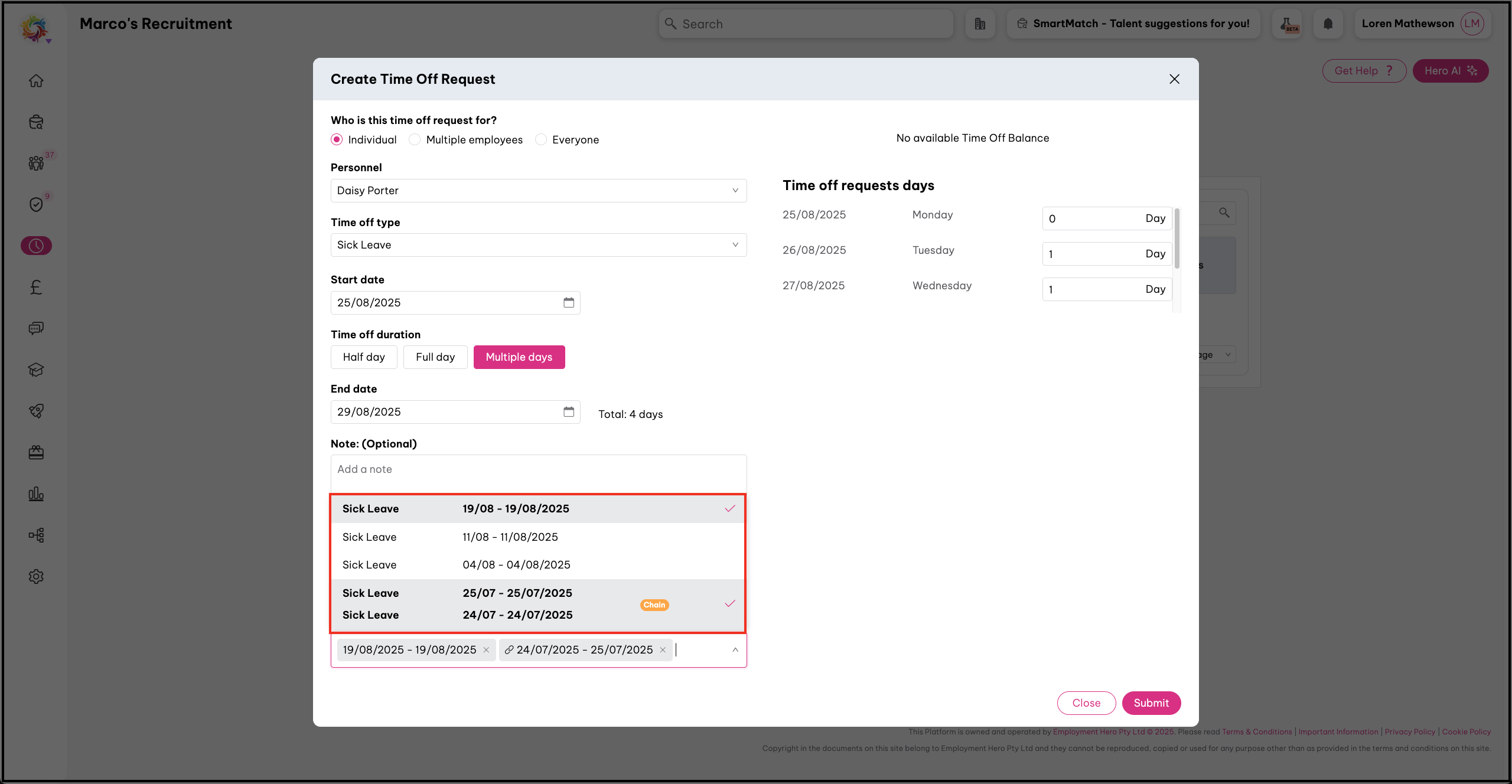 There may be situations where an employee has two or more time off requests that should have been one request based on your company’s guidelines. For instance, an employee on sick leave may realise they are still unwell at the end of their leave period, and submit a new sick leave request instead of extending the existing one. This will adversely affect an employee’s Bradford Factor score, and can add a lot of complexity to making administrative decisions.