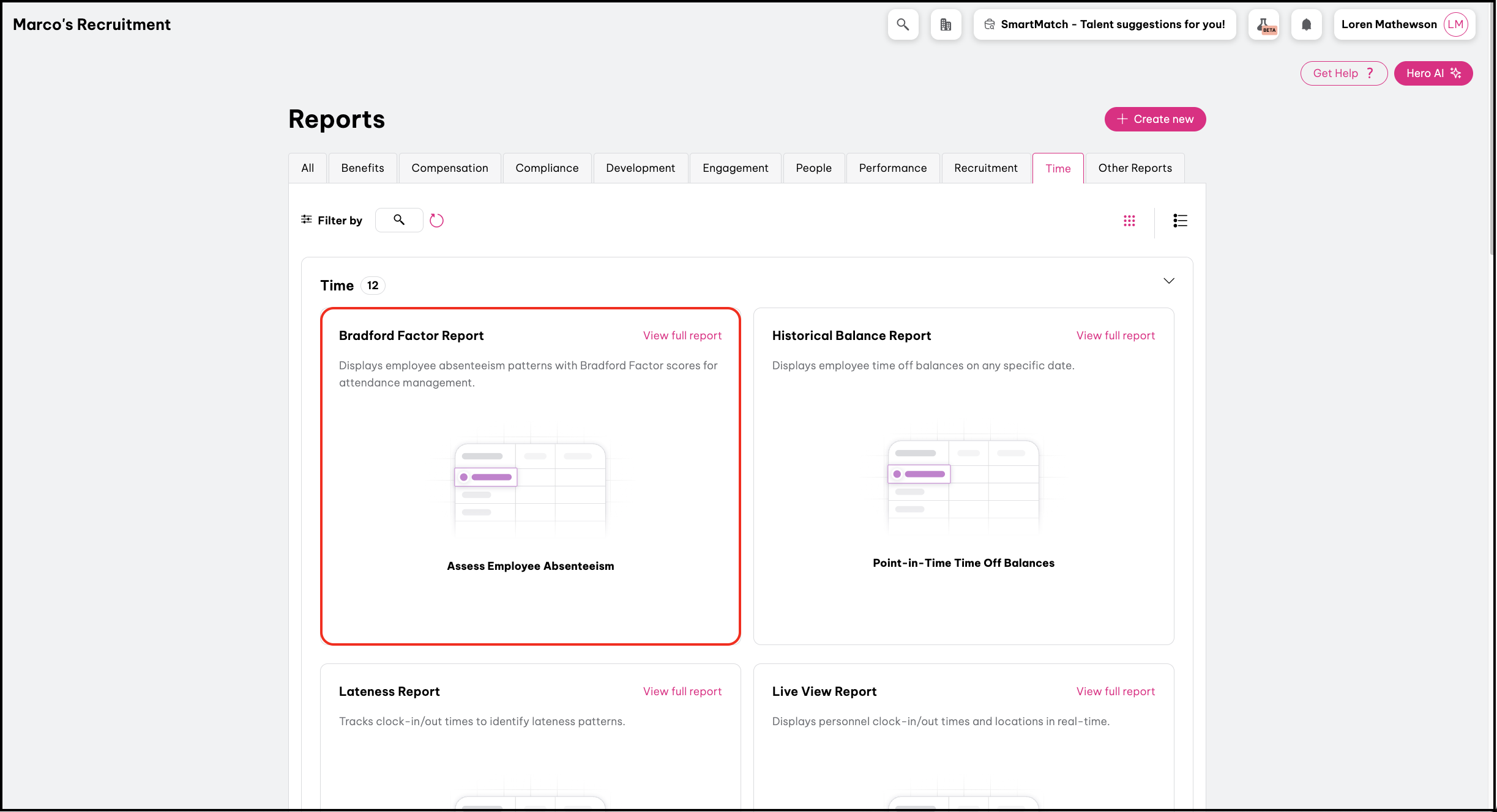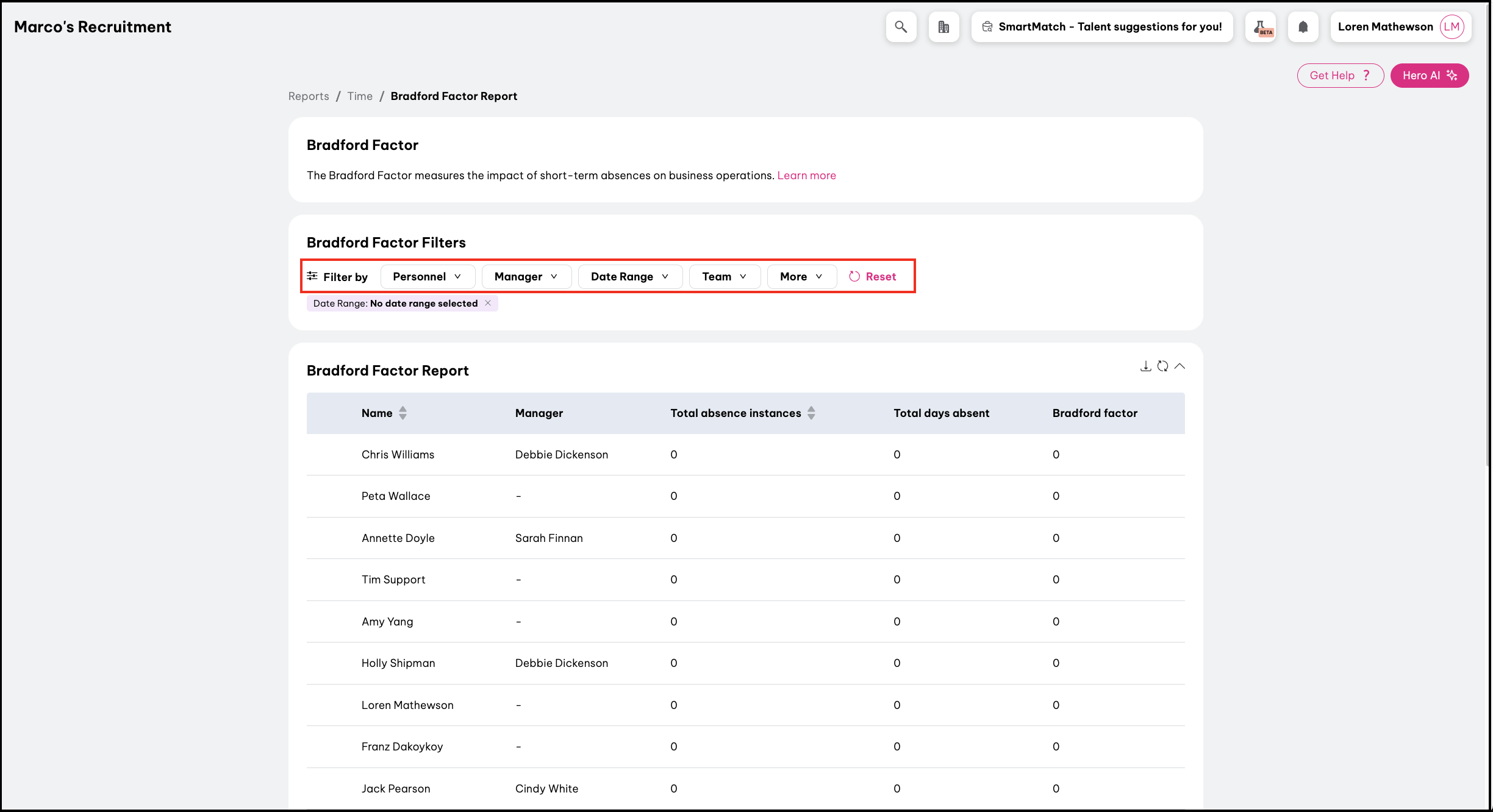 - Navigate to Time reports and select the Bradford Factor Report.