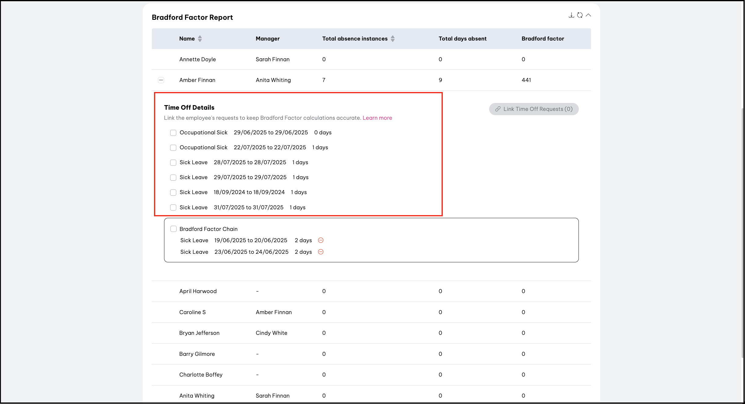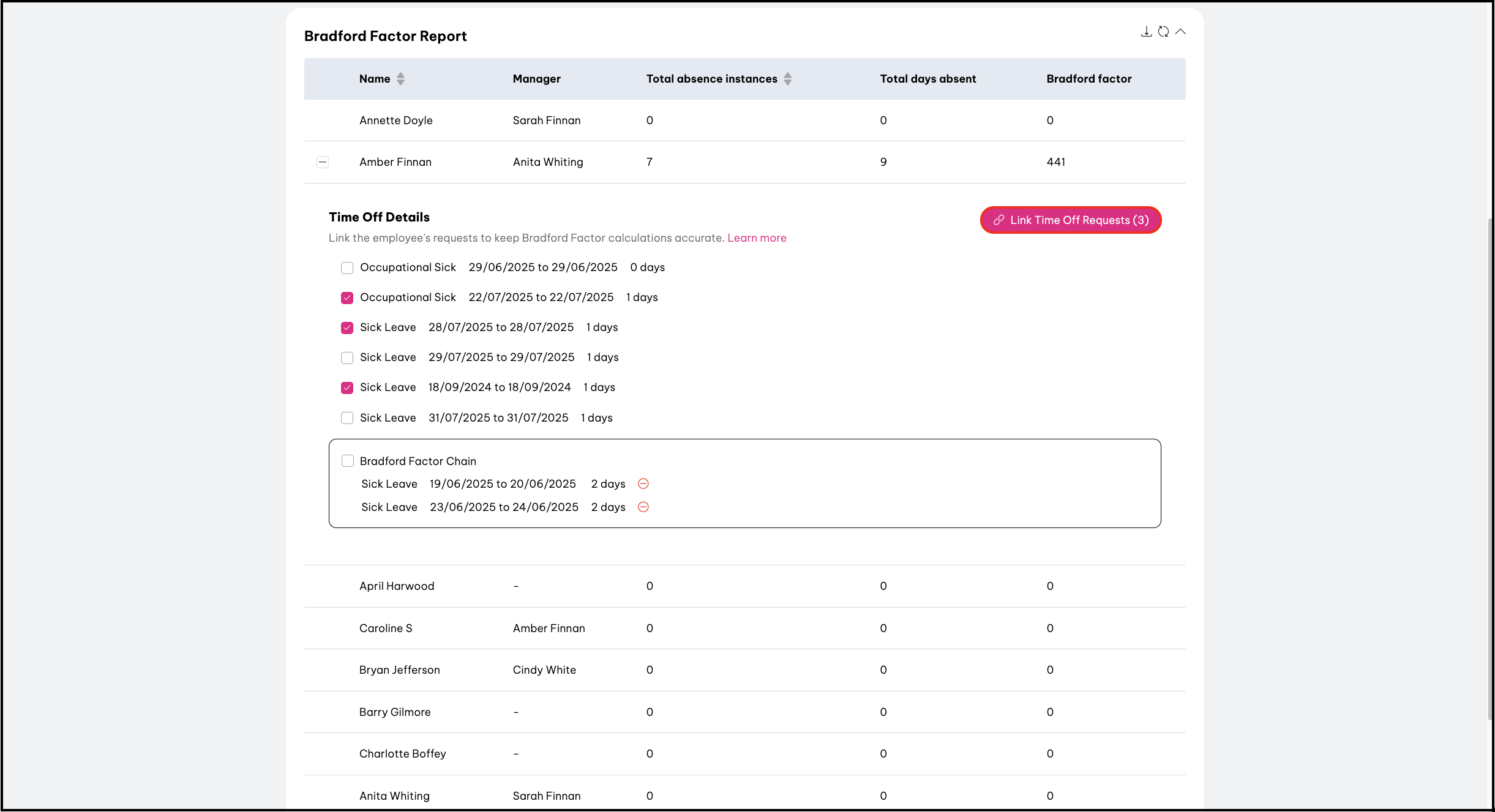 - Linked time off requests will then be displayed as a Bradford Factor Chain and counted as one instance for Bradford Factor Calculations.