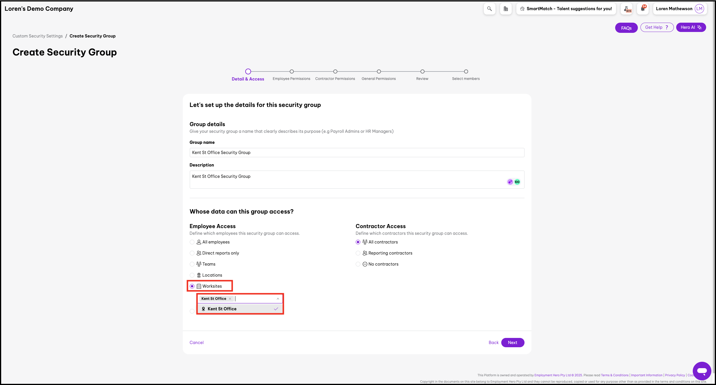 Under the Employee Access subheading, select Work Sites, and choose the work site from the drop-down menu.