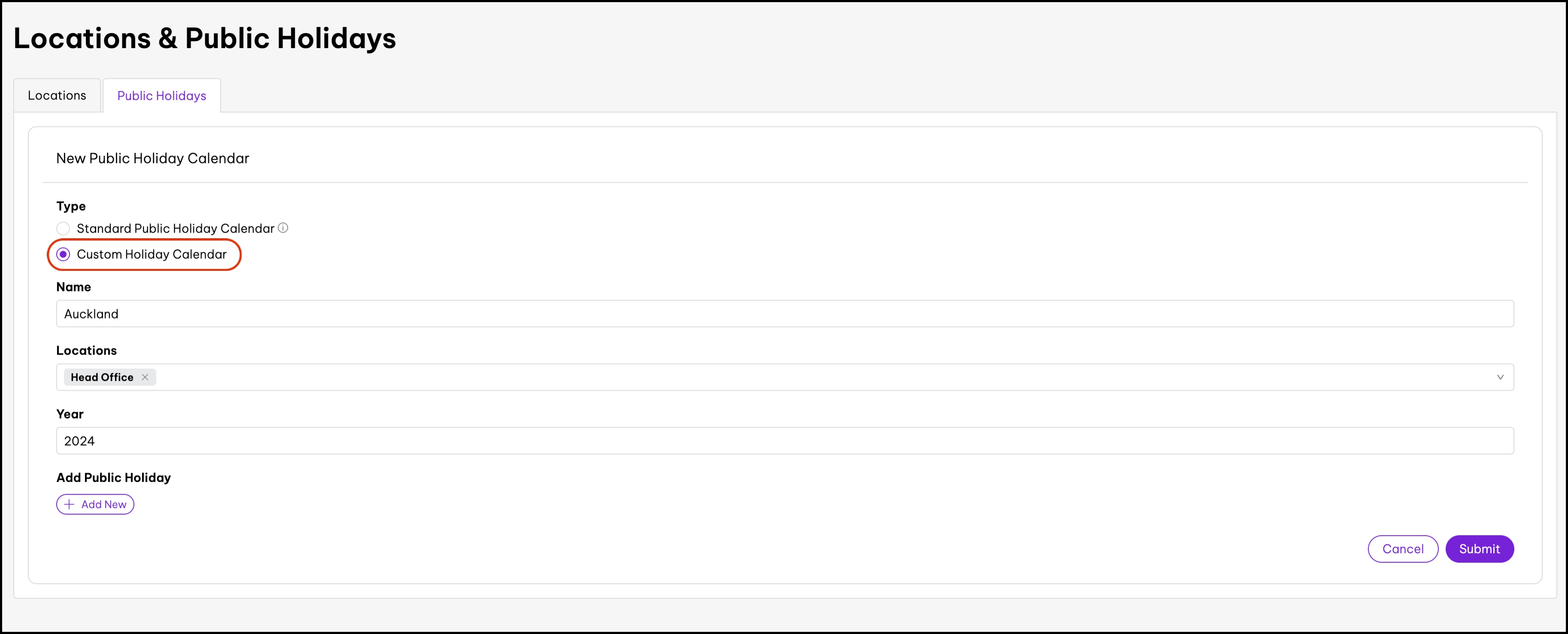At this stage, only the Standard Public Holiday Calendars for your organisation's original country use on your platform are available. For example, if you set up your original country as Australia, you will only be able to access the Australian standard public holiday calendar. This remains the case even if you later add a New Zealand country location to your platform.