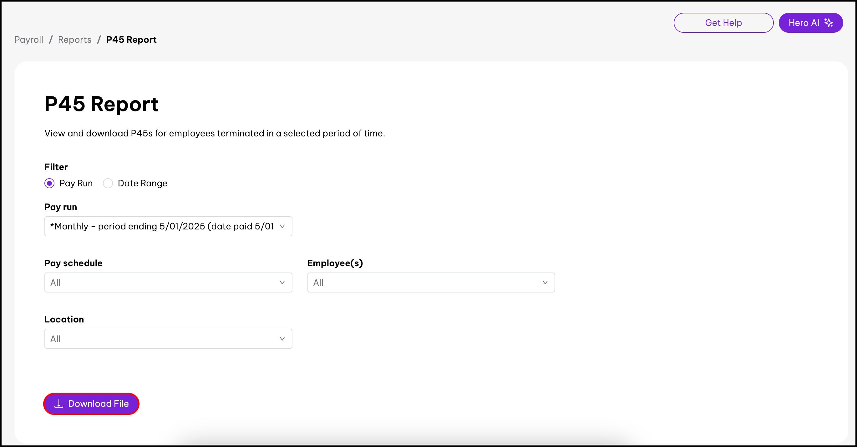 The P45 Report lets you view and download P45s for employees terminated within a certain period.