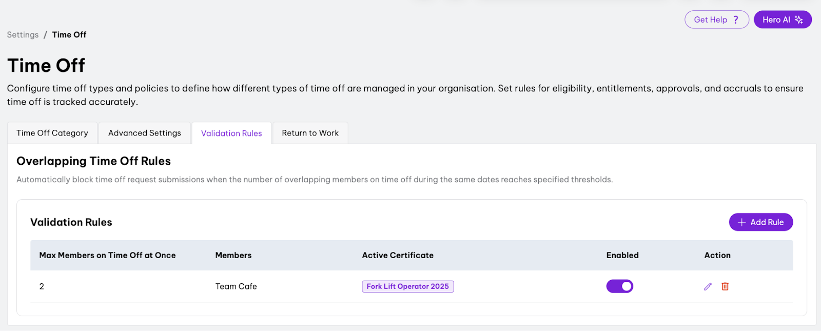 The Overlapping Time Off Rules feature allows admins to configure rules that limit the maximum number of employees who can be on time off at the same time. This helps ensure teams remain adequately staffed while time off requests are being submitted.