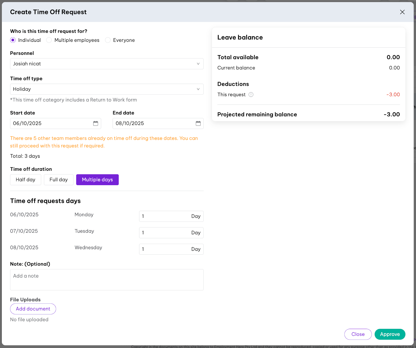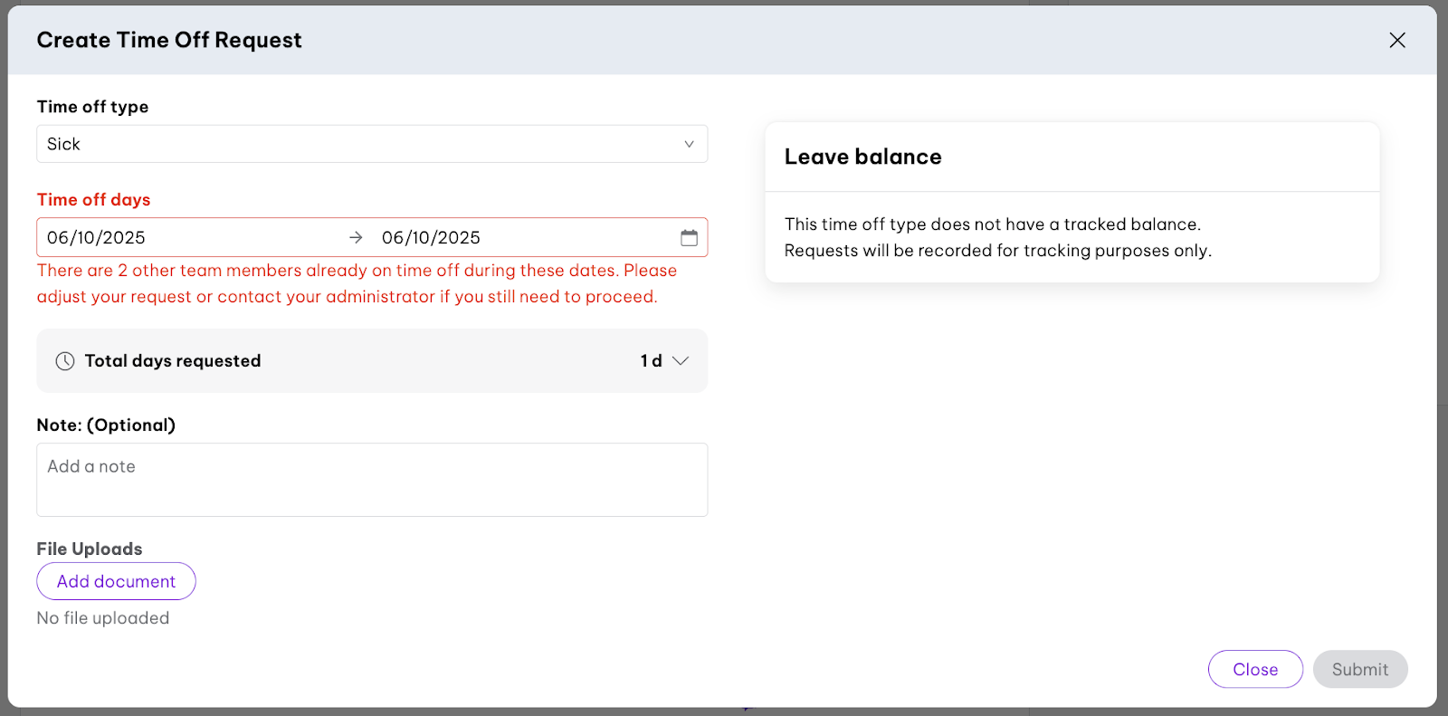 When an admin or employees with the permission access submits time off that breaches a rule, they'll see: