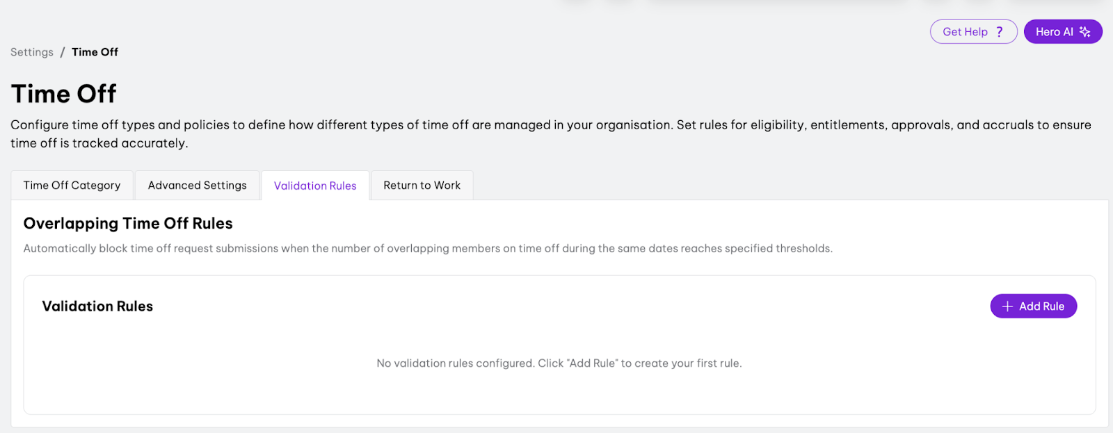 Note: For some organisations, Time Off Settings are managed through payroll. In these cases, the feature will be available directly in the Settings page named "Time Off Restrictions".