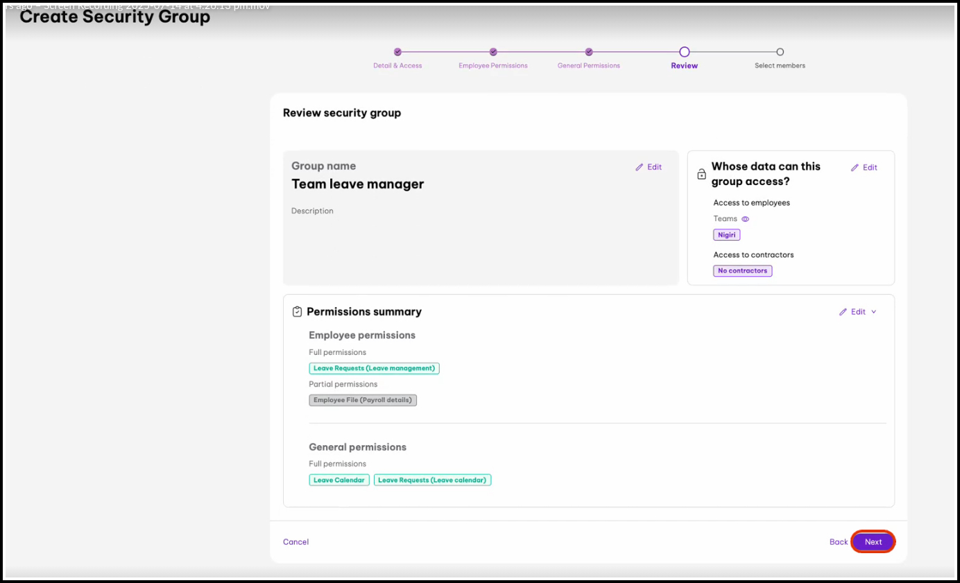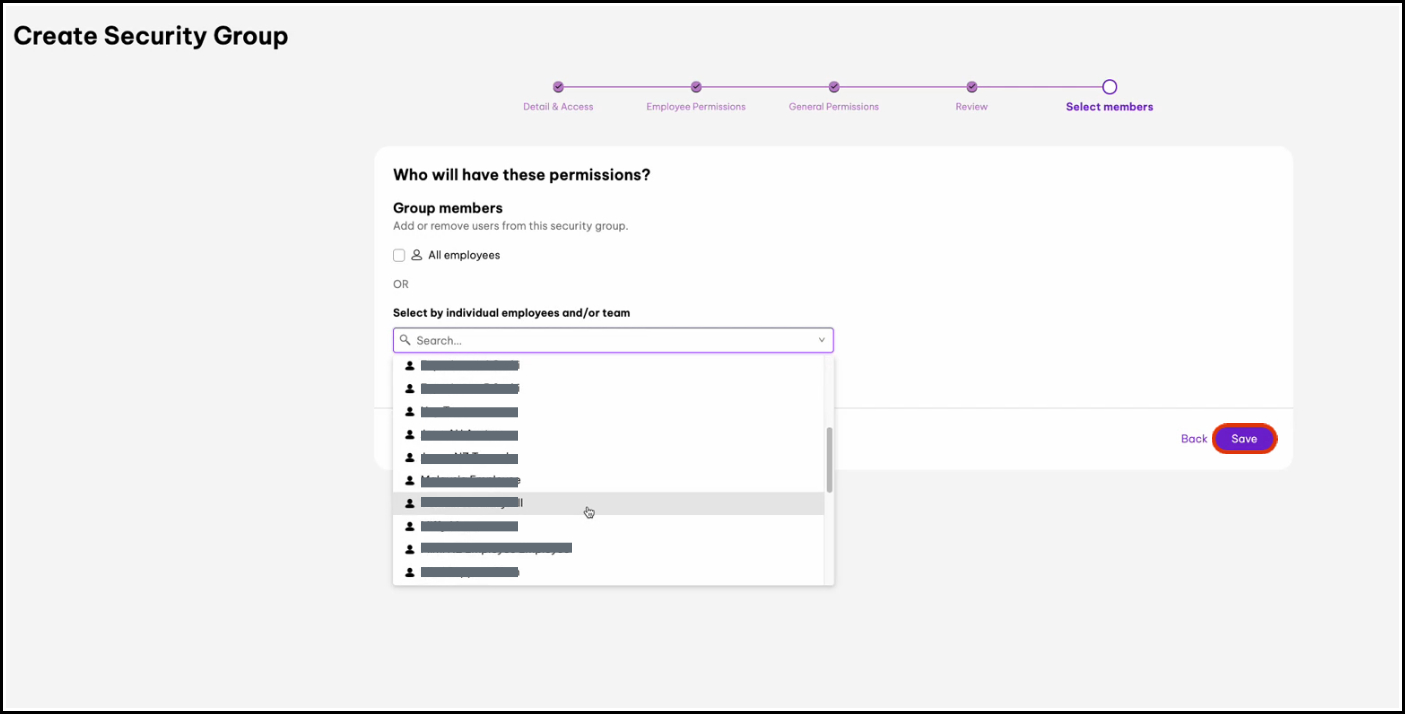 - Select Members: Choose which users will be assigned to this permissions group. You can search for specific employees by name.