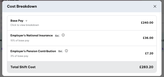 Employer costs allow you to see additional labour costs, such as Employer’s National Insurance (NI) and pension contributions, on top of base pay when reviewing shifts in the rota. These costs help provide a more complete view of staffing spend for budgeting and planning purposes. These employer costs are optional and can be turned on or off from the rota settings.