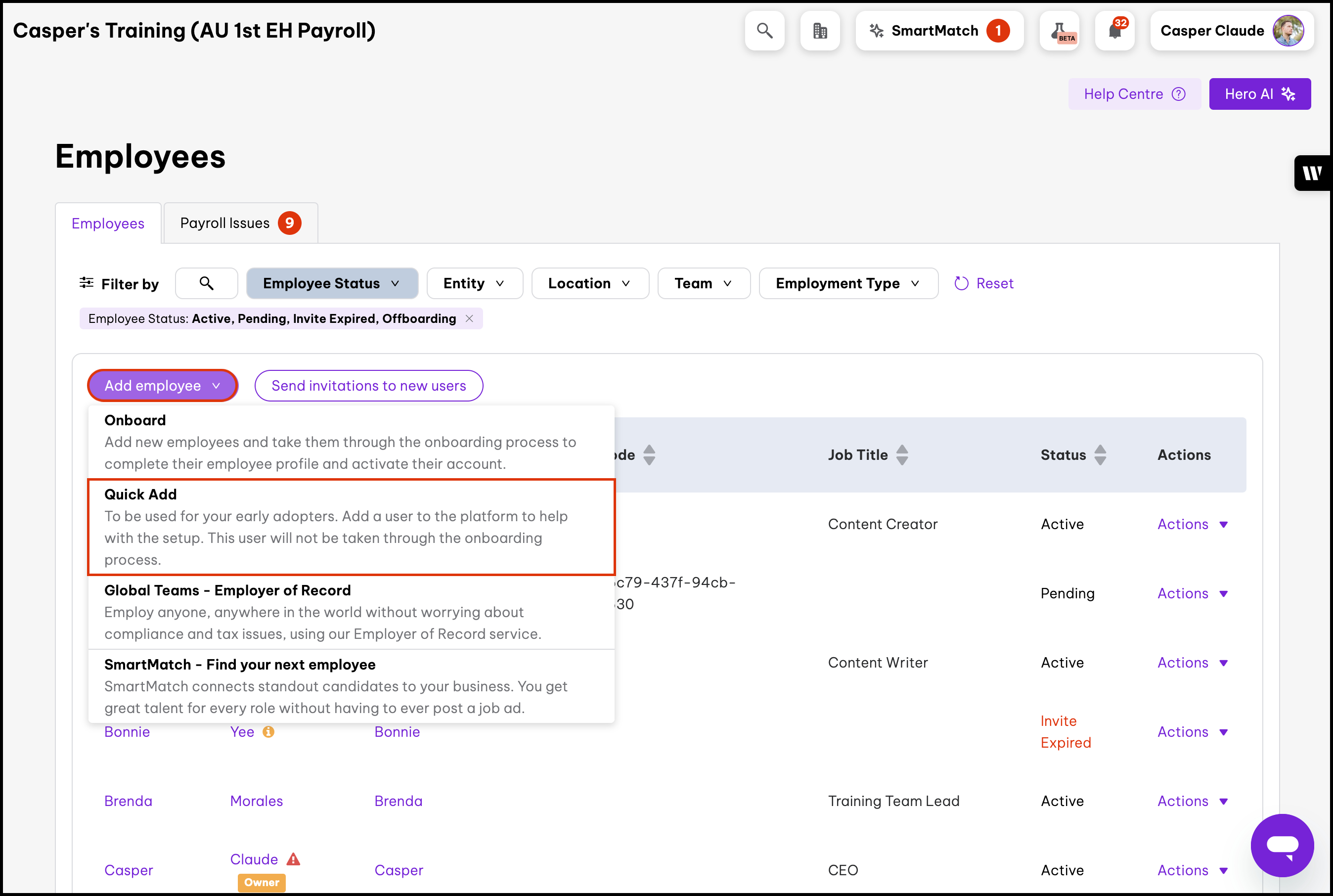 This article explains how to use the Quick Add Employee feature to add a new user to your Employment Hero platform without them having to go through the onboarding process when they first login.
