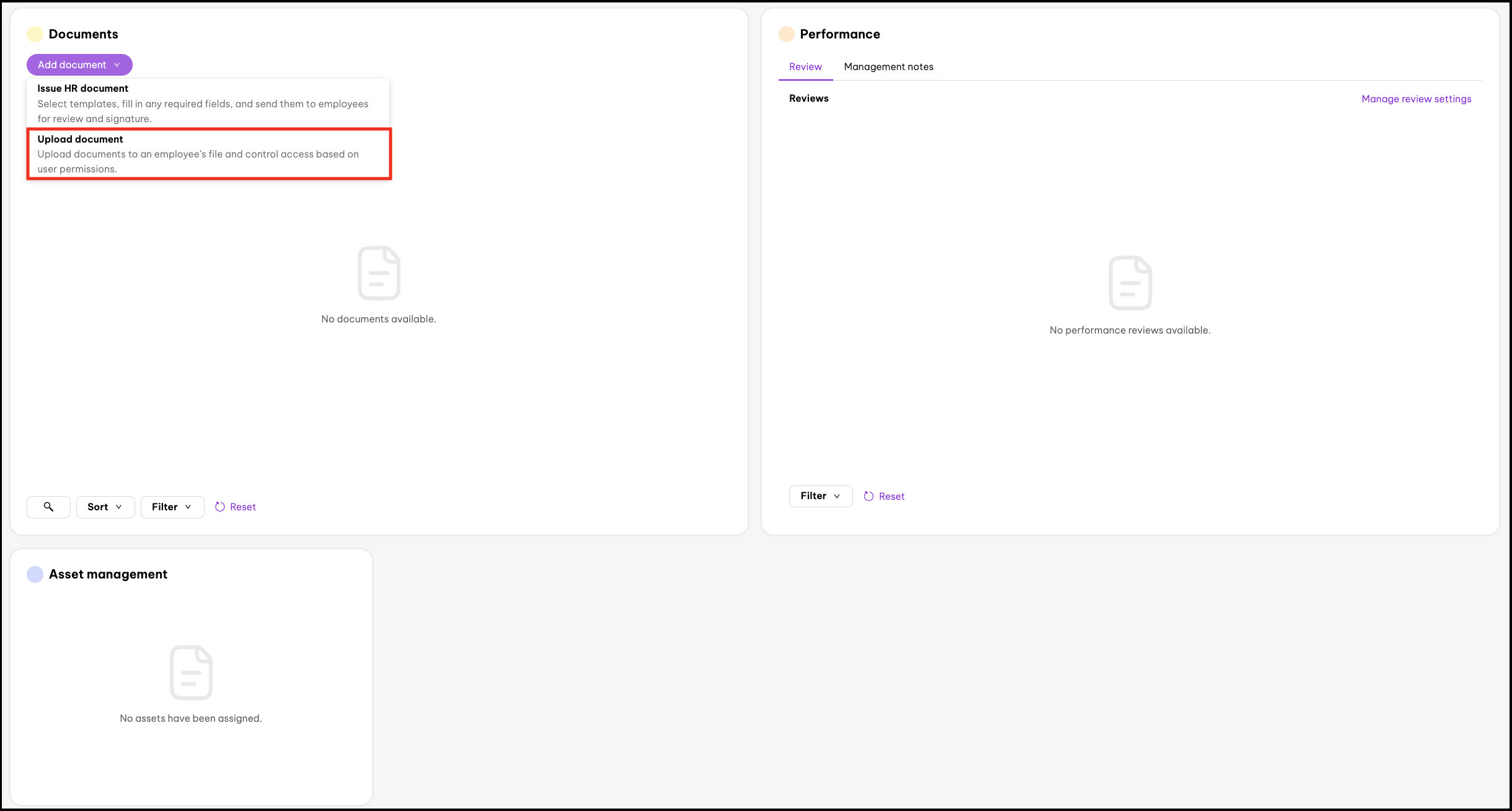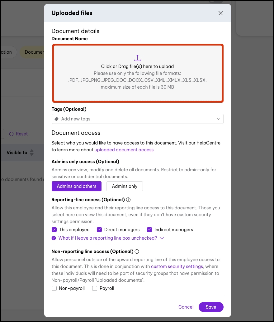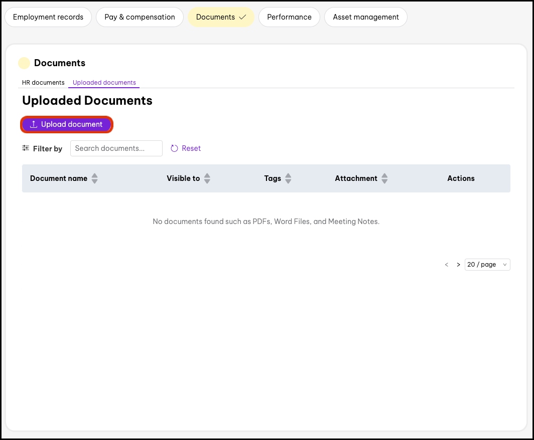 Yes, you can upload documents to your Employment Hero account, as long as your platform admin has granted you permission. If you do not have access, your admin can grant it to you by following this article: How to manage custom user security settings via Employment Hero. Only the employee and admins in the account can see the documents uploaded by the employee.