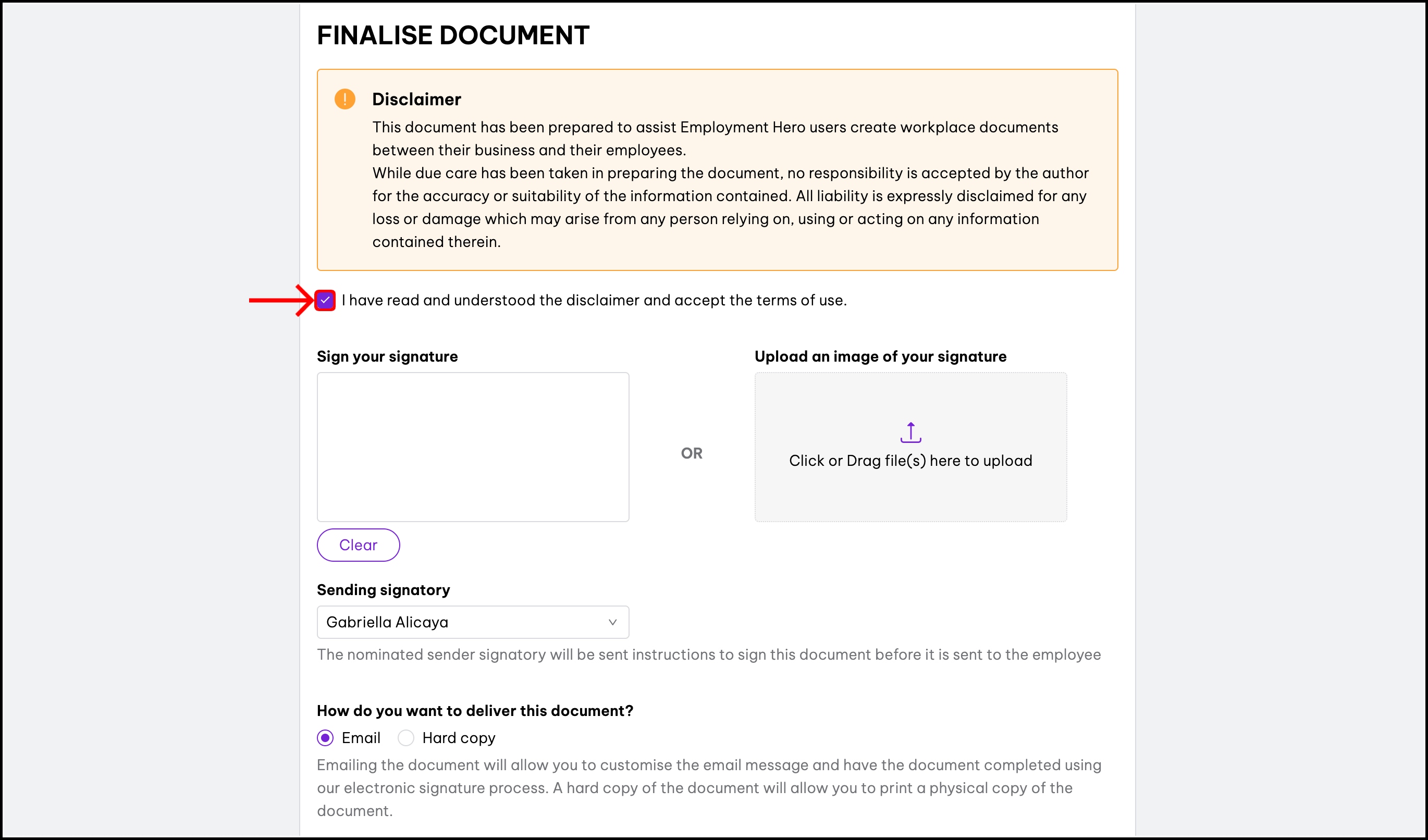 - In the Finalise Document section, click the I have read and understood the disclaimer and accept the terms of use checkbox.