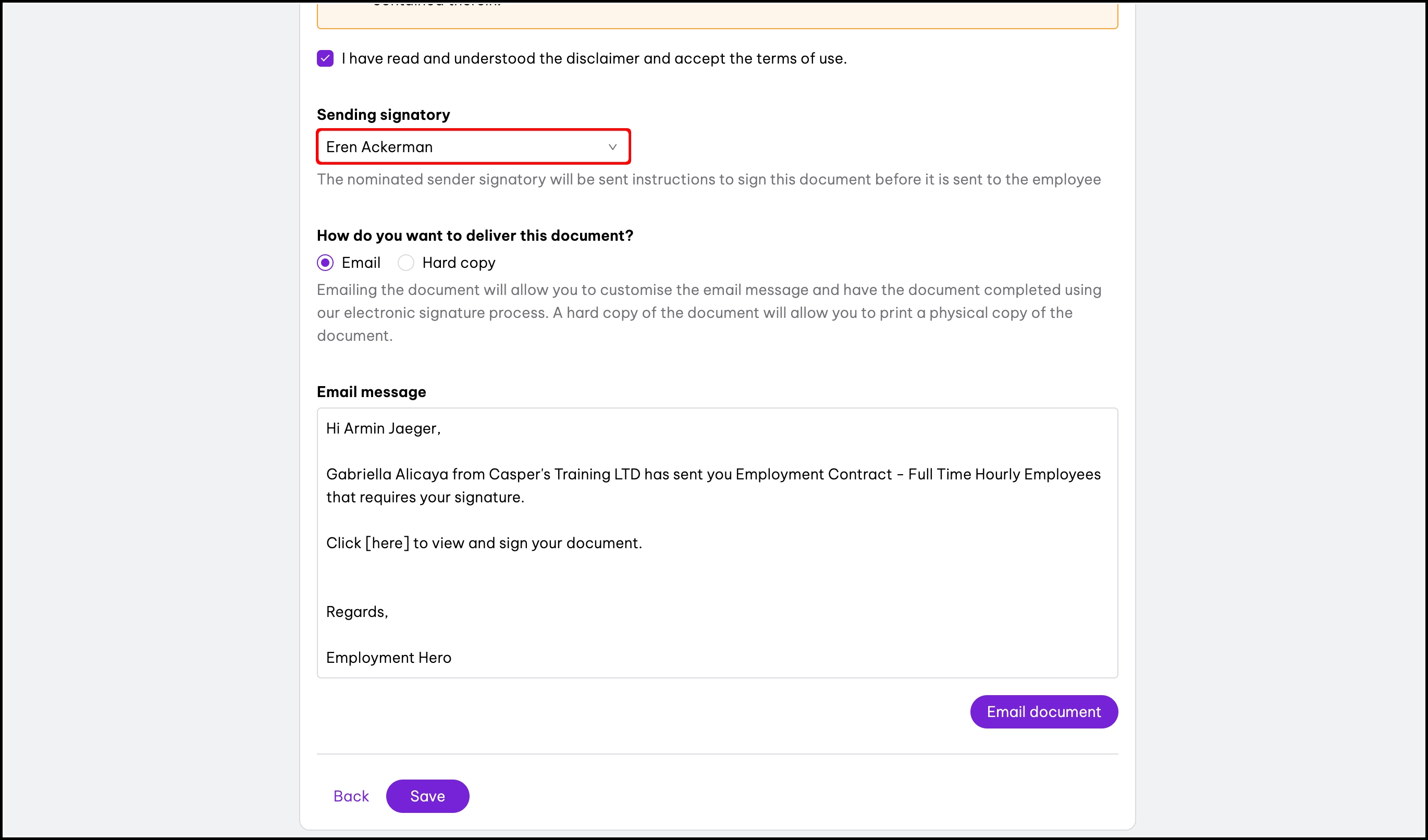 If the document needs signing by another user, i.e., your organisation would prefer managers to sign off on employee contracts rather than the CEO, then you can use the Sending Signatory drop-down to select the desired document signer. If you select another user to sign a contract, the following workflow will occur: