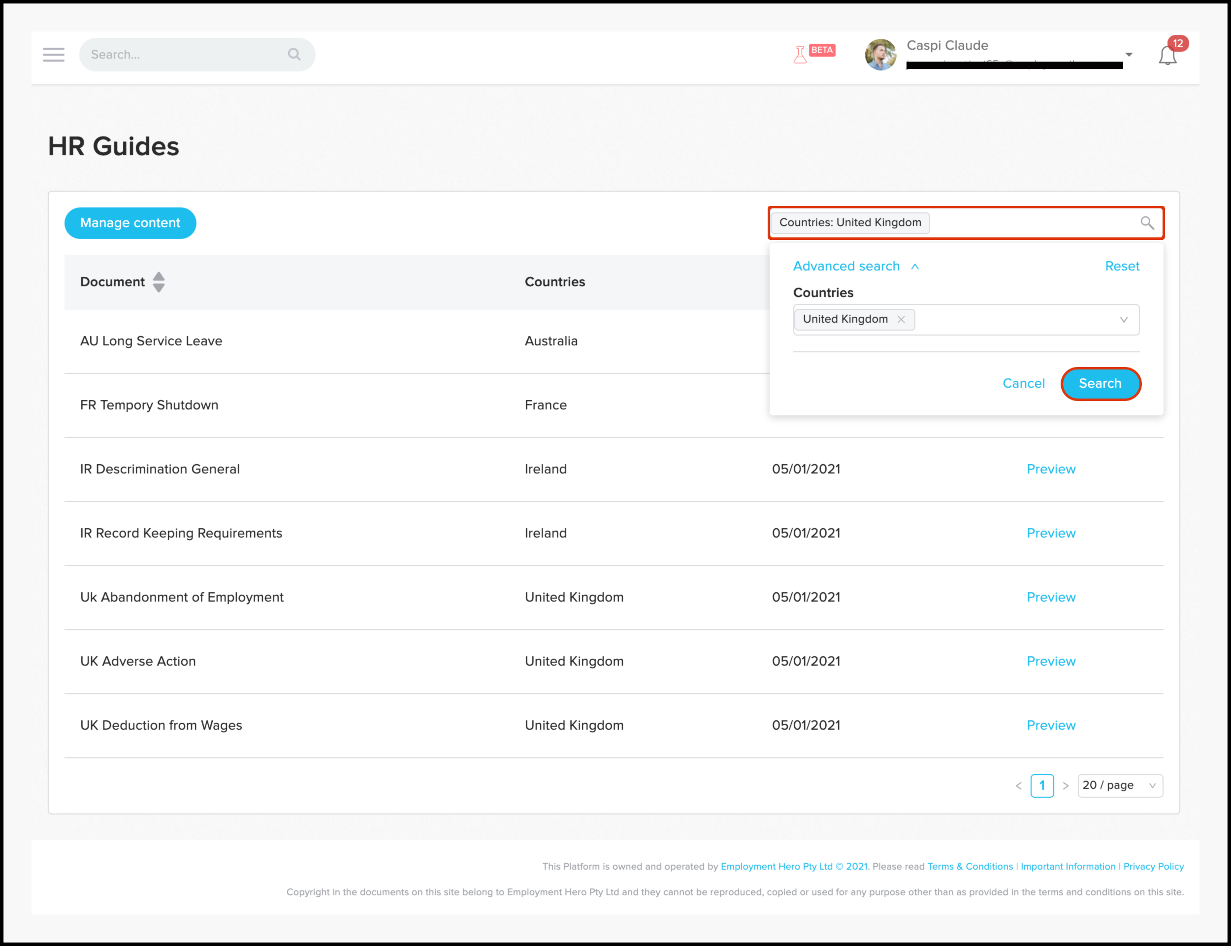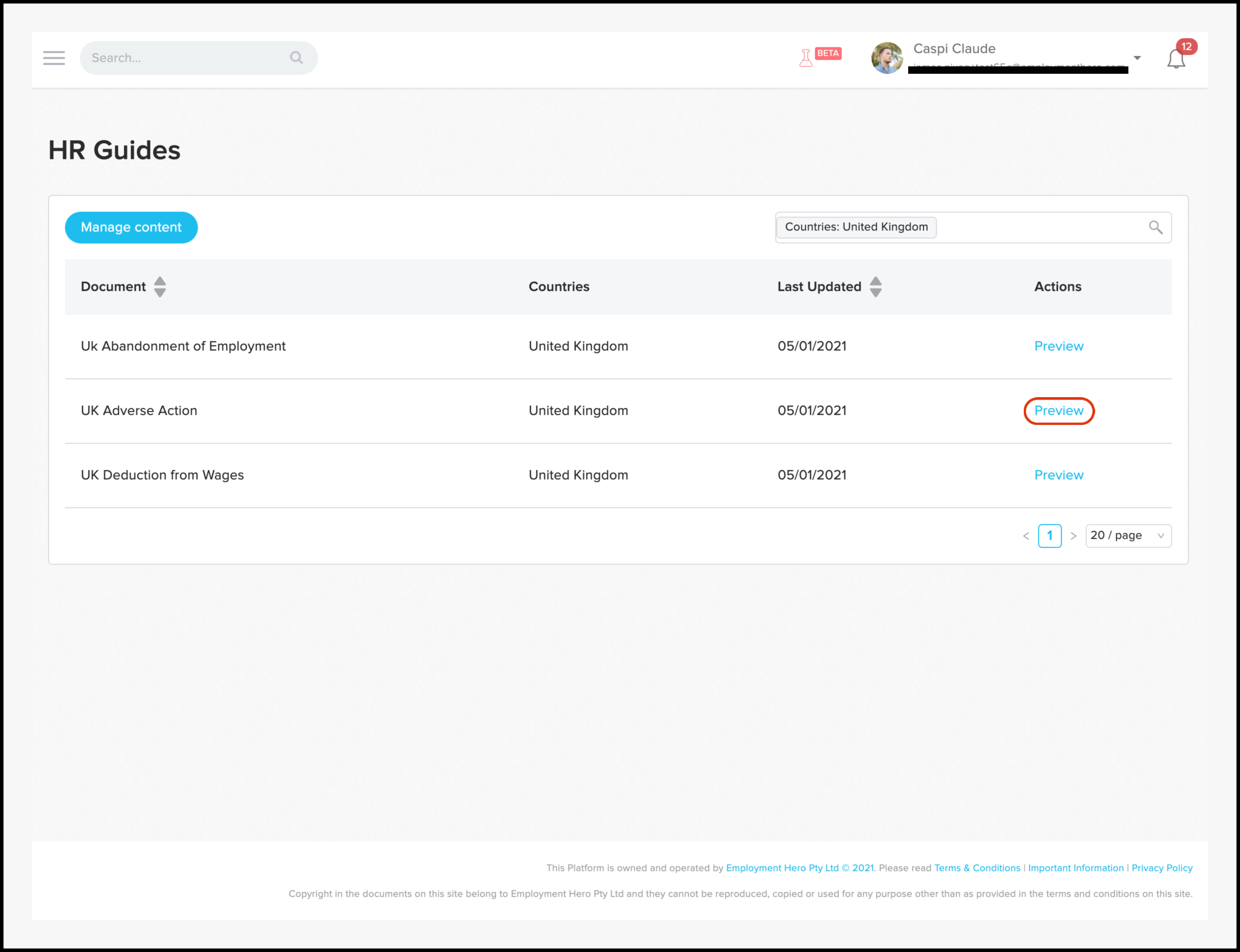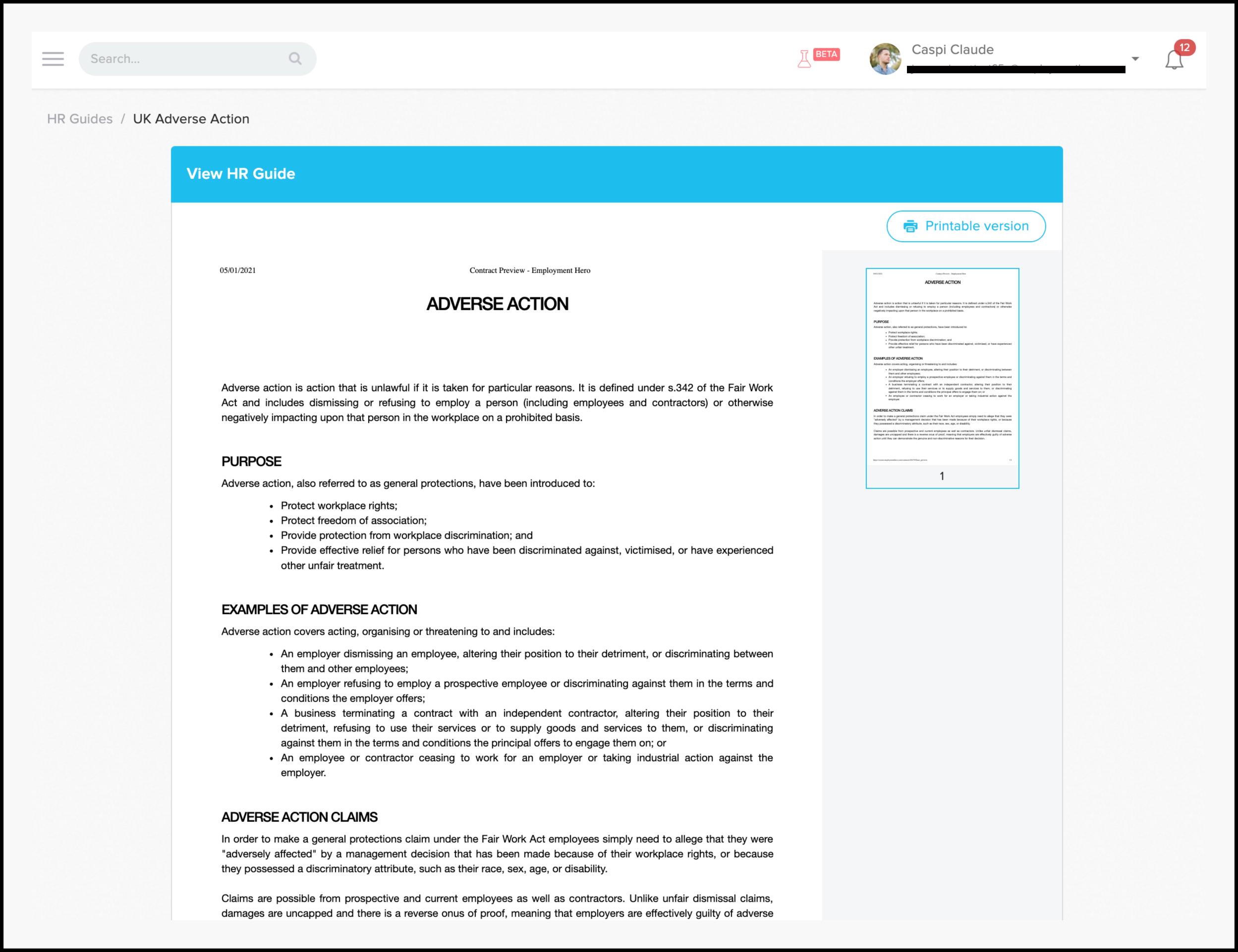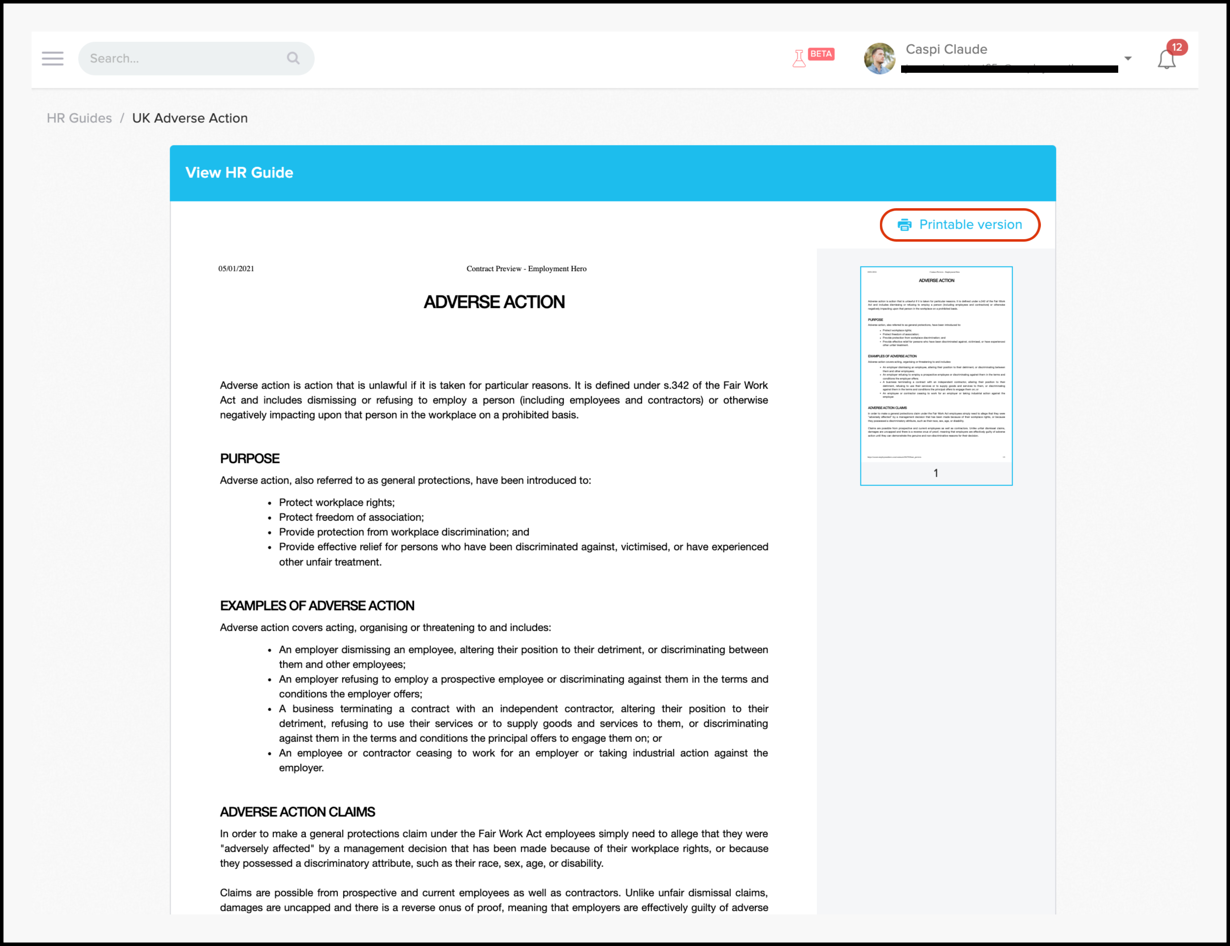 You can use the HR Guides feature to preview a selected document, so you can read the contents on your screen. You can also use this feature to print out a copy of a guide if you need an offline version and filter what information you see on your screen.