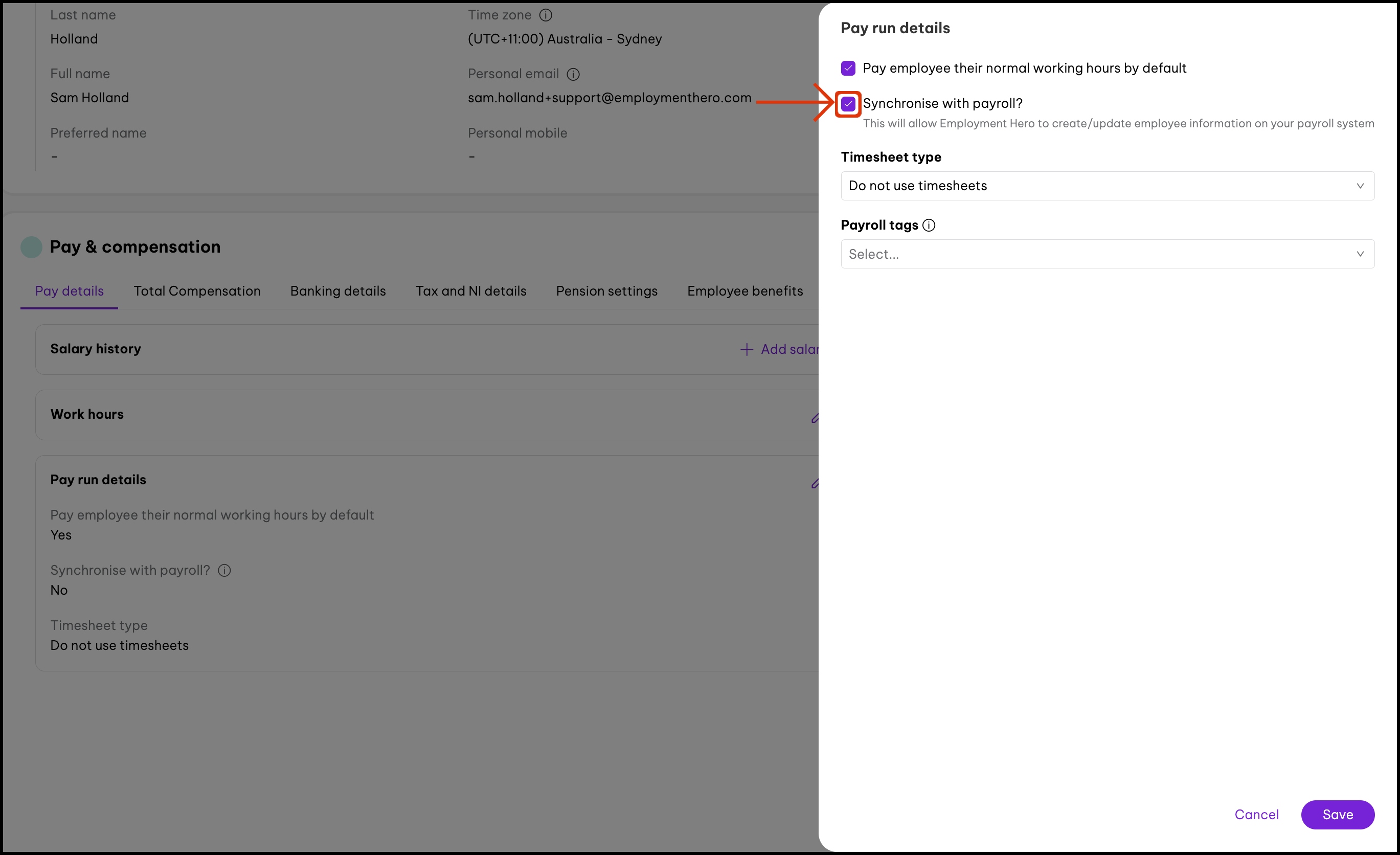 screenshot of employee's profile page, highlighting ticked 'Synchronise with payroll?' checkbox