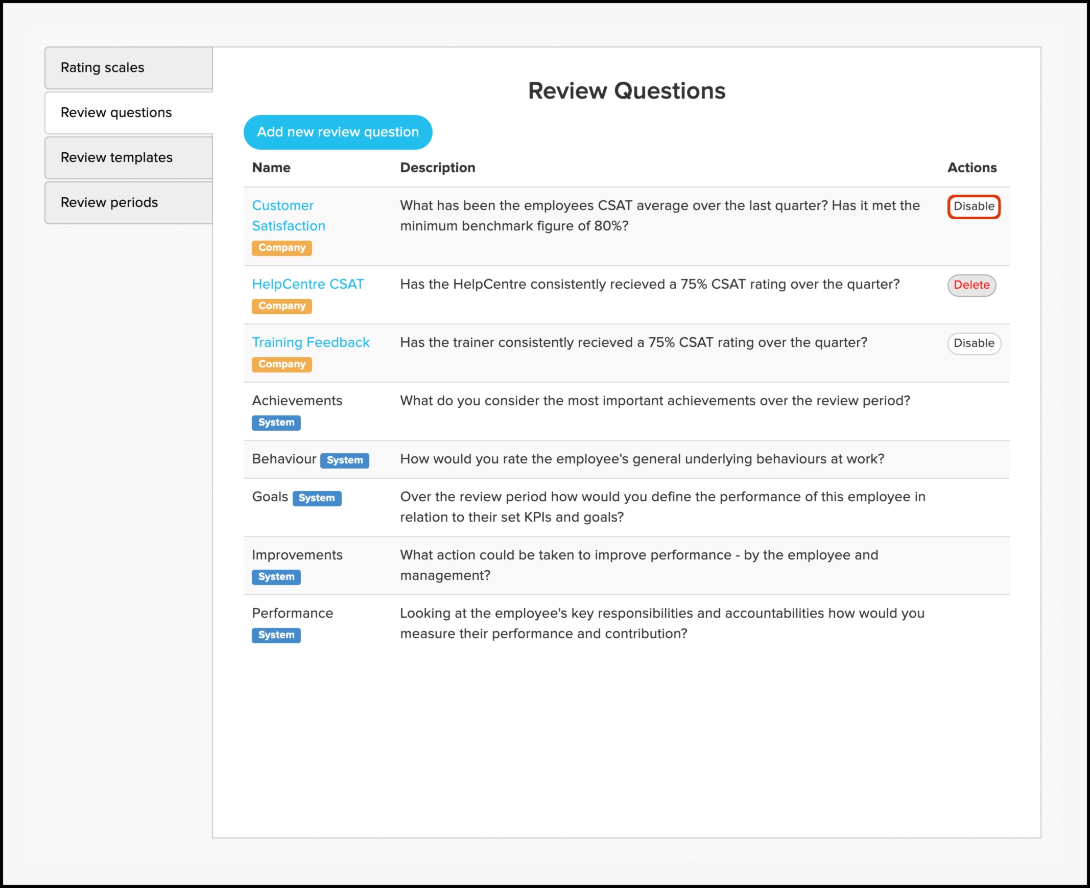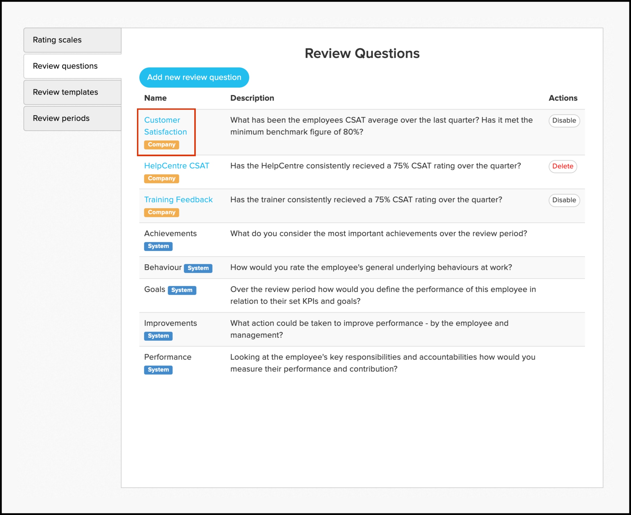 The review questions feature allows you to build your own customisable questions or you can choose from Employment Hero's pre-provided templates. The feature also allows you to edit the information if the contents have changed, or delete the data if it is no longer relevant. Before being able to create review questions, you need to create a rating scale. To read further details on how to create a rating scale, refer to the following article.