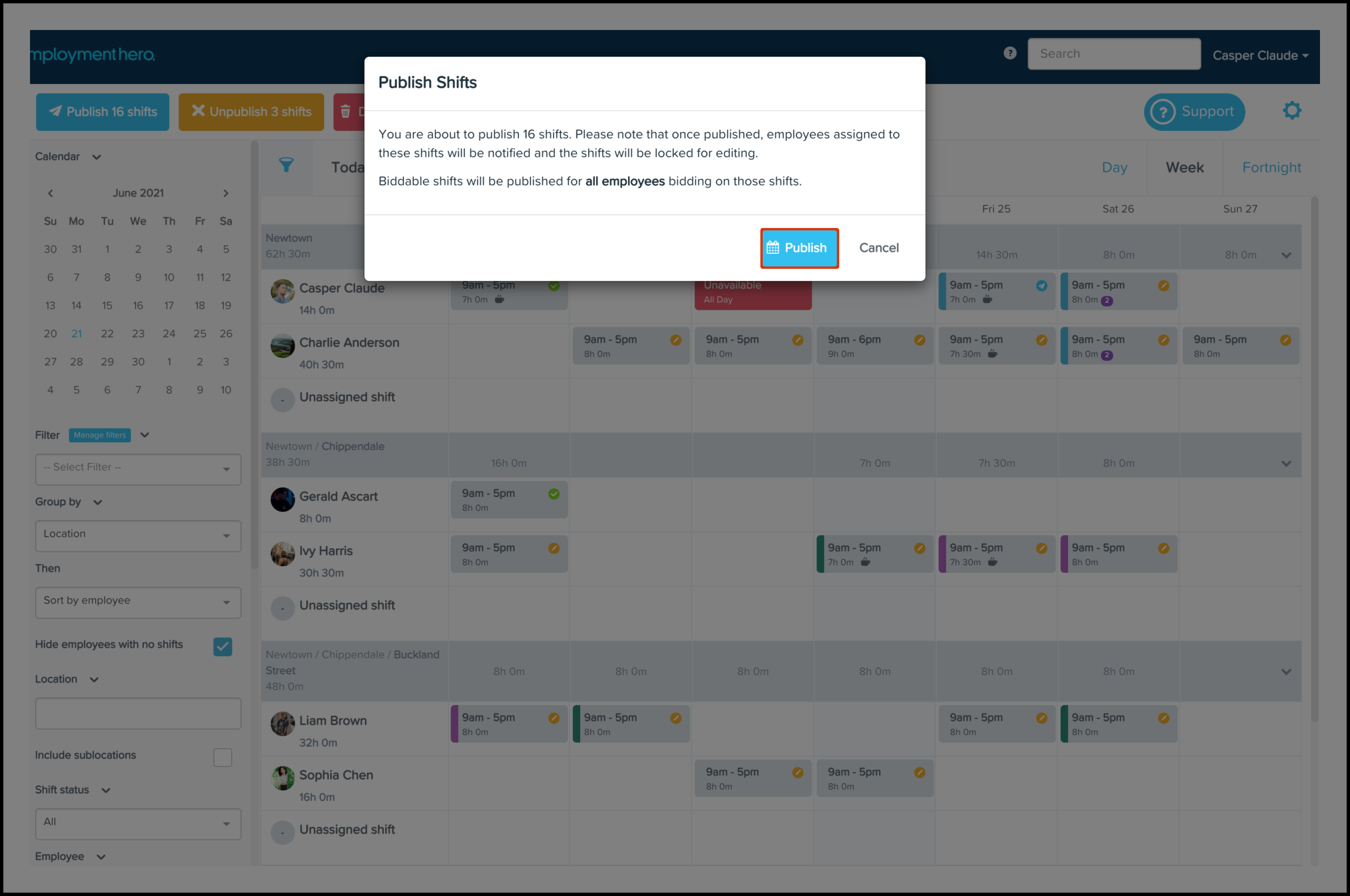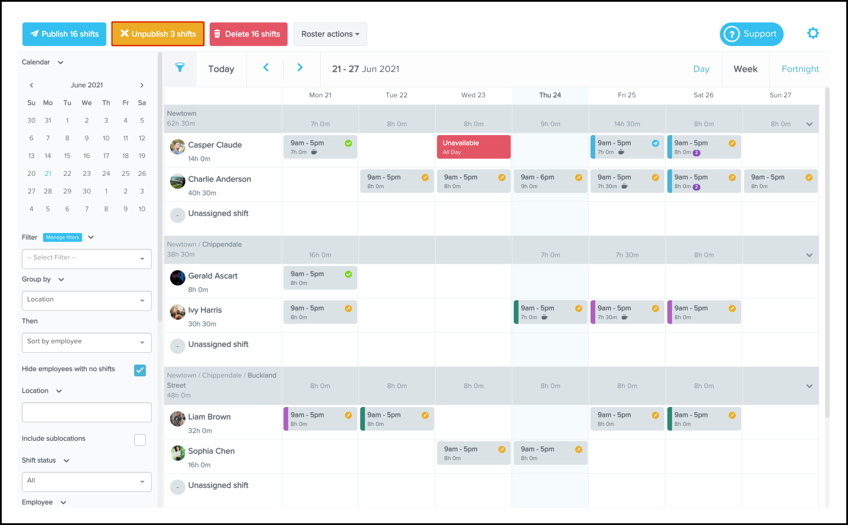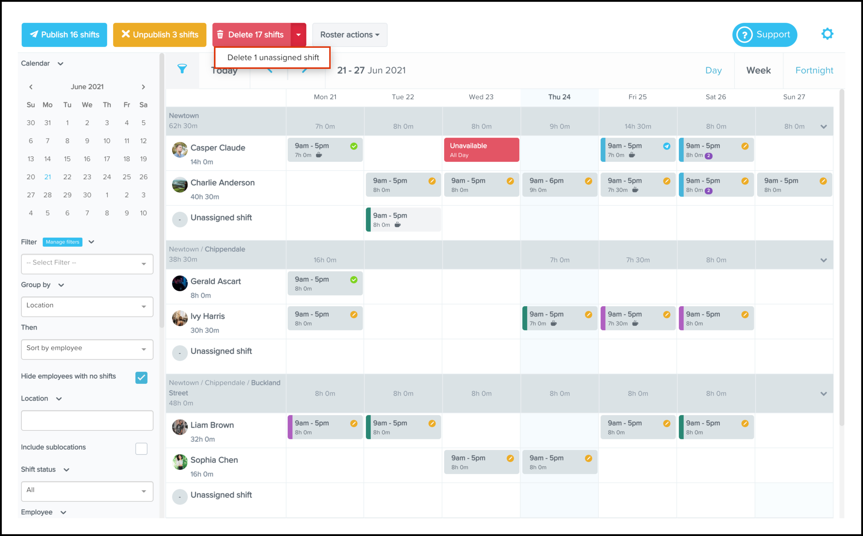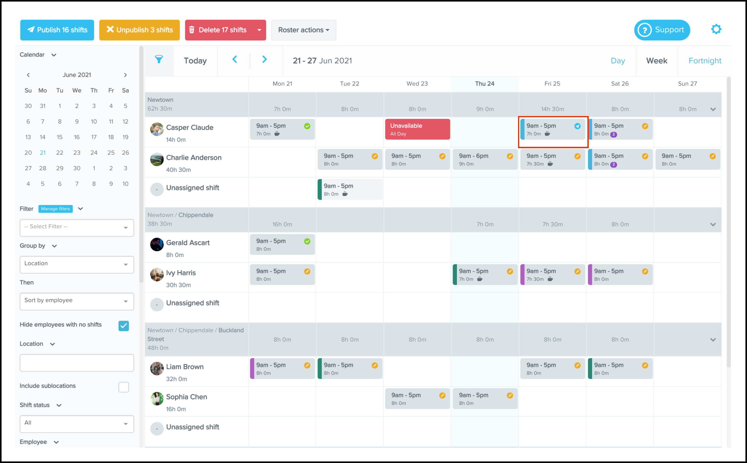 To quickly copy a shift, hold your Shift key, click an existing shift (either published or unpublished), then drag it to the desired day. The copied shift will be unpublished unless or until you decide to publish it.
