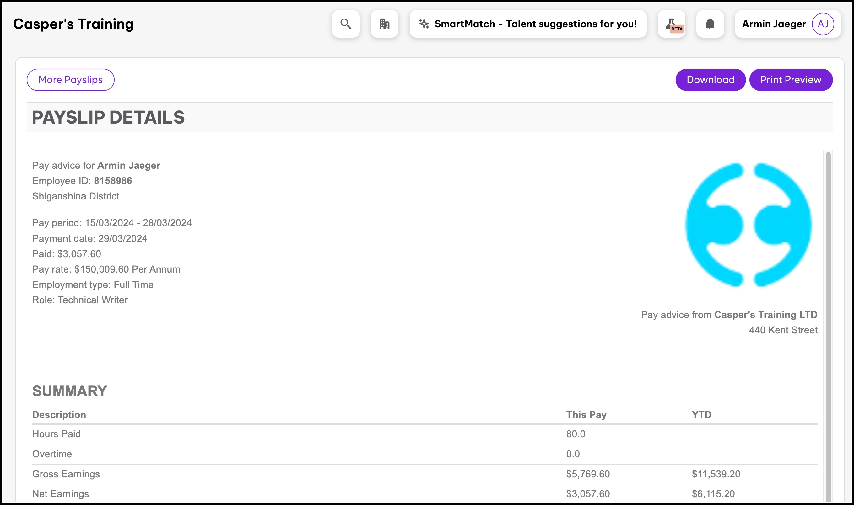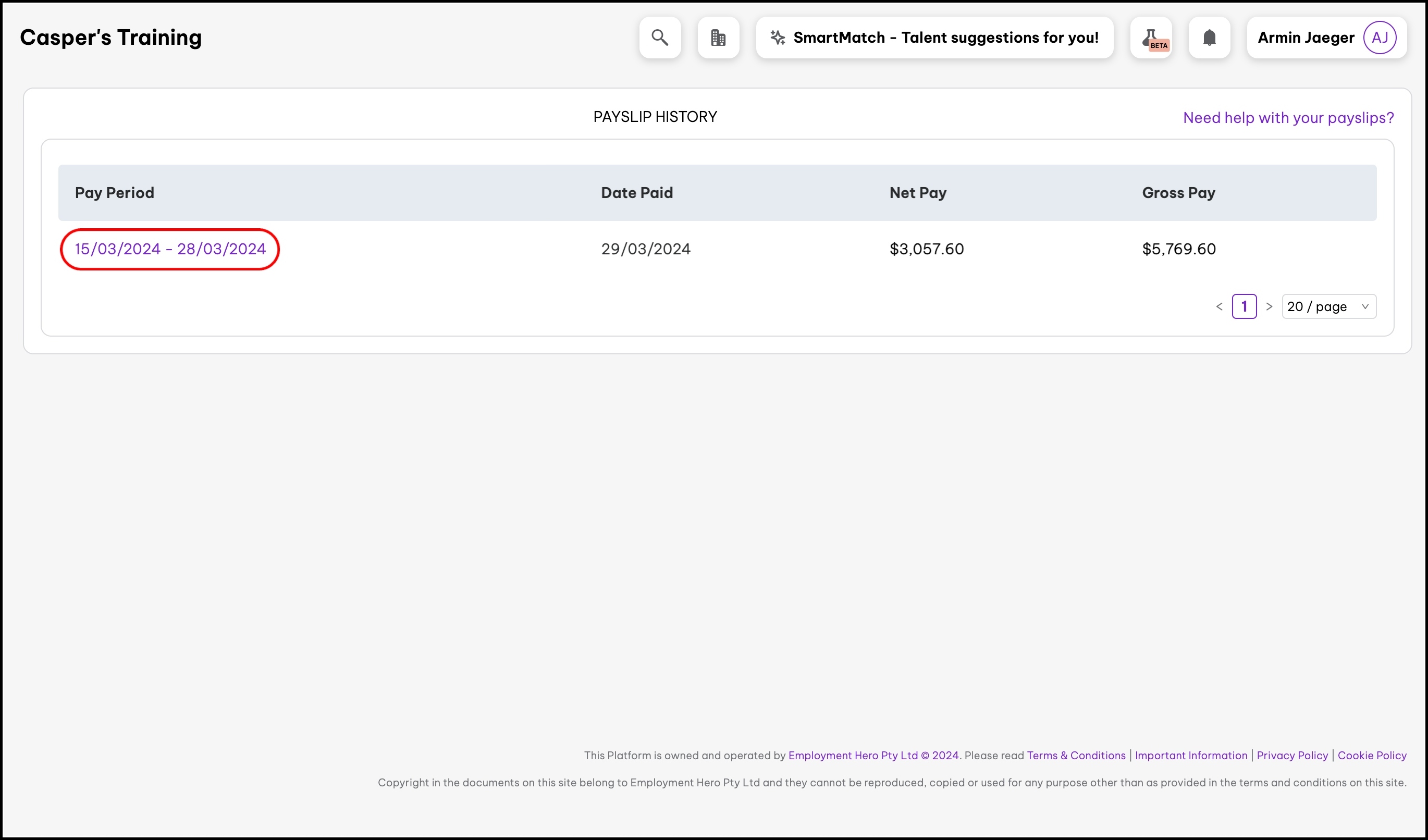 The Pay Slip feature allows you to access digital copies of your pay slips, which you can download to your device. You can also print your pay slips if you need hard copies. You can also view your pay slips on mobile using the Employment Hero Work app. Learn how to do that in this article.