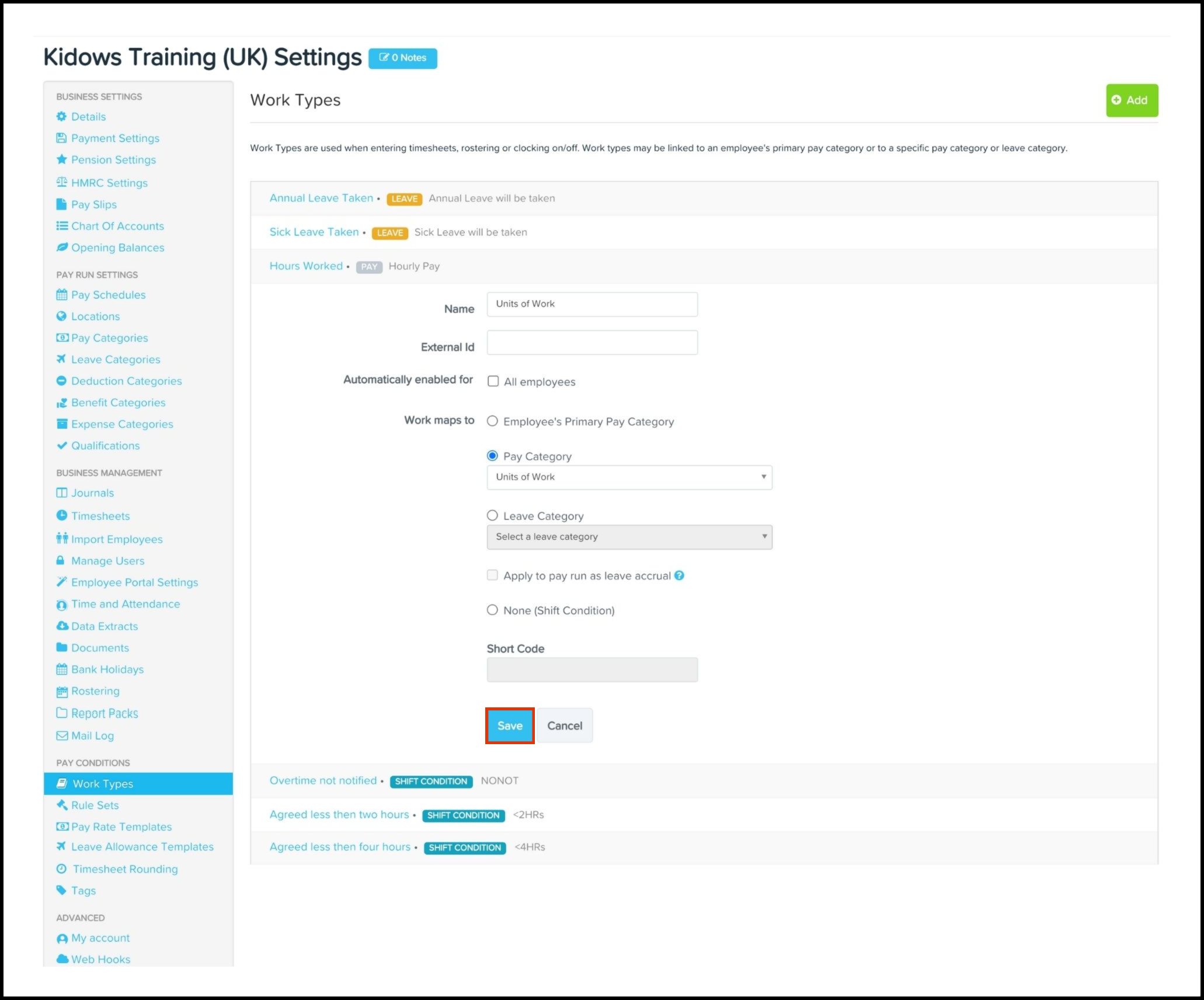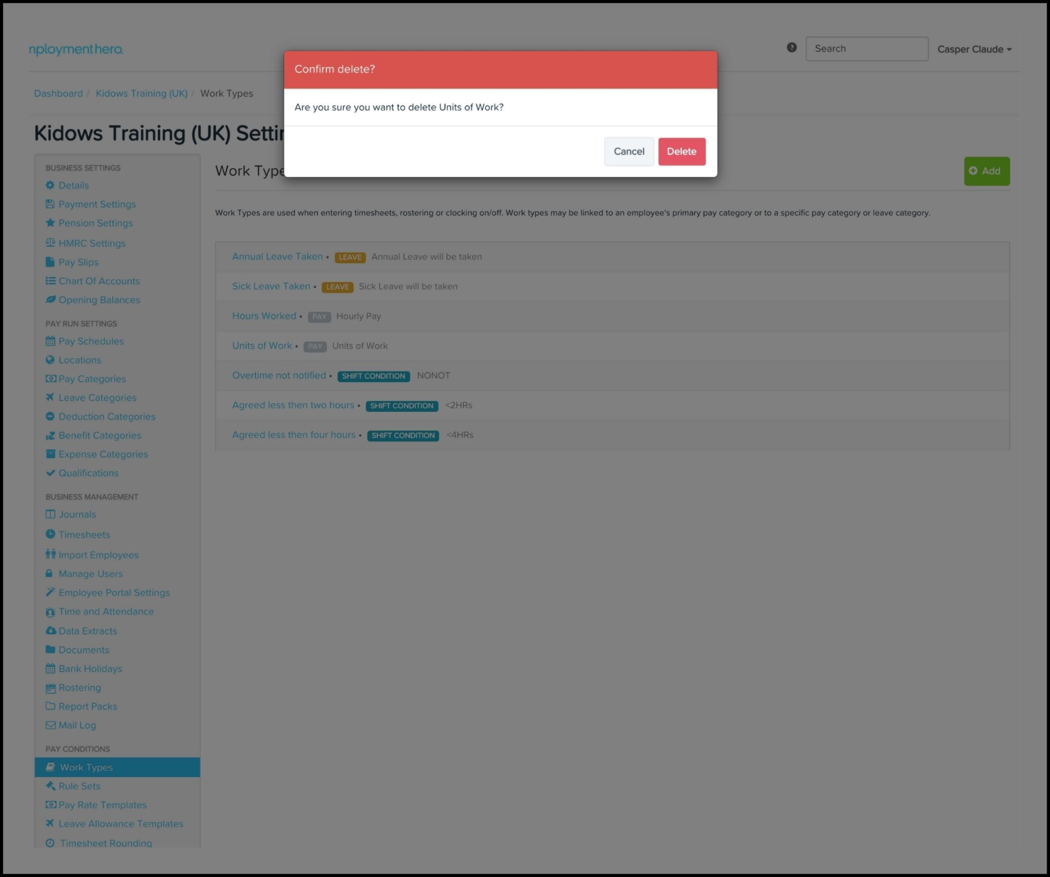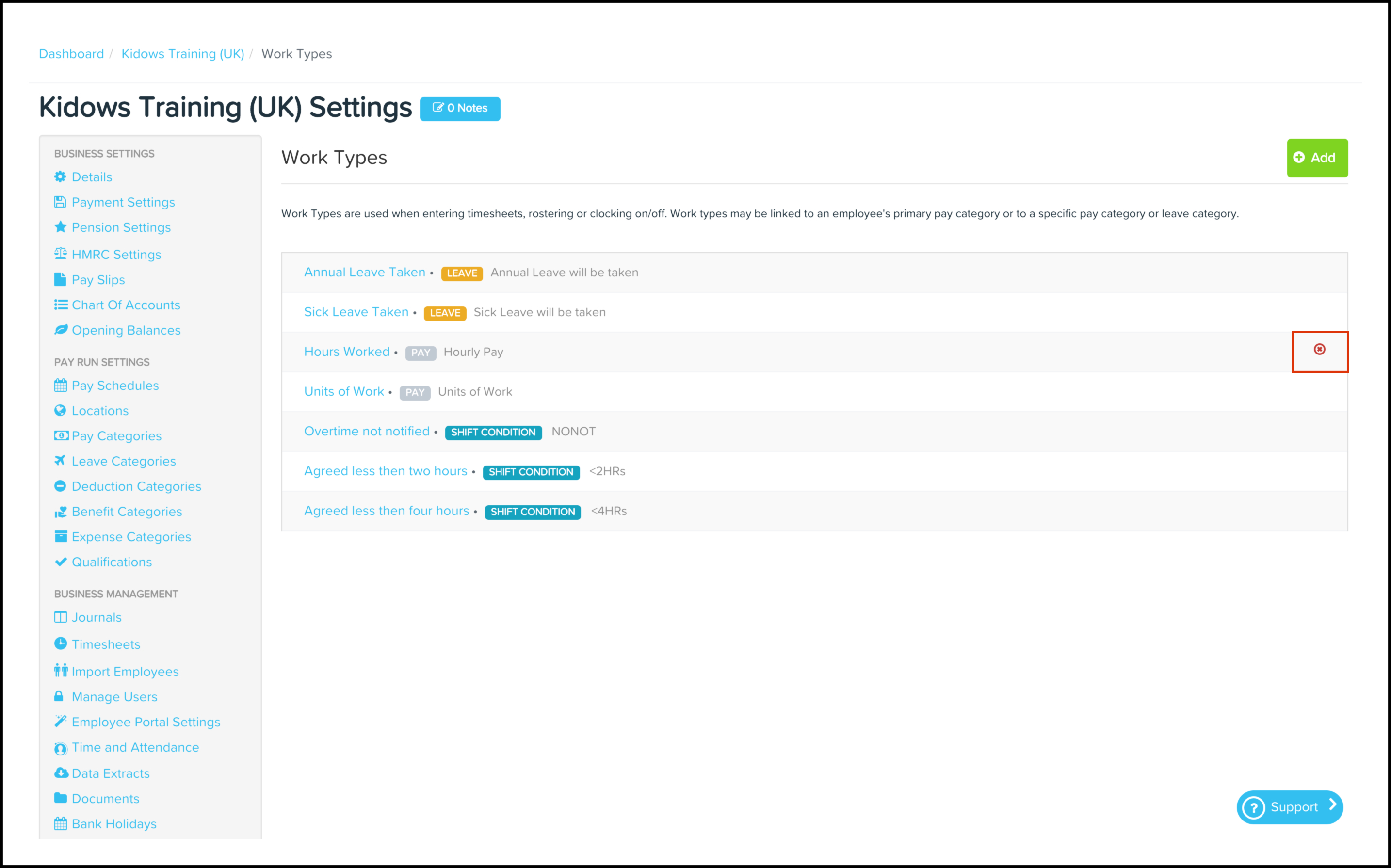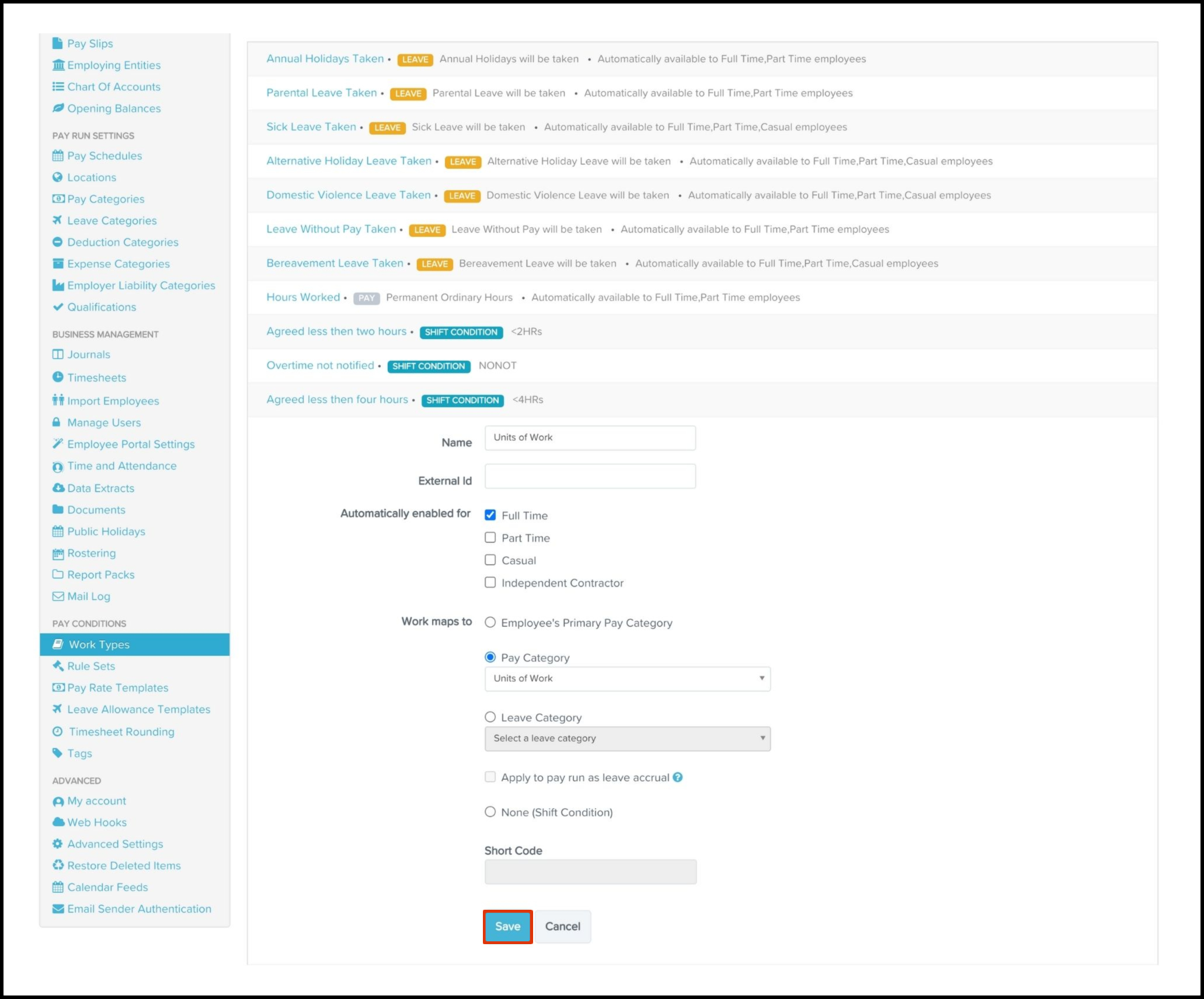 Any changes made to your work types will need to be synced over to your HR platform. To read further details on how to undertake this, refer to this article: How do I update my organisation's work types via the HR platform?