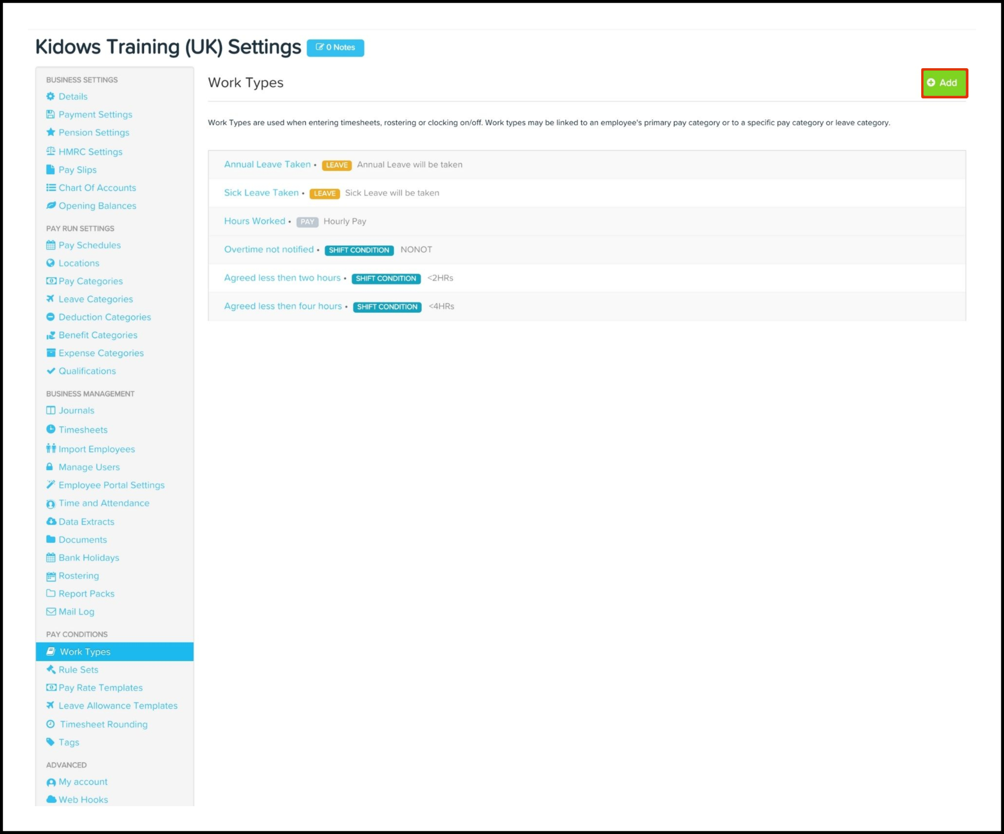 Work types act as a category used to measure where an employee's spent their time working, i.e. an employee can submit a timesheet against a KM Travelled work type. This allows your organisation to track, measure and report on where your employees are working and gain a detailed breakdown of this information to use when processing employee timesheets in a pay run.