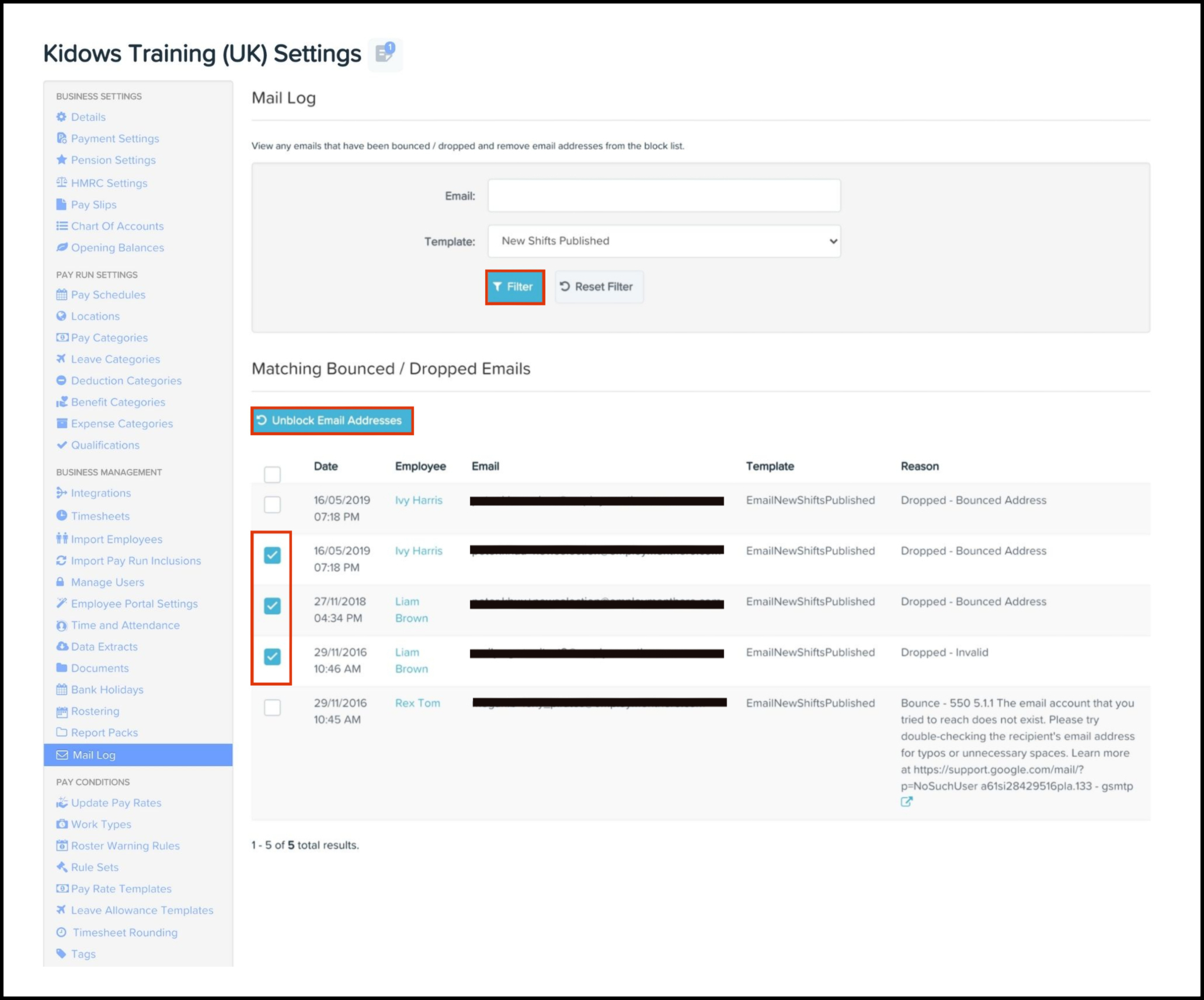 If an employee notifies you they have not received emails from the payroll classic platform, you can use the Mail Log feature to see if any emails have bounced and/or dropped. If there are emails that have bounced and/or dropped, there is an Unblock feature you can use to resend the email to the employee.