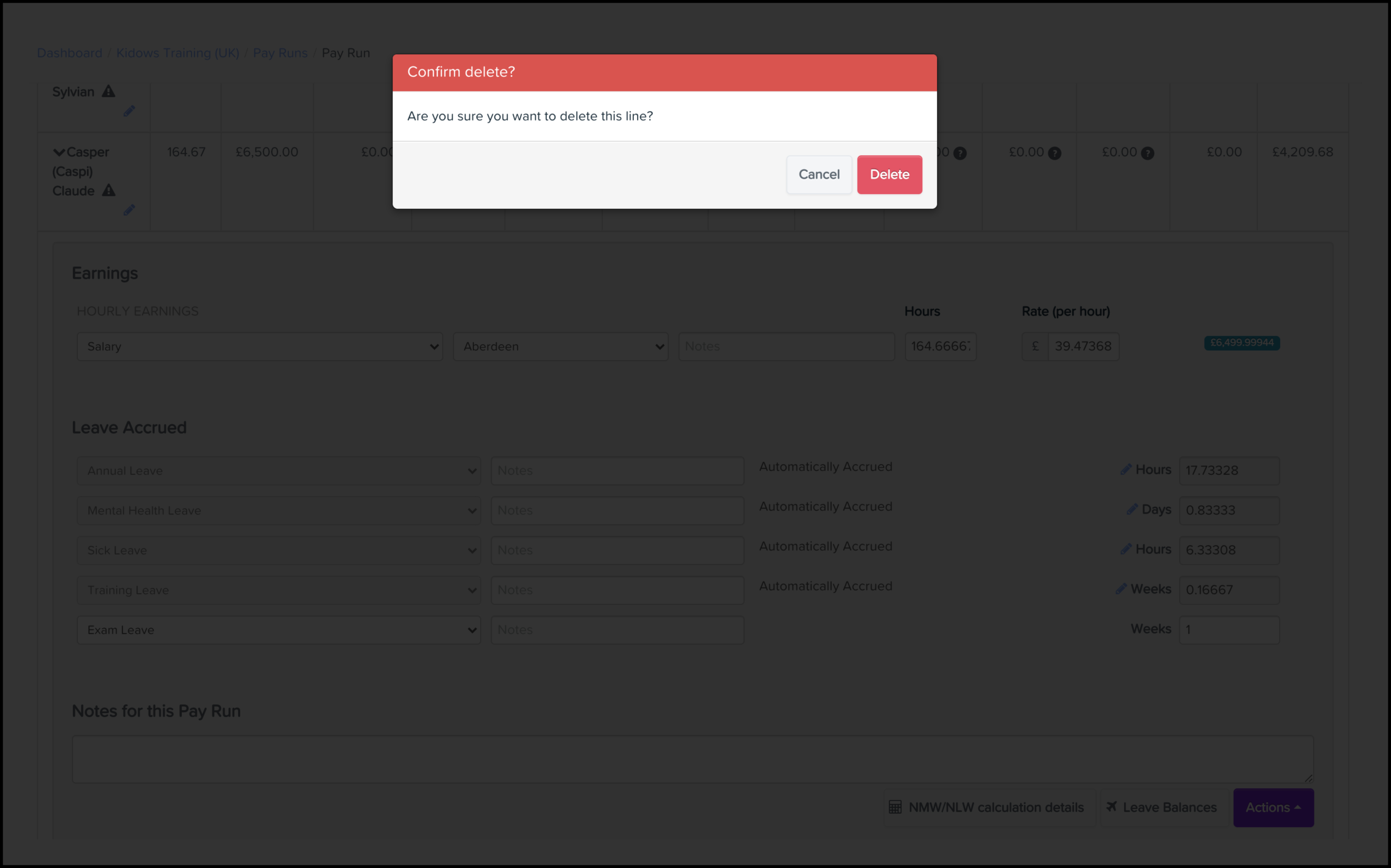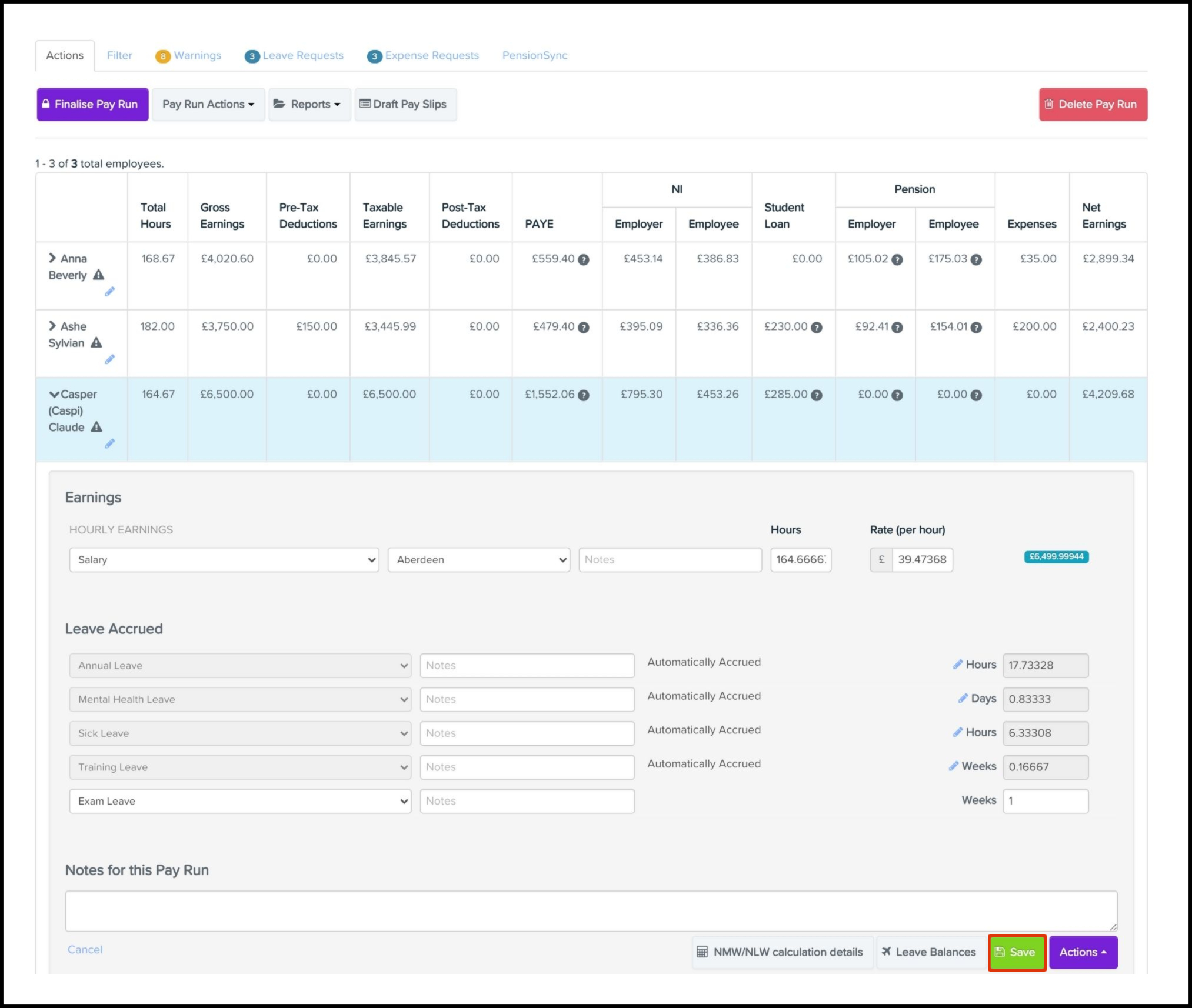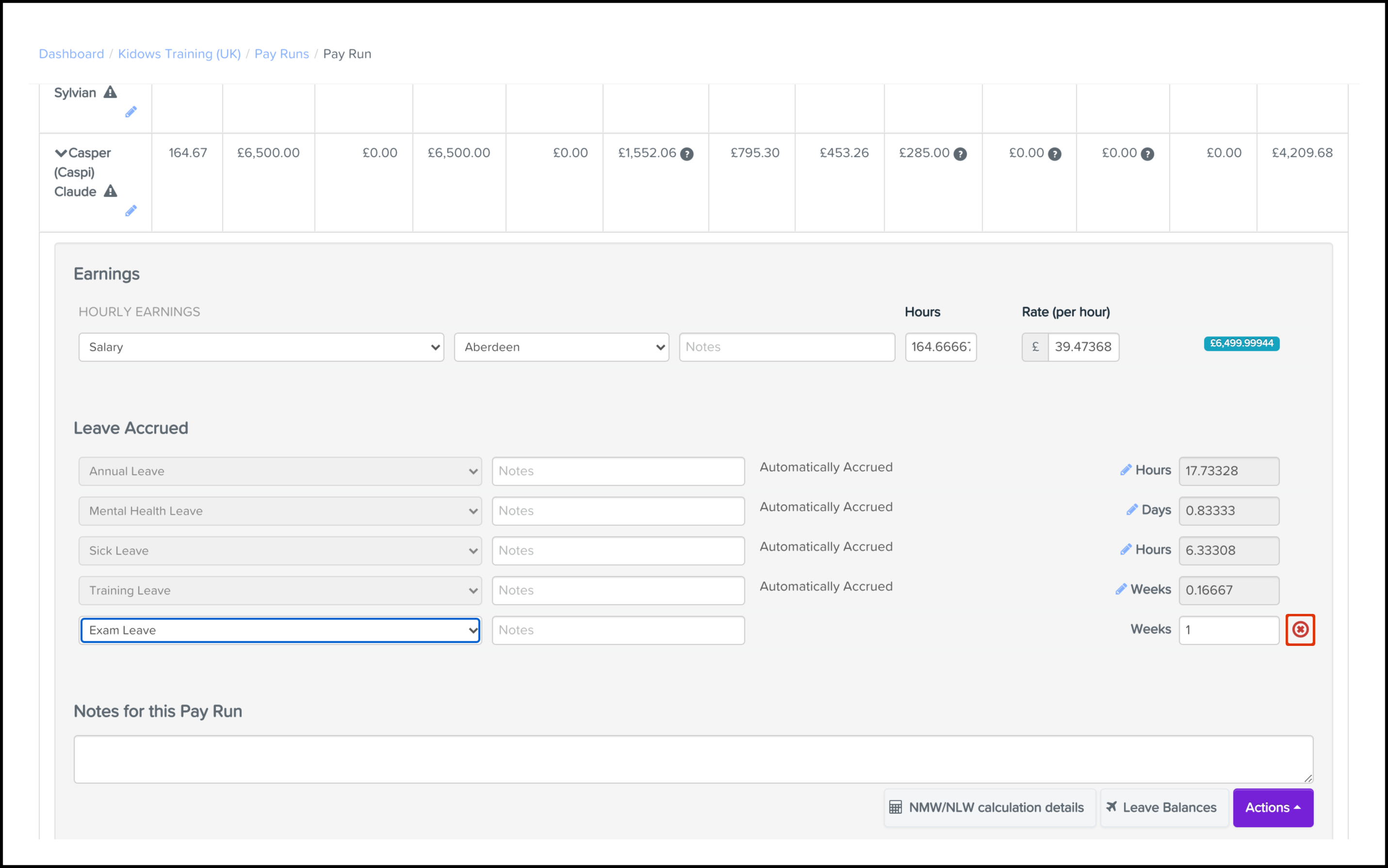 You can use the Accrued Leave feature within the Pay Run module to add an extra accrued leave line and specify details such as the leave category, leave value, and any required supporting notes. You can also use this feature to delete a leave-accrued line if you added it in error. A pay run needs creating first, before you can add or remove employee-accrued leave lines. To read further details on how to create a pay run, refer to the following article.
