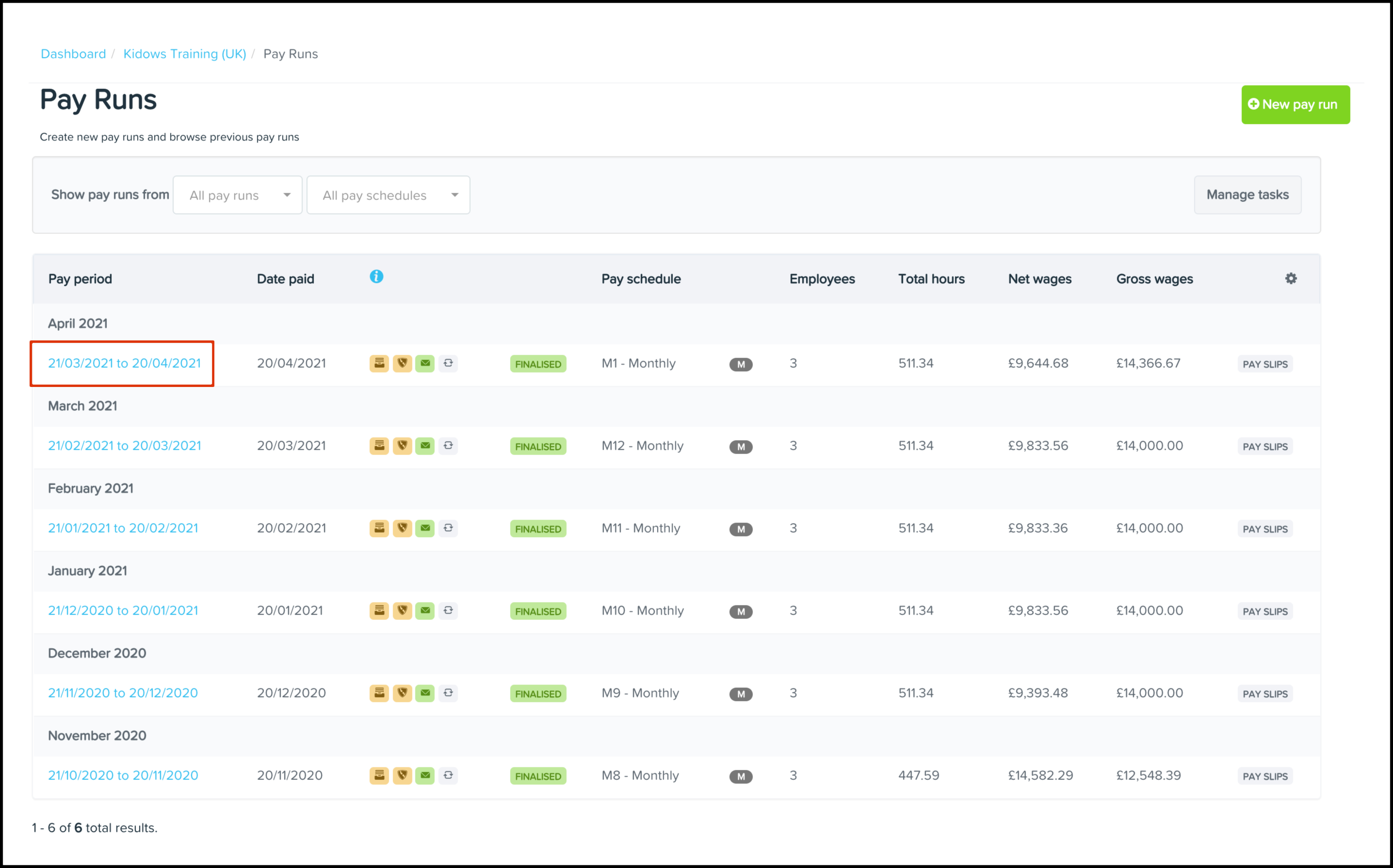 - Click on the finalised pay run that needs warning messages viewed.