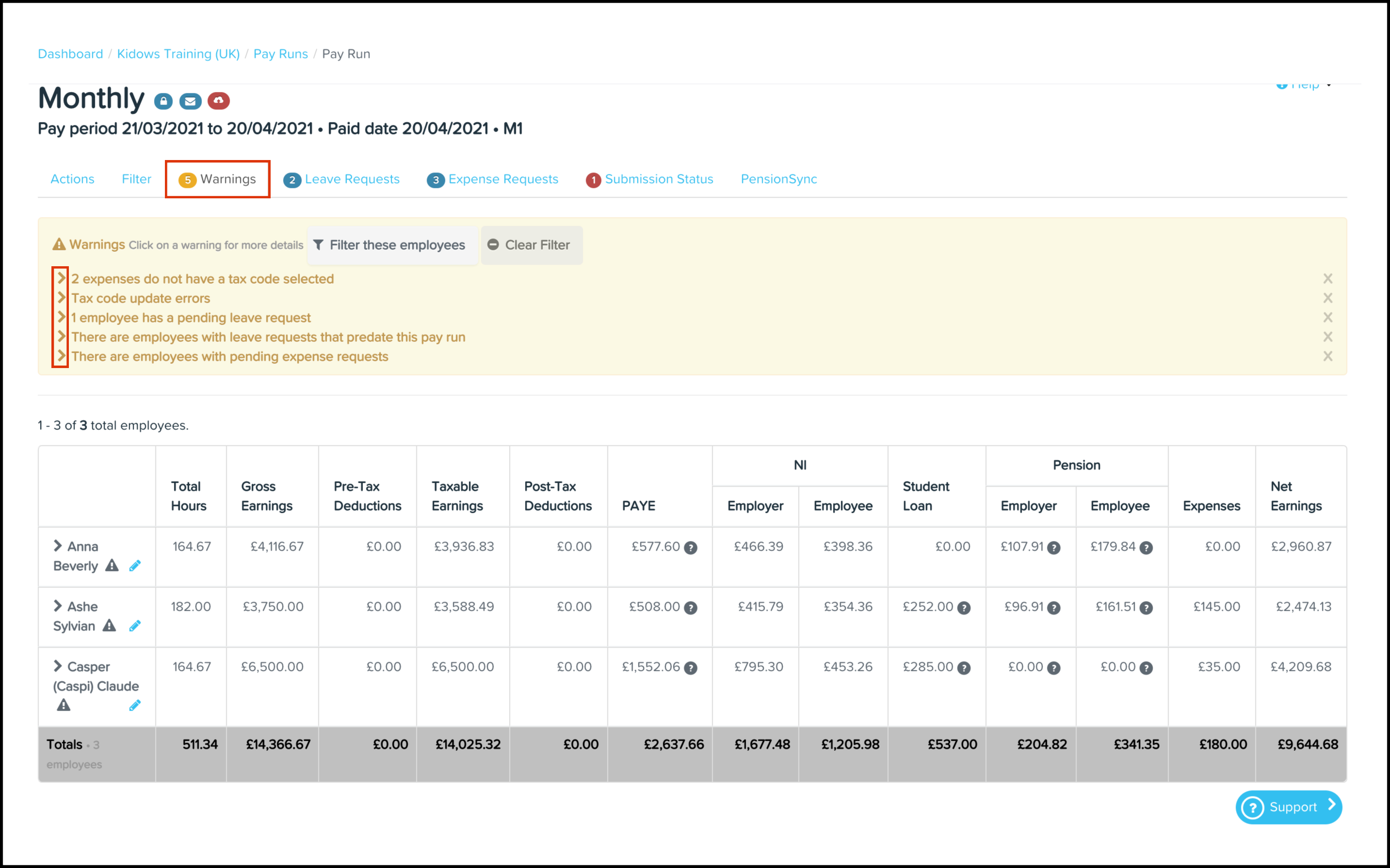 | Employee with unpaid earnings. | The platform displays this warning when an employee has an earnings line with hours applied, but the total value of the earnings line is 0(zero). This usually shows there is an error with the employee's rate of pay. |