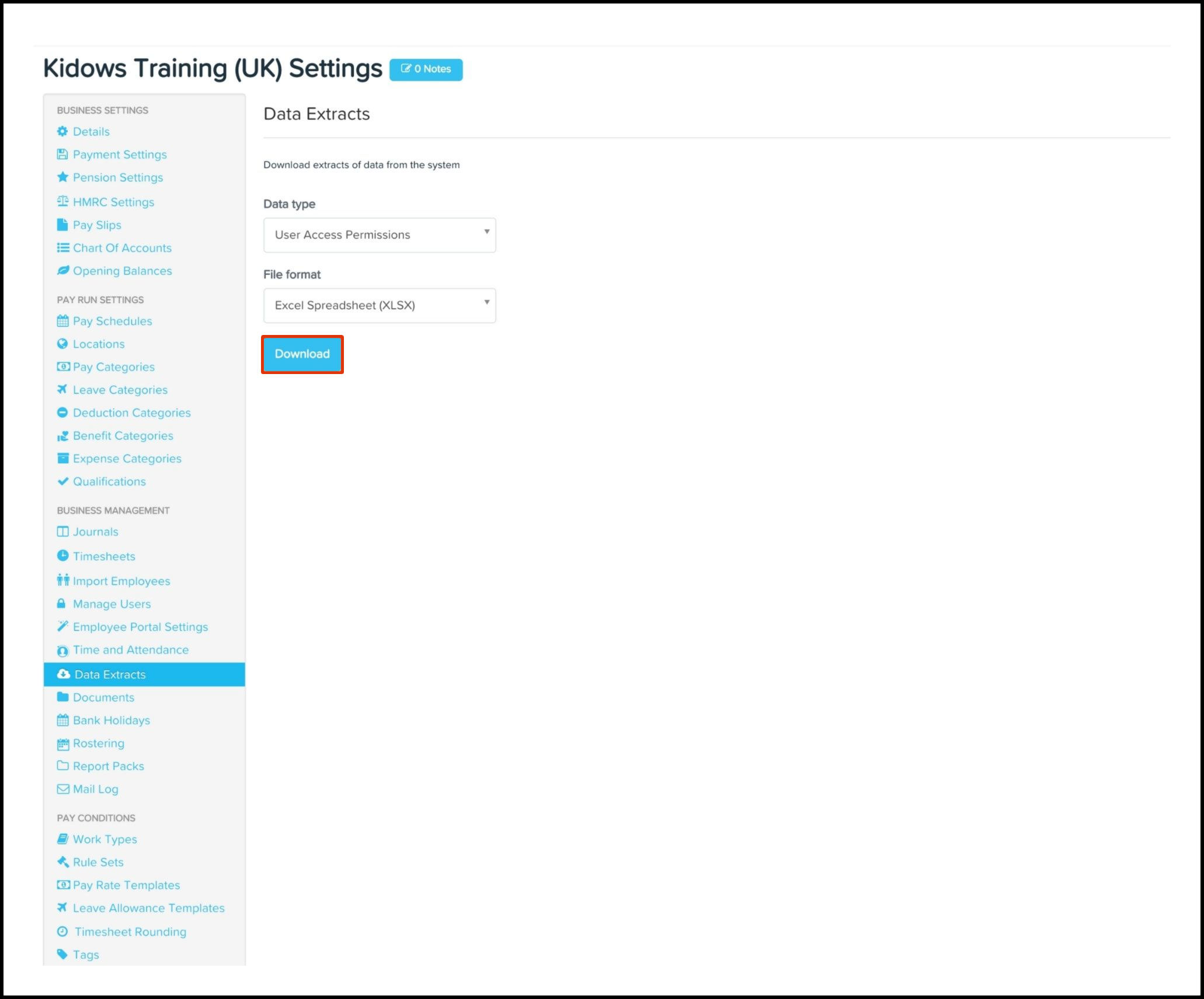 The Data Extract feature enables you to download your user access permissions data stored within your payroll platform as either a XLSX or CSV file.