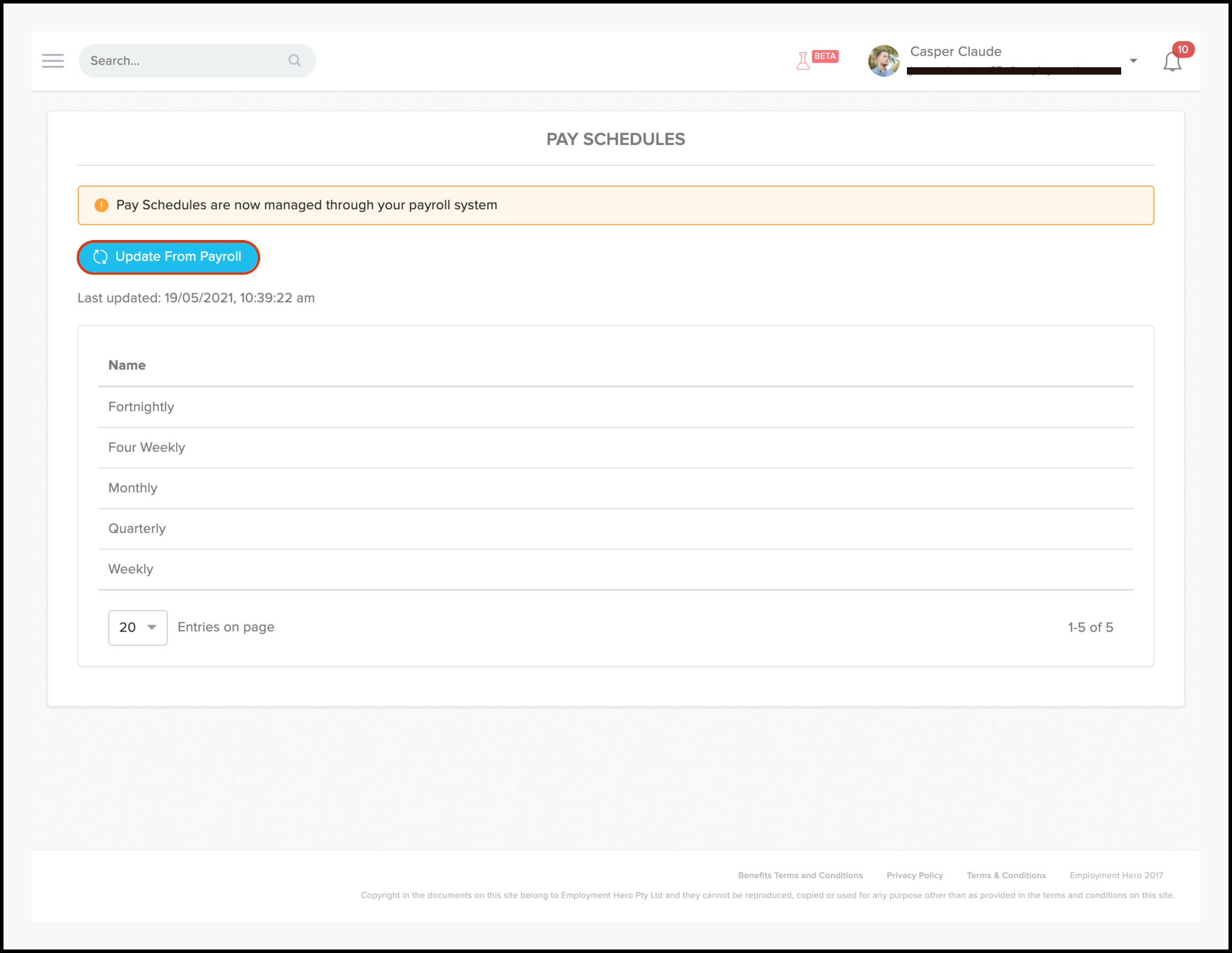 The Pay Schedules page will now show a greyed out Updated button. This means Employment Hero has successfully imported your pay schedules from your Xero platform.