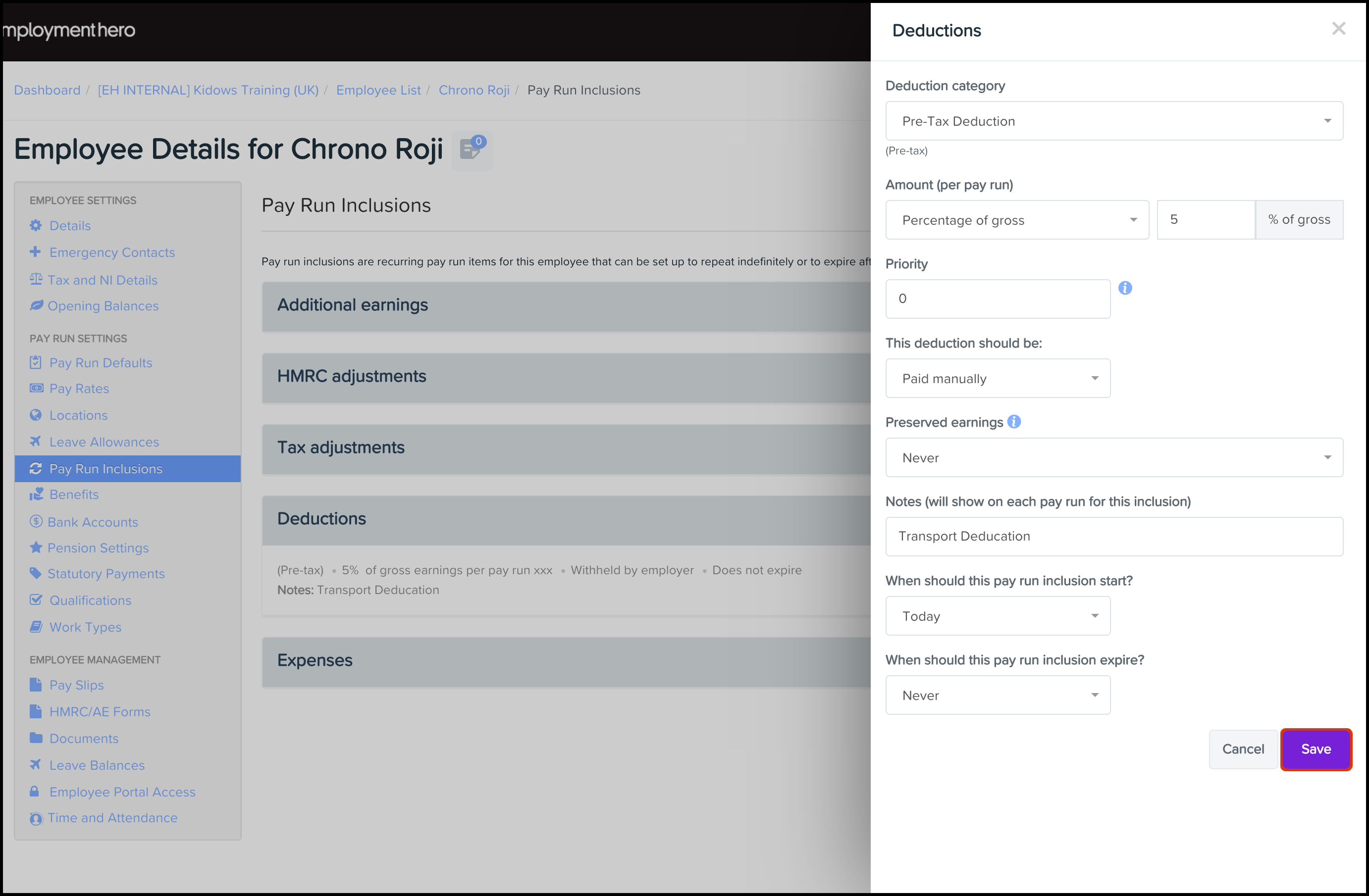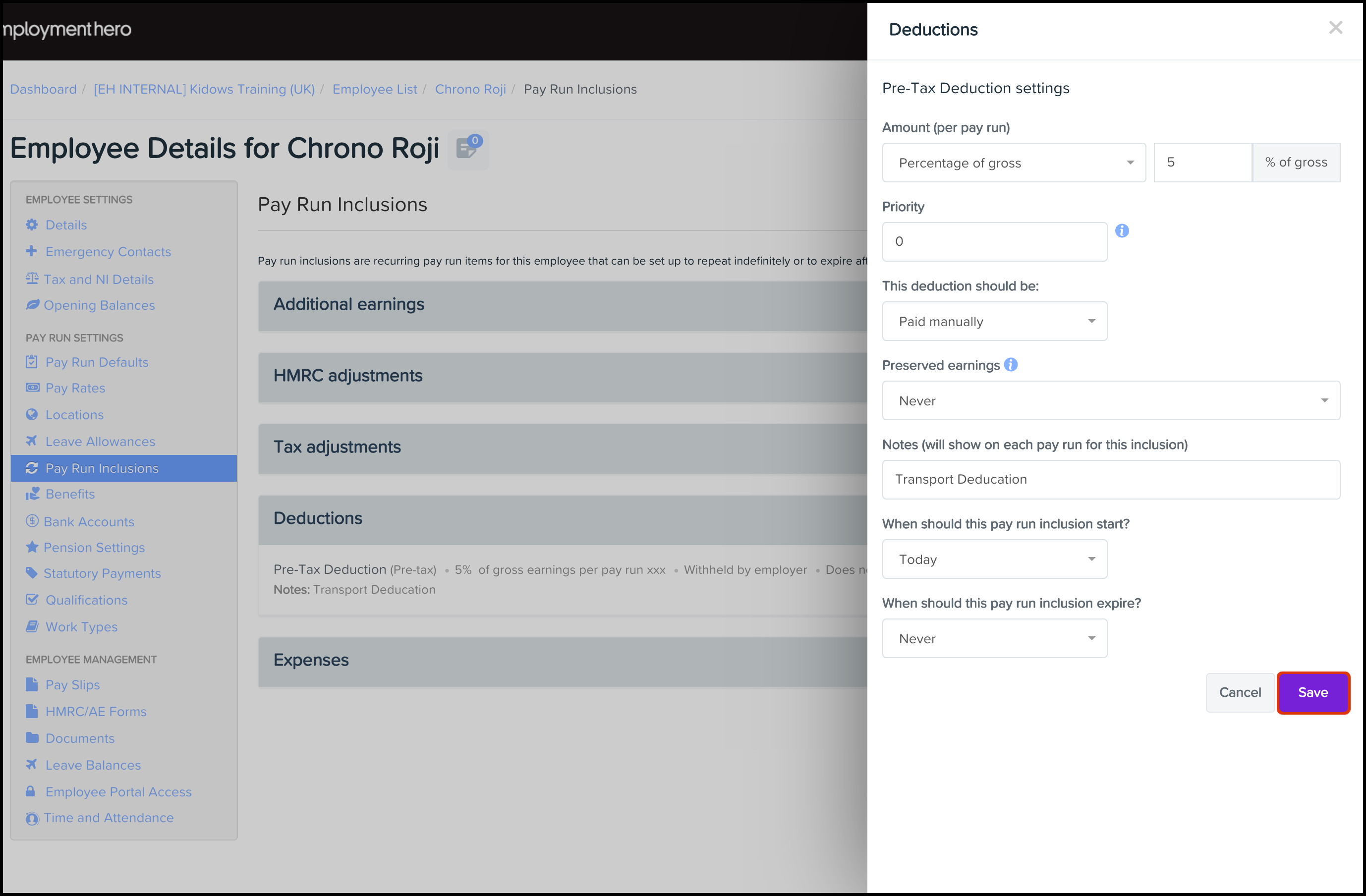 - Payroll Platform: Set Up and Manage an Employee's Expense Pay Run Inclusion This feature allows you to set up an automated expense where you can choose the category, the date the inclusion starts on, and the expense amount.