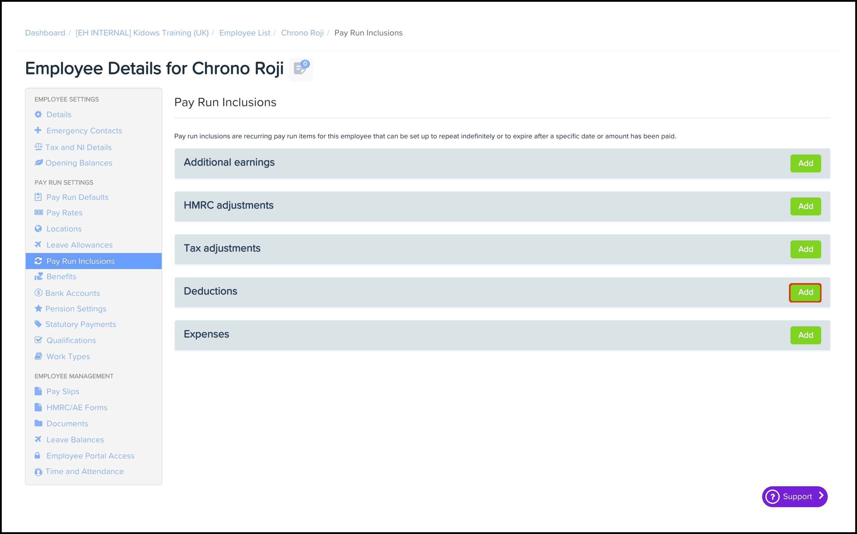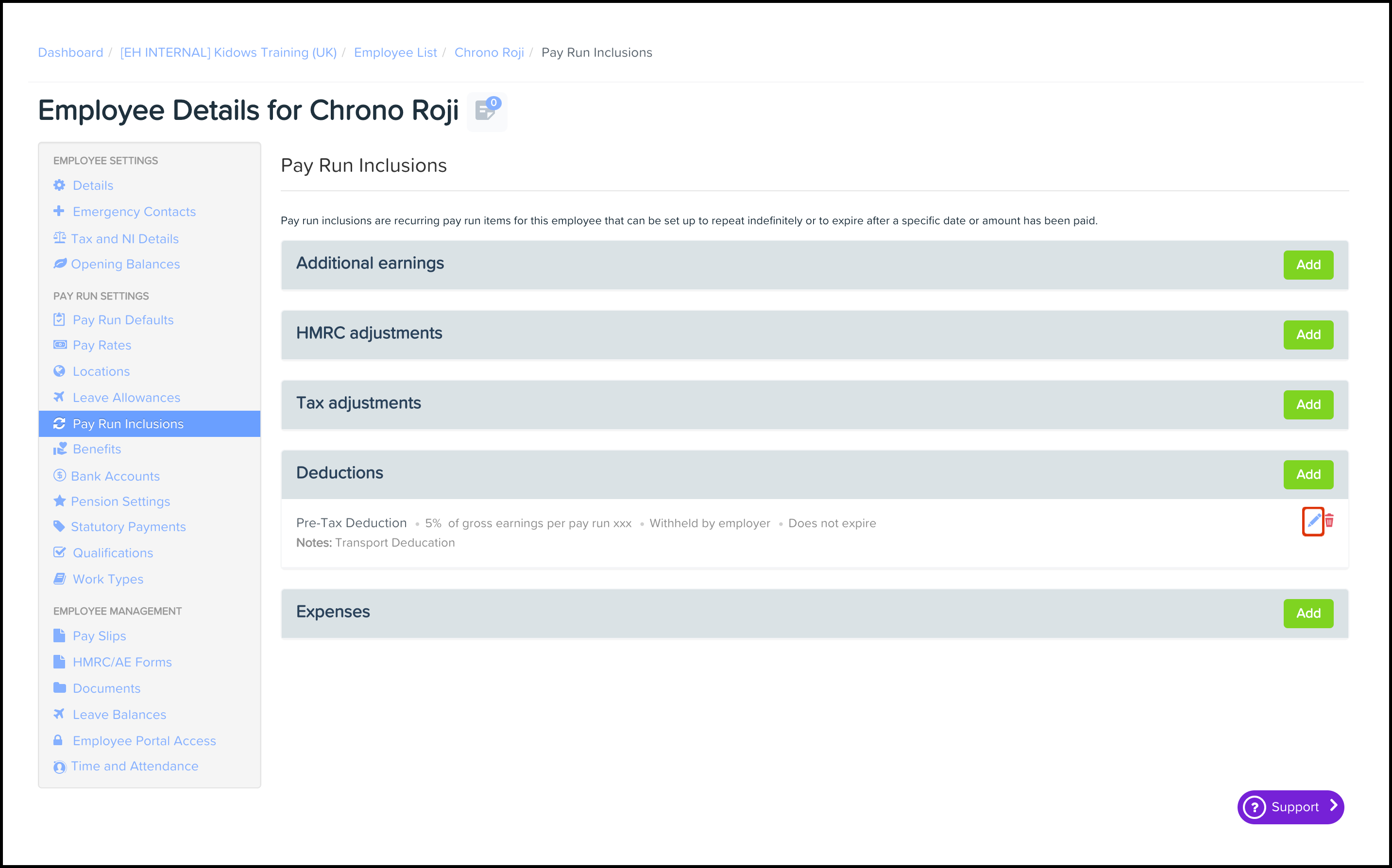 The Pay Run Inclusions Deduction feature allows you to set up an automated employee deduction where you can choose the category, the date the inclusion starts and ends on, and the amount. You can also use this feature to edit any data entered and delete a record that is no longer required.