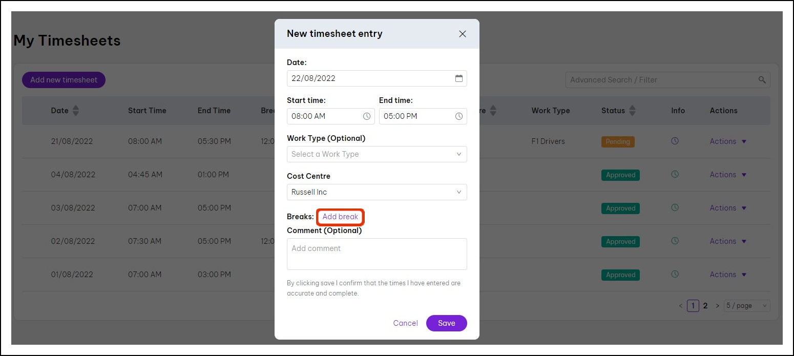 With the My Daily Start and End Time Based Timesheets feature, you can log your start and end times, record breaks, and add comments. You can also edit or delete entries if needed.