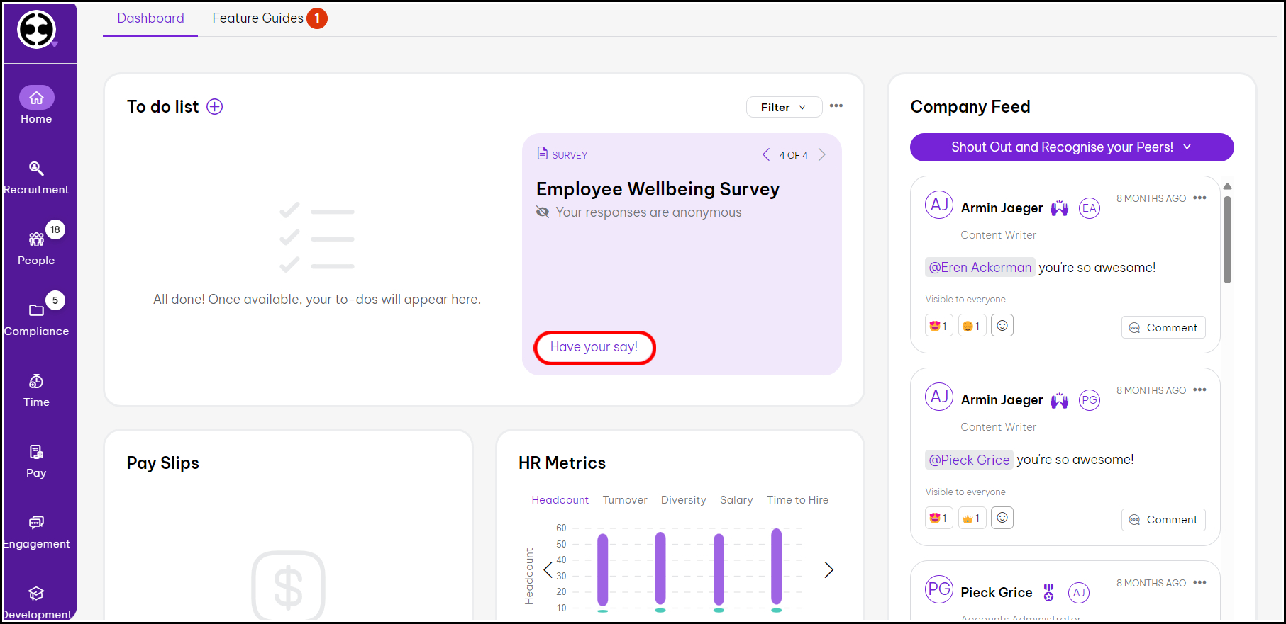You can easily access and complete your assigned surveys, including employee surveys and exit interviews, directly from the To-Do List feature on your dashboard. The Employee Happiness feature further allows you to rate your happiness anonymously out of ten and comment on your rating. With full confidentiality as your organisation cannot identify individual responses. To activate the happiness feedback survey, an admin must enable it within Employee Engagement settings.