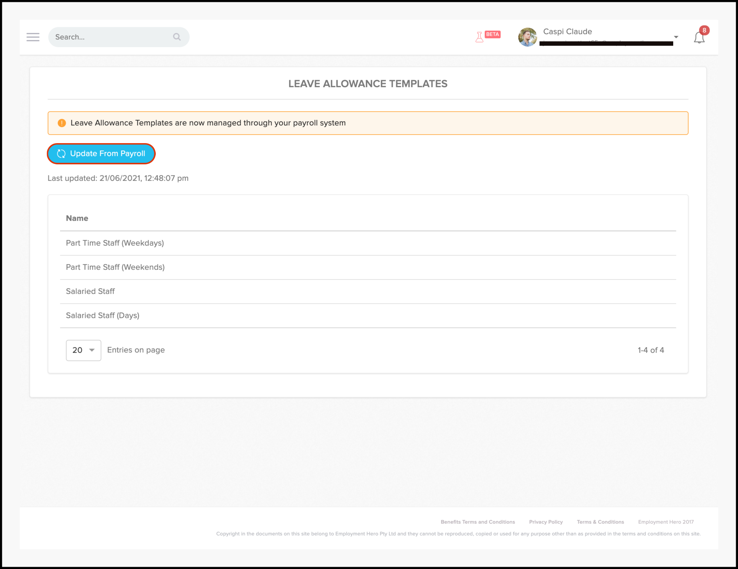 The Leave Allowance Template page will now show a grey Updated button and means Employment Hero has successfully imported your leave allowance templates from your payroll classic platform.