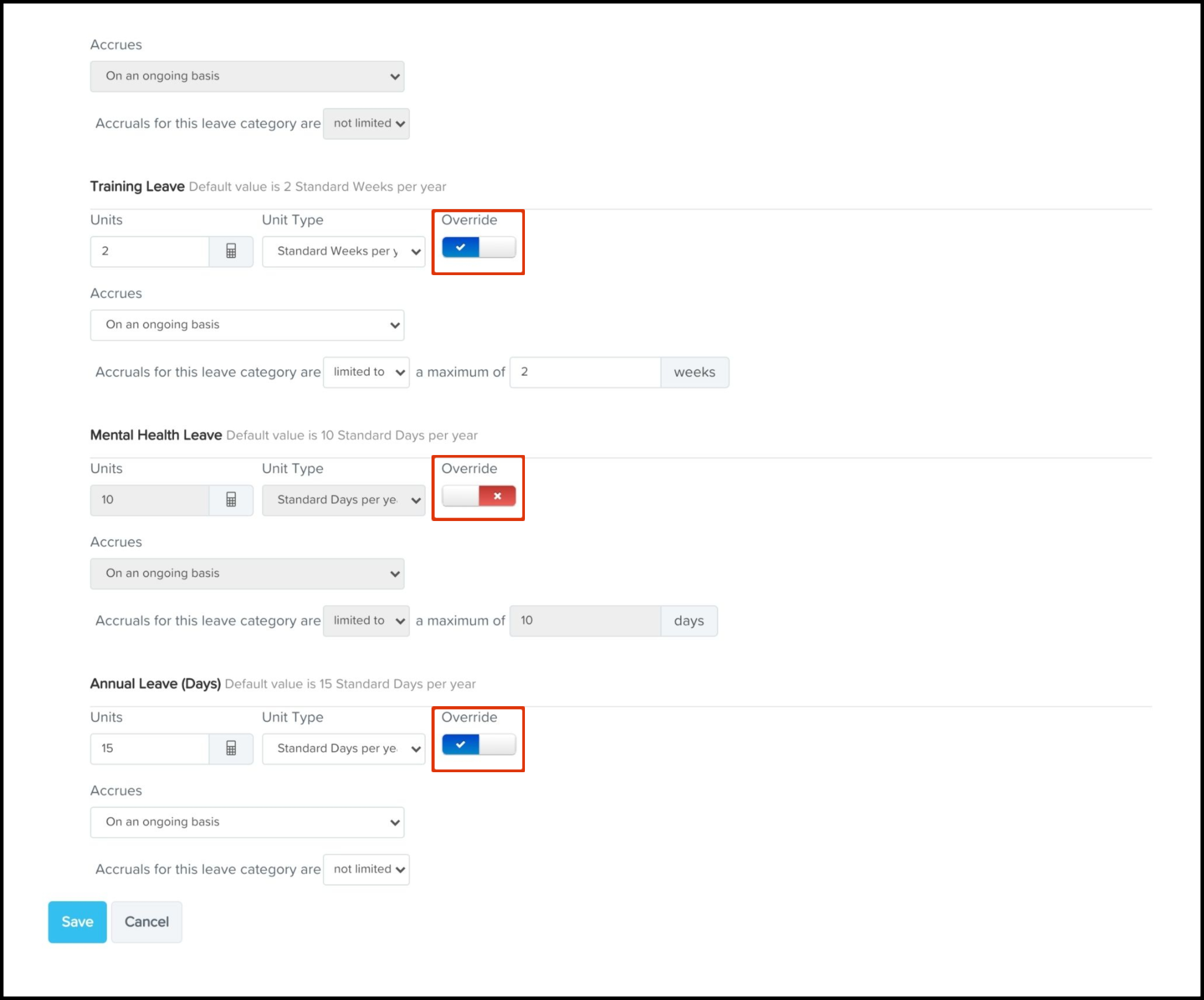 - In the Leave Allowance section, use the override toggle switch to change the data if required.