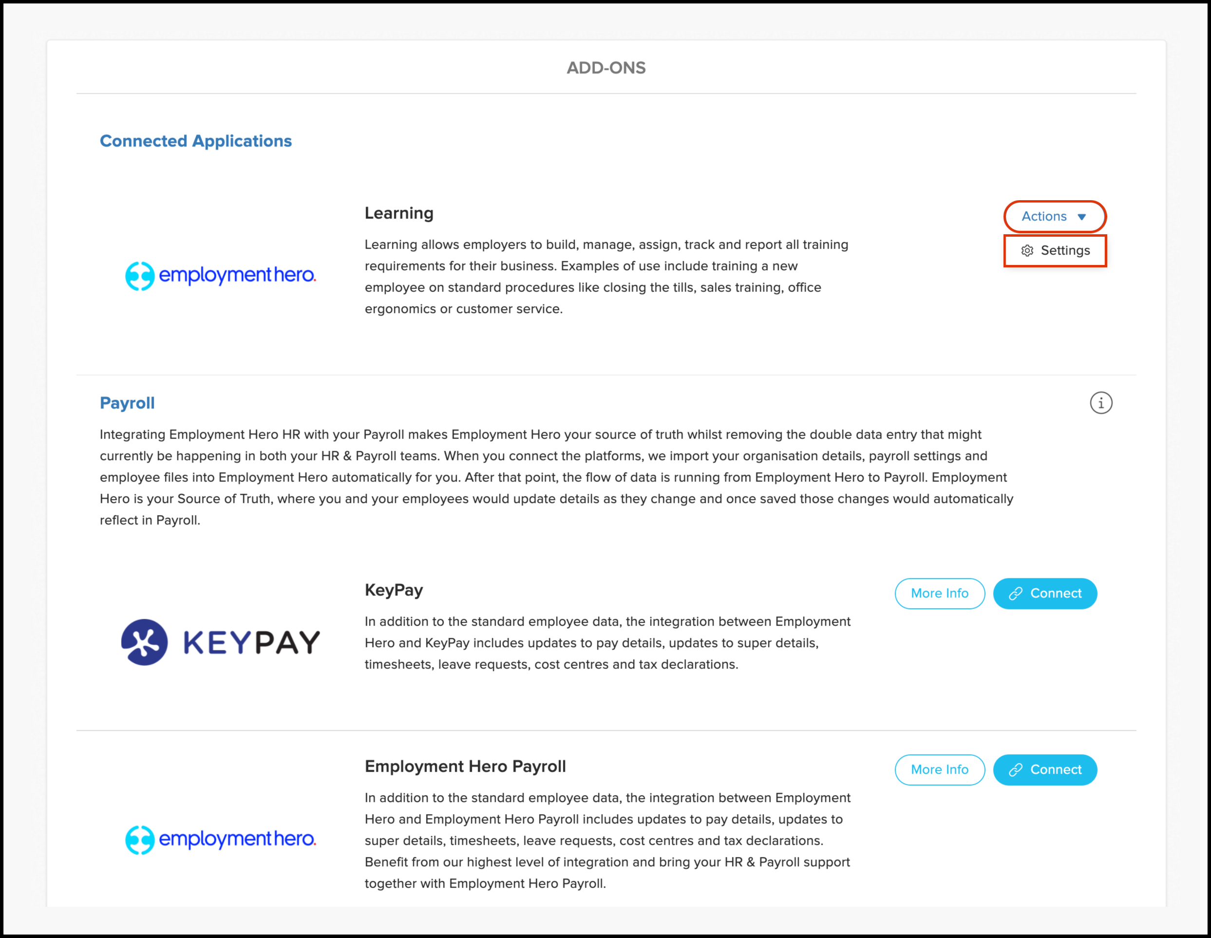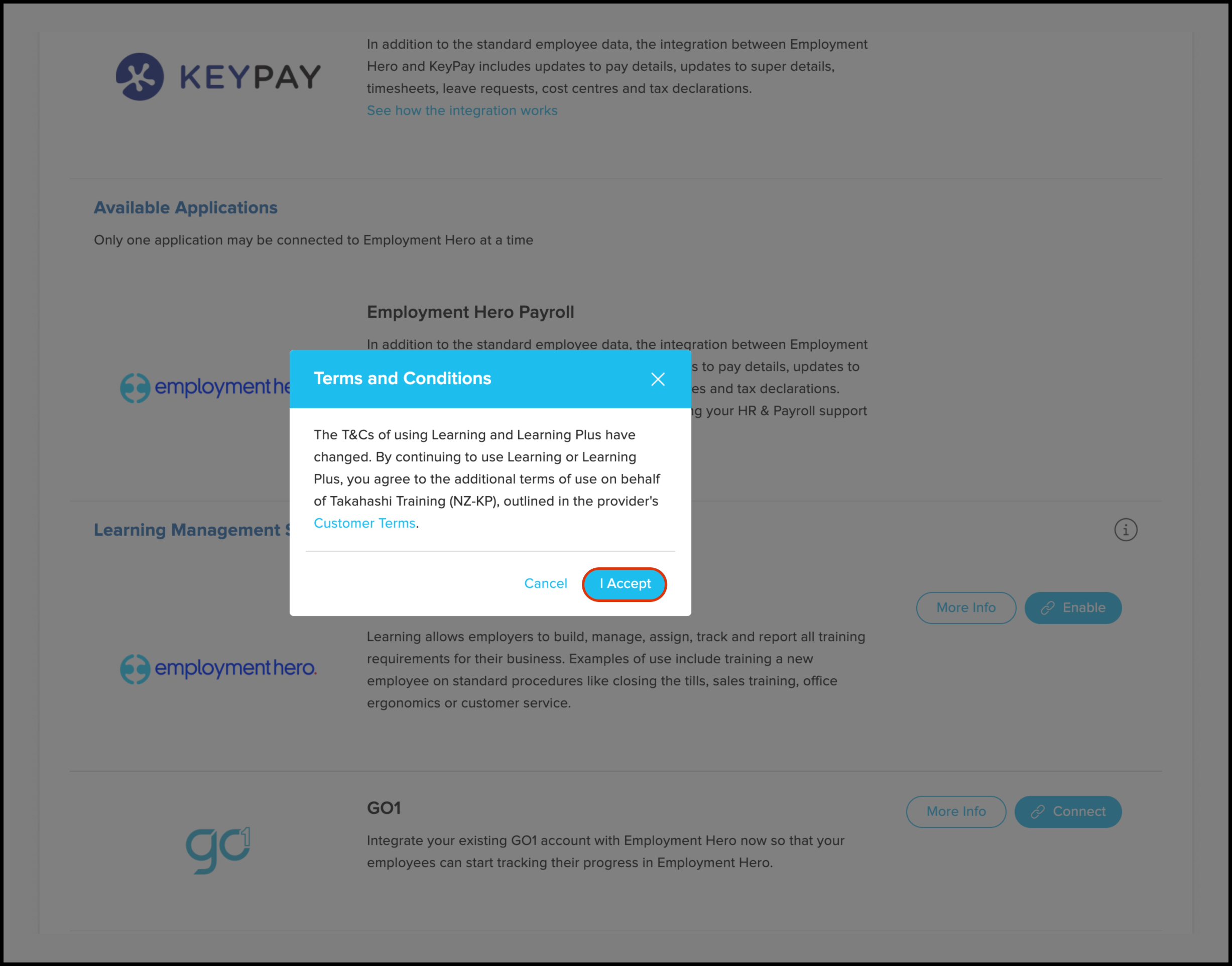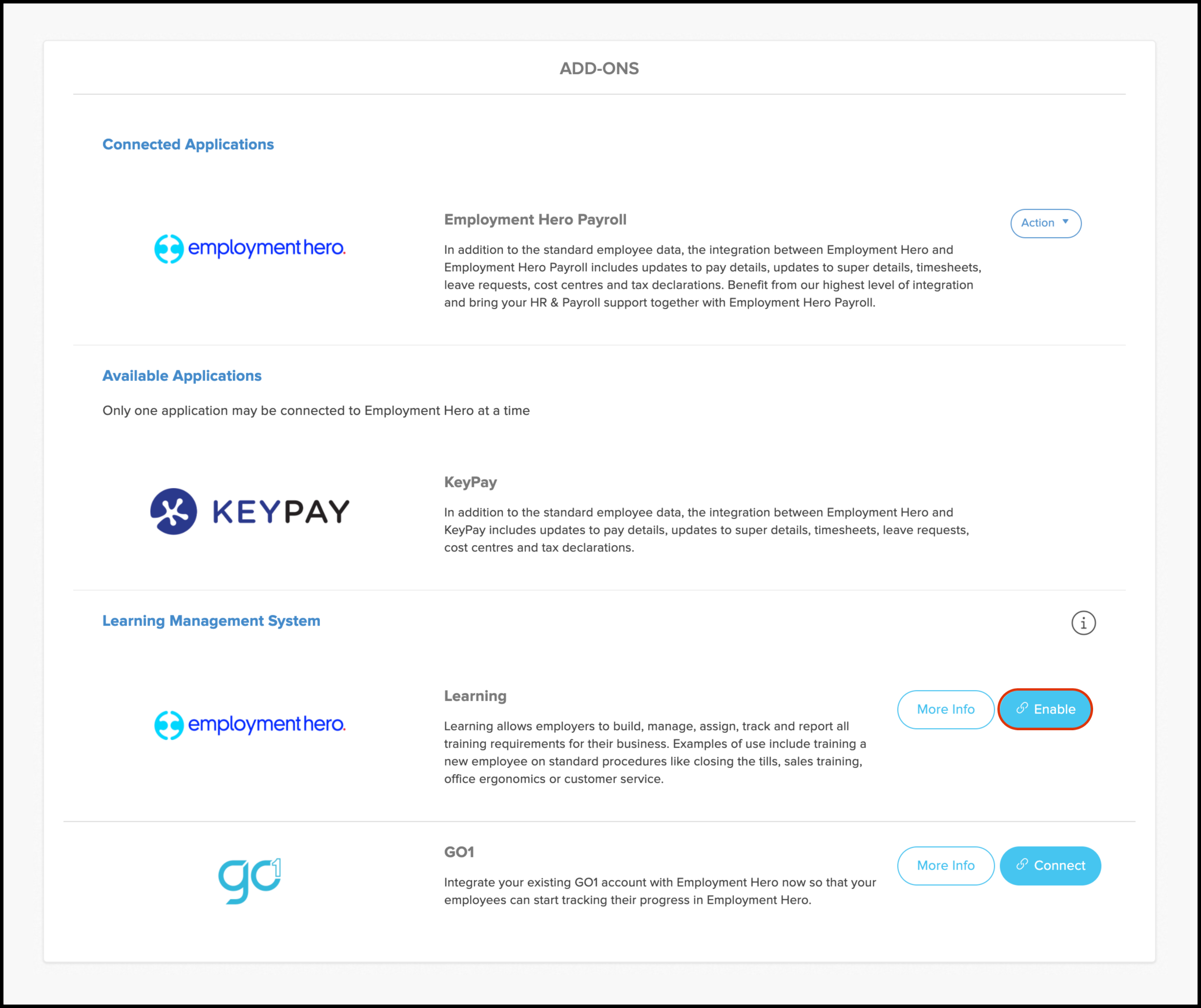 Employment Hero (EH) Learning is an LMS that helps train employees, orient them to their roles, and expand their knowledge. To connect EH to Go1, you must be an admin on both platforms. If your organisation has an existing Go1 account, select the Go1 option; otherwise, choose EH Learning. Both options integrate with Go1. Connecting to EH Learning will not send welcome emails to employees, and notifications are off by default, allowing for testing without alerting employees.