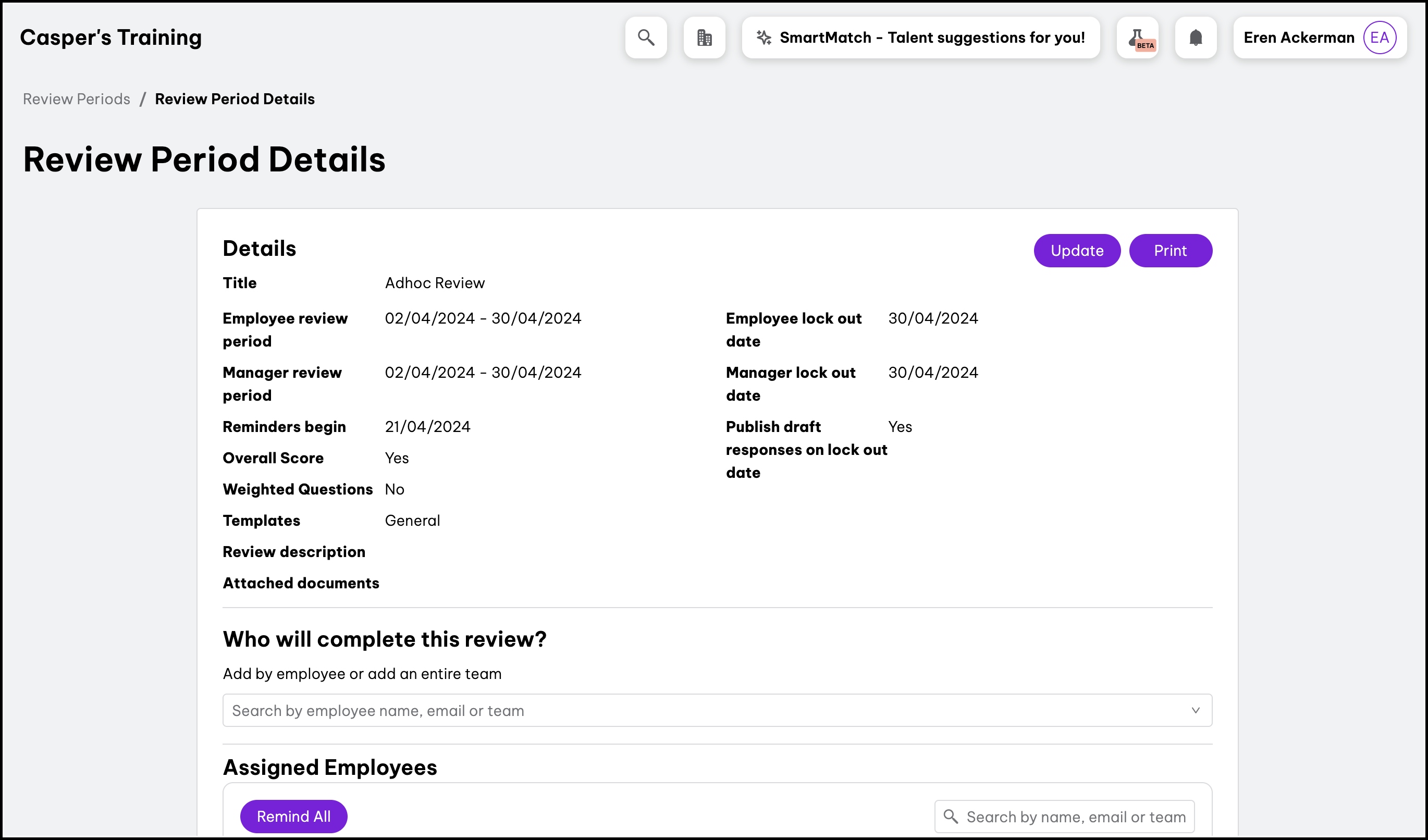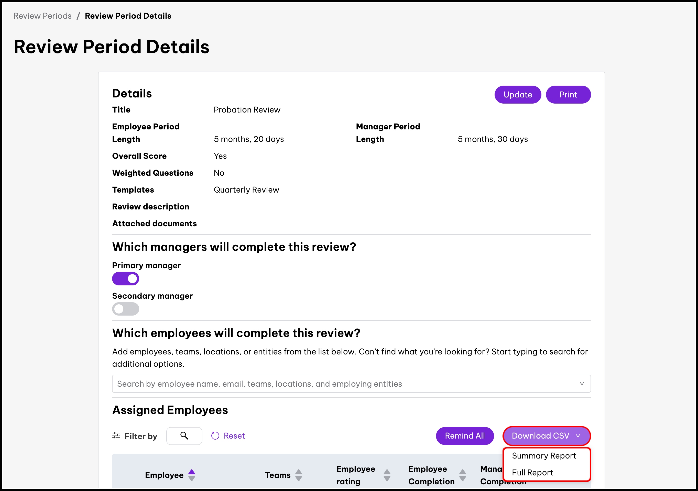 If an admin wants to update an employee’s reviewer and assign it to the latest manager, the admin can remove and re-add the employee in the current review period.