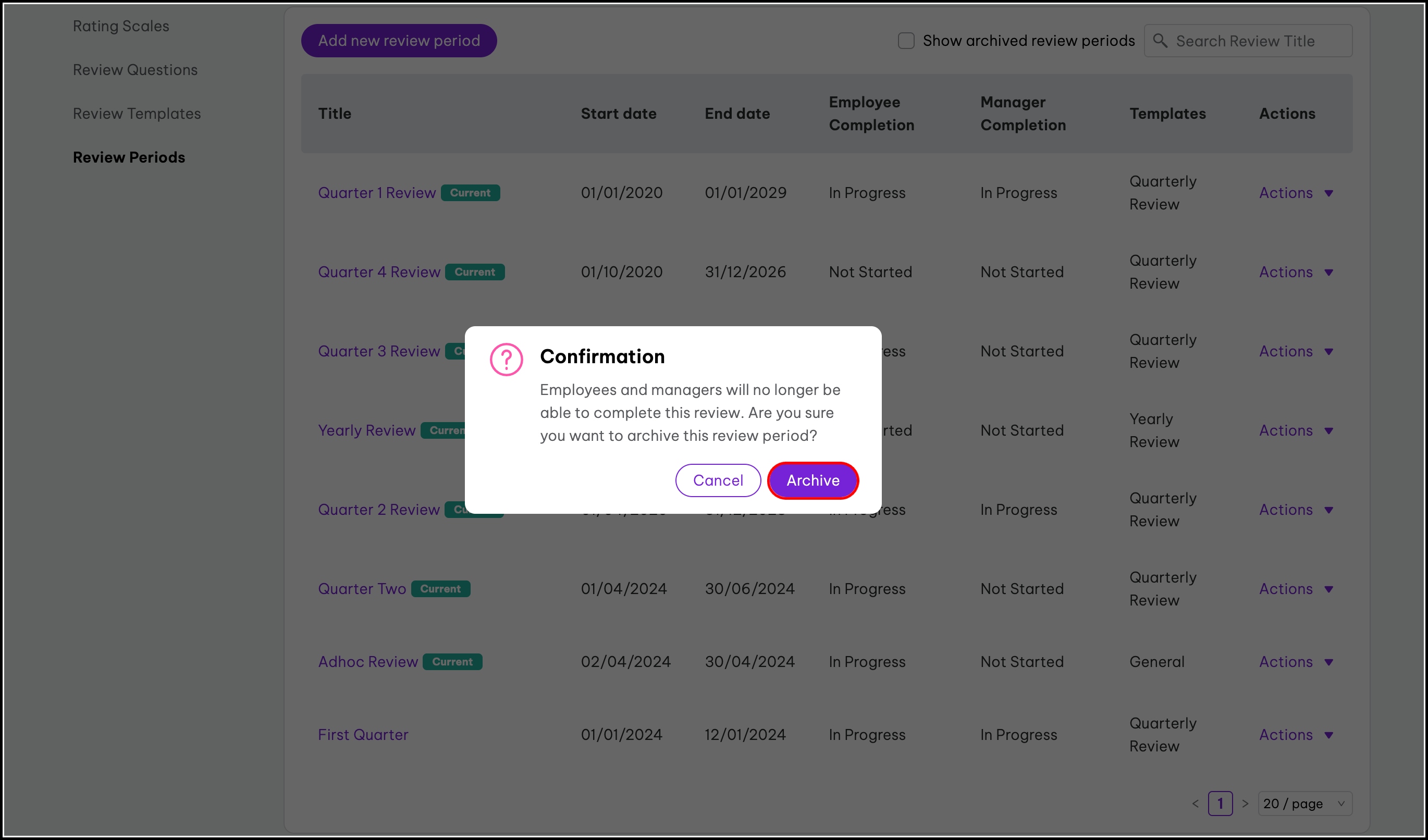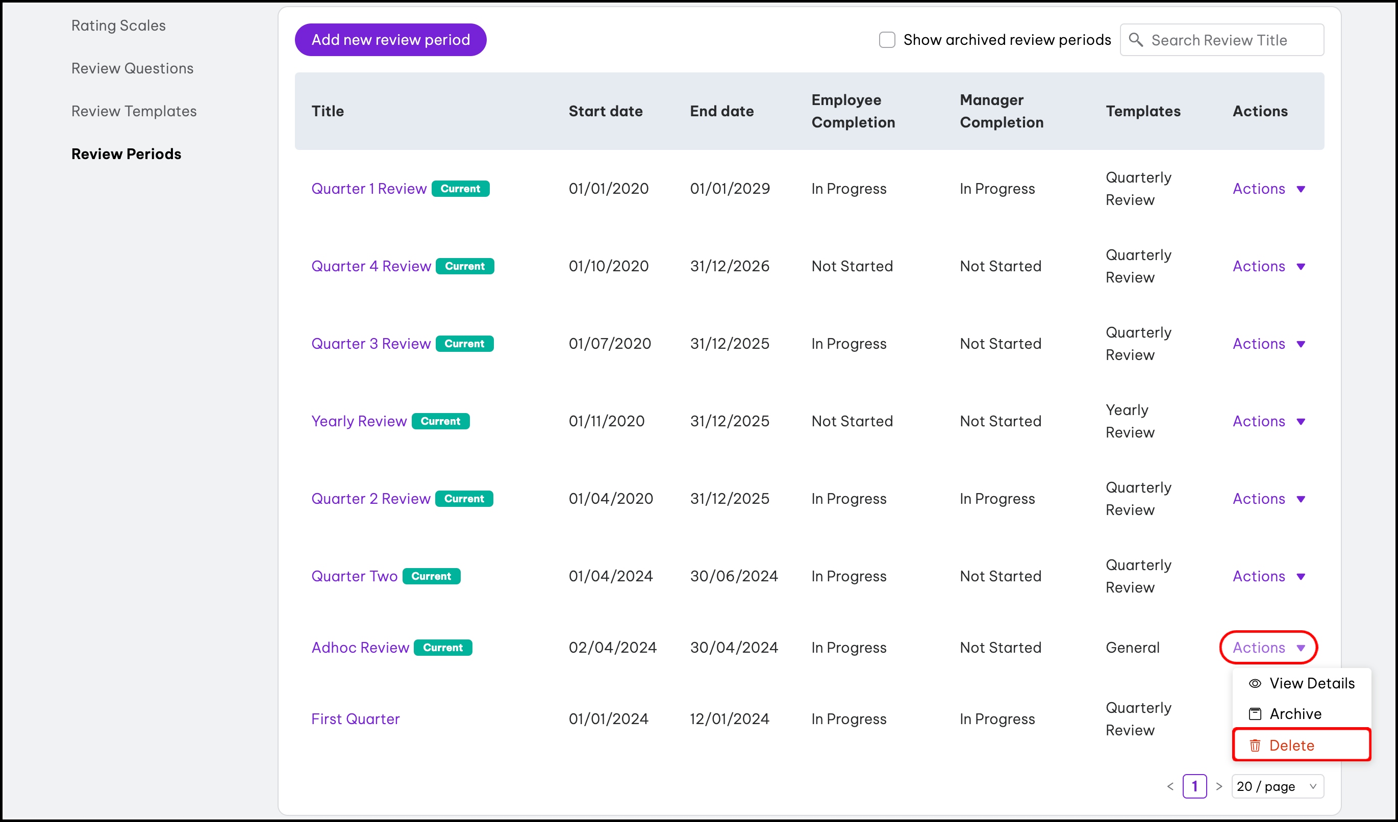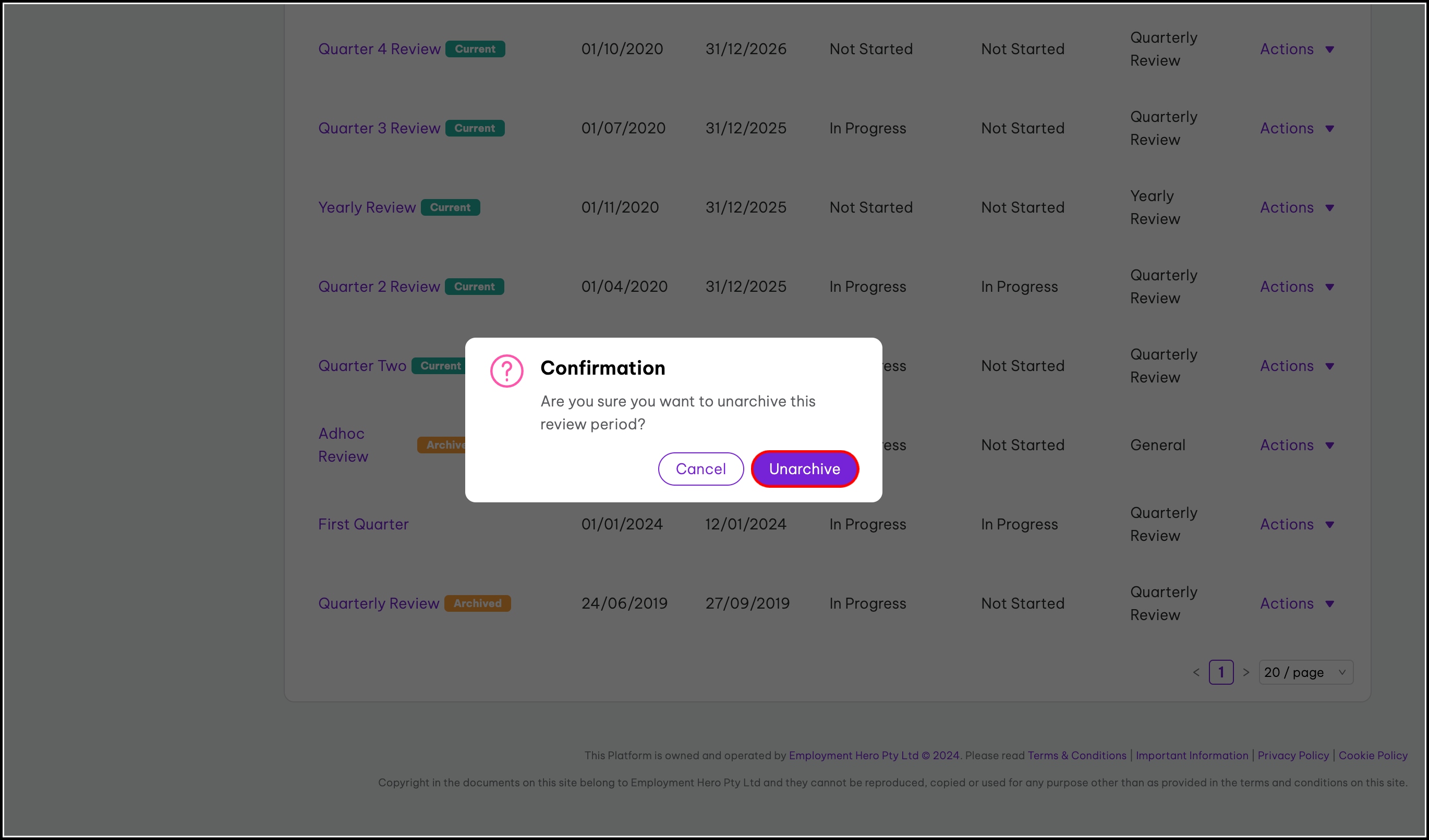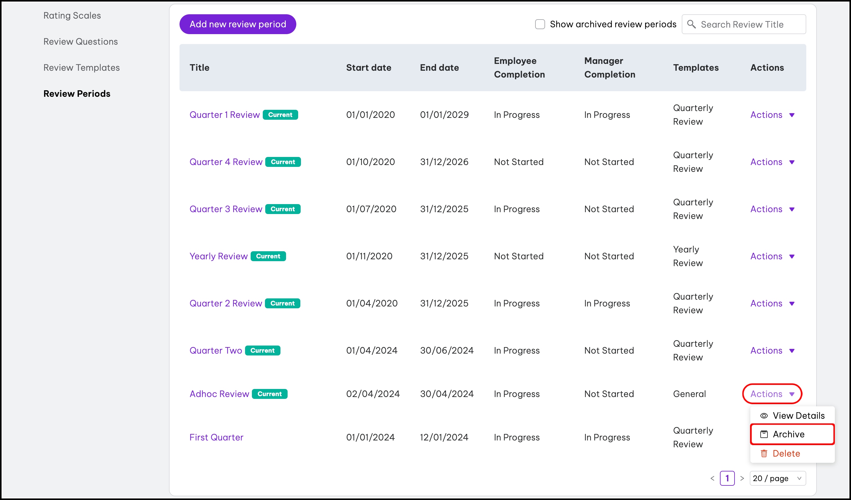 - Click the Actions dropdown button for the review period you need to unarchive.