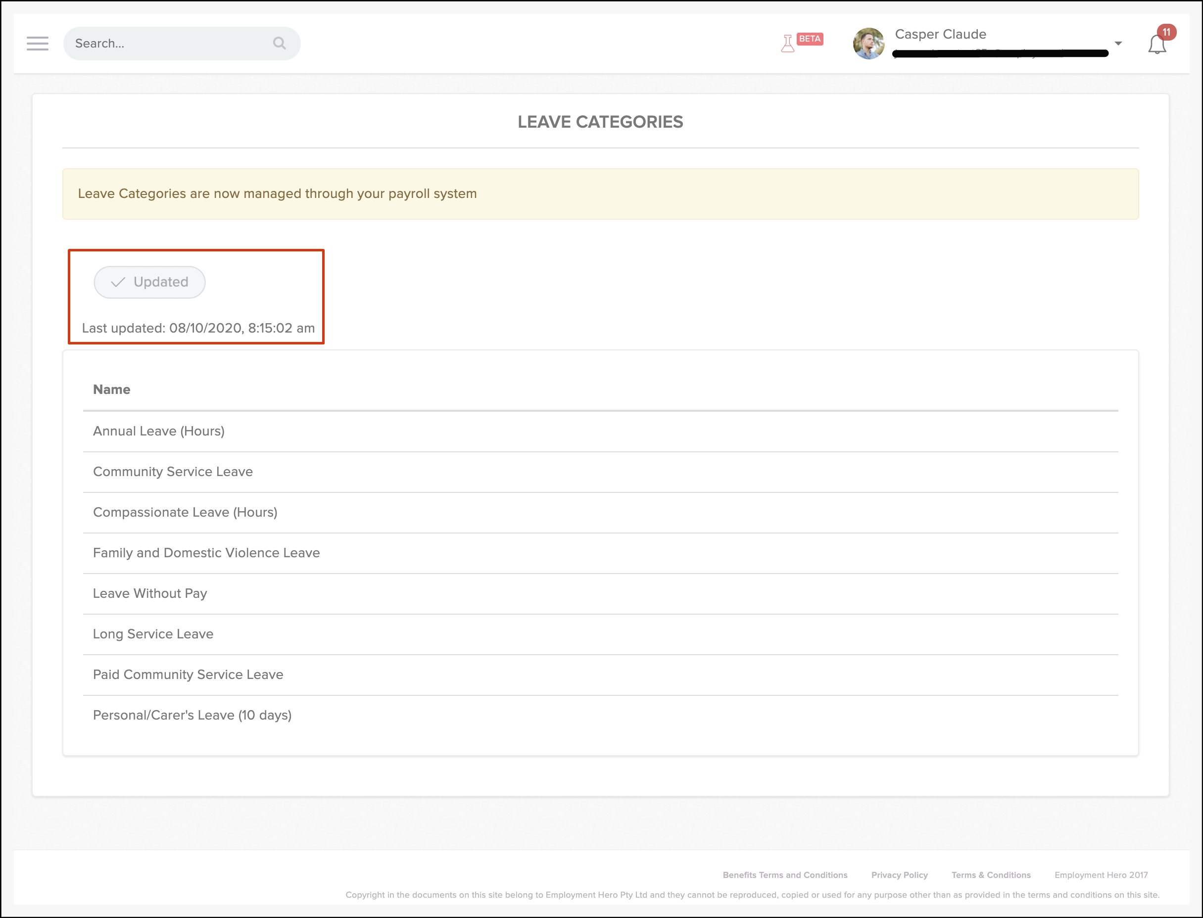 The Leave Categories page will now show a grey Updated button and means Employment Hero has successfully imported your leave categories from the Payroll classic platform.