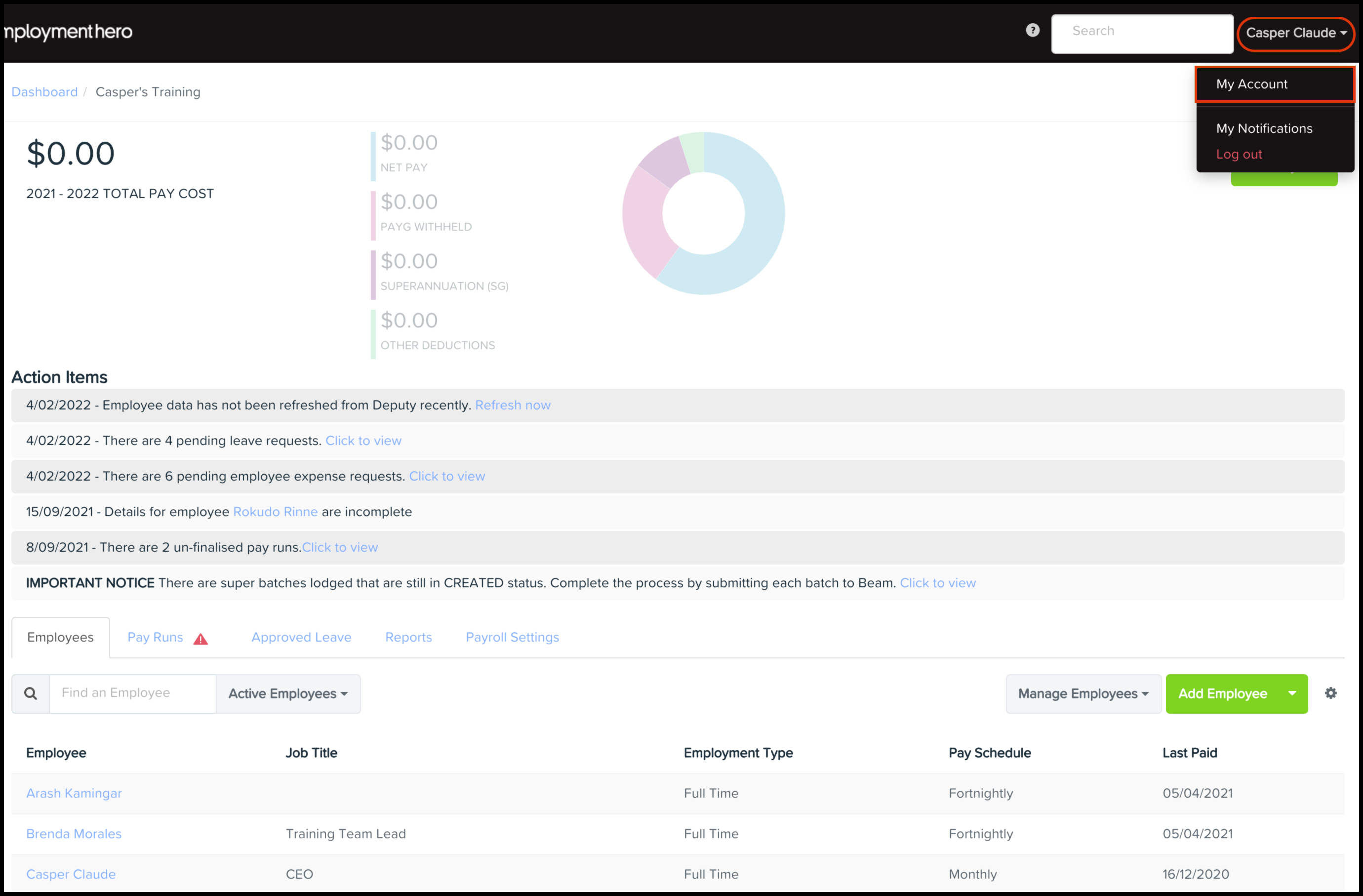 • Manage notifications This feature allows you to customise what email notifications and daily reminders you receive from the payroll platform.
