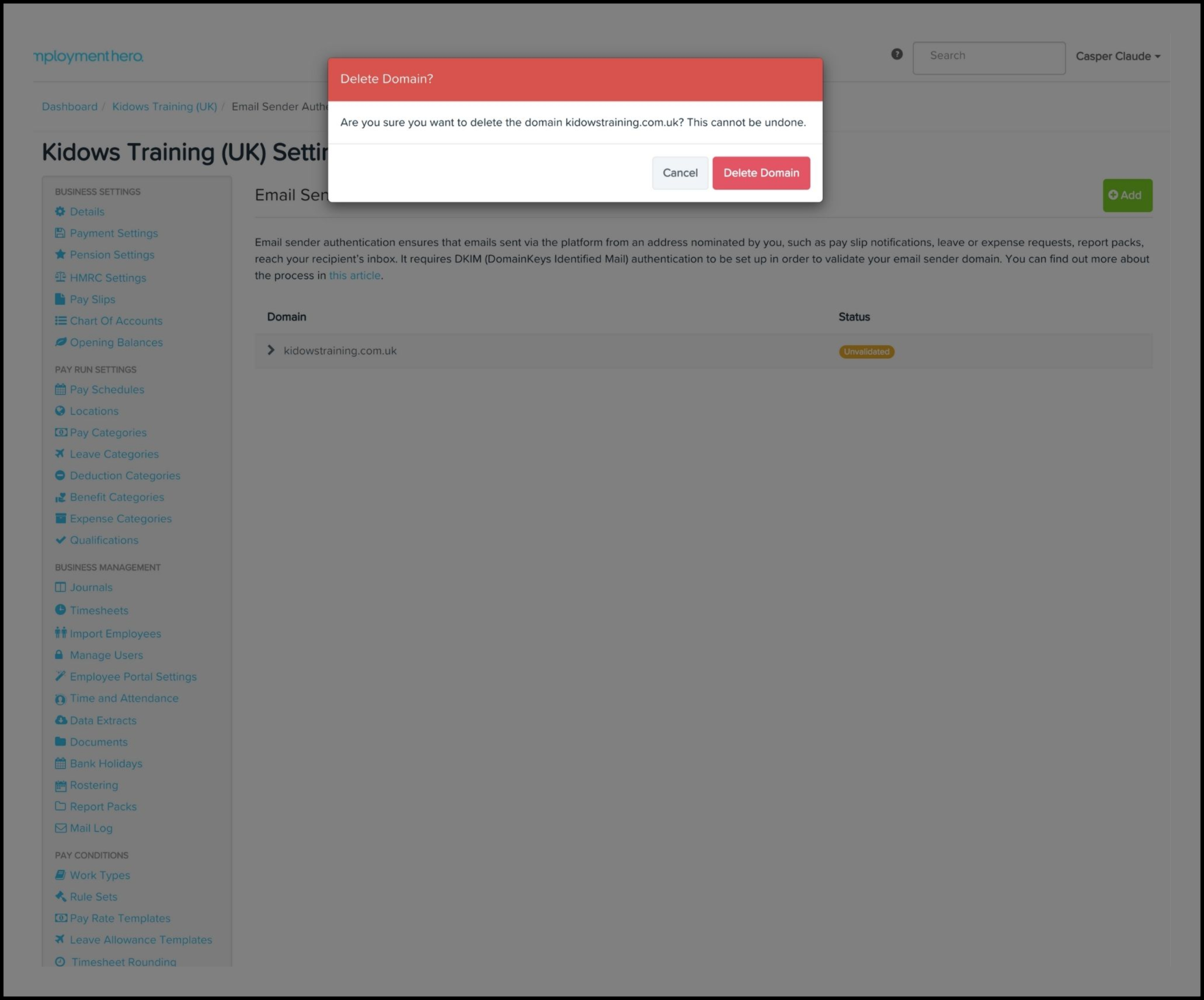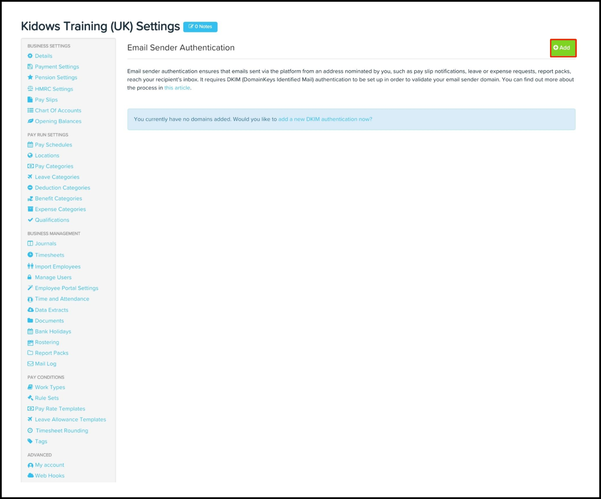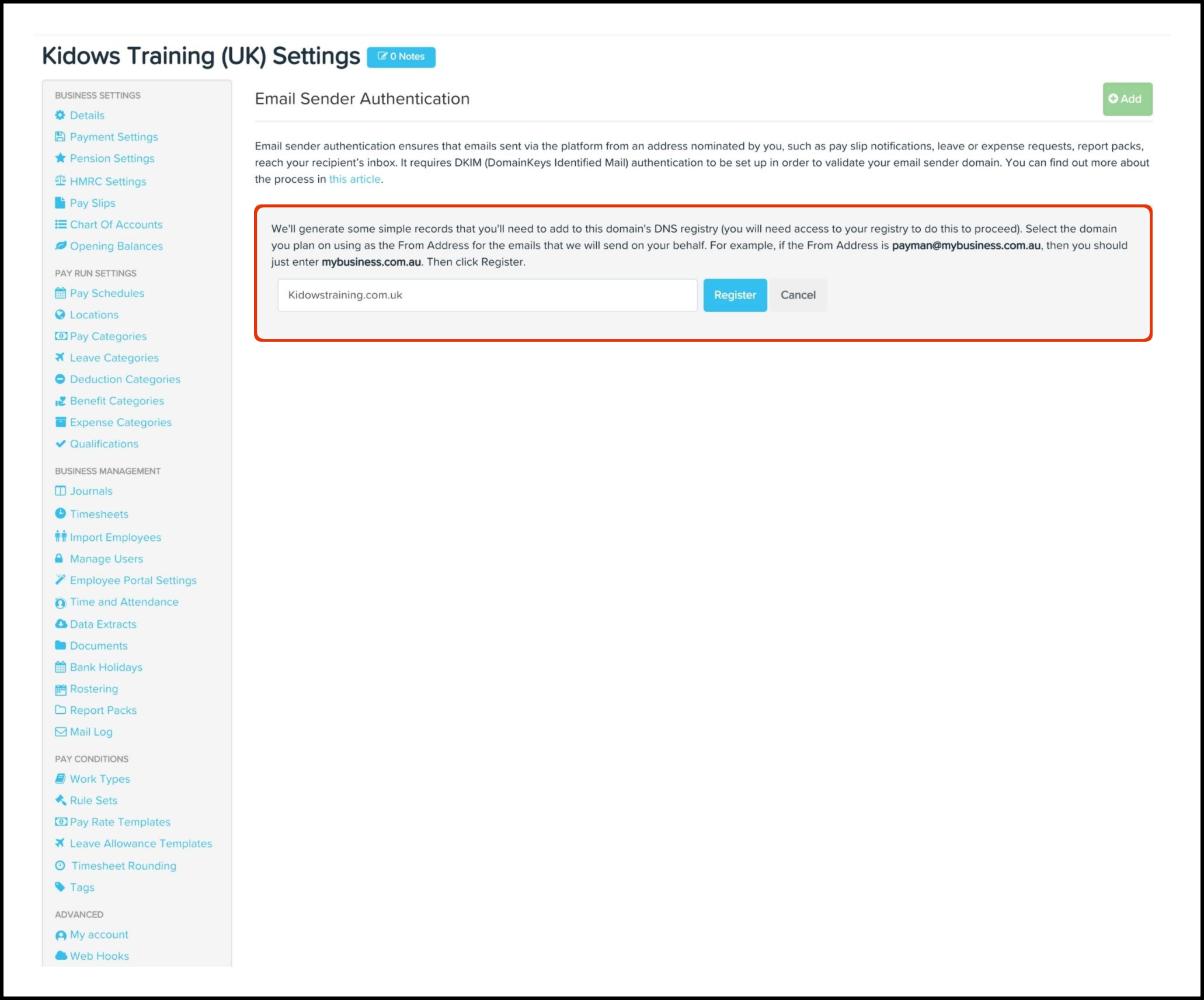 The Payroll platform allows you to set up DKIM (Domain Keys Identified Mail) on a domain of your choice for emails sent via the Payroll platform. This can be set up from an address nominated by you and will apply to features such as pay slip notifications, leave or expense requests and report packs.