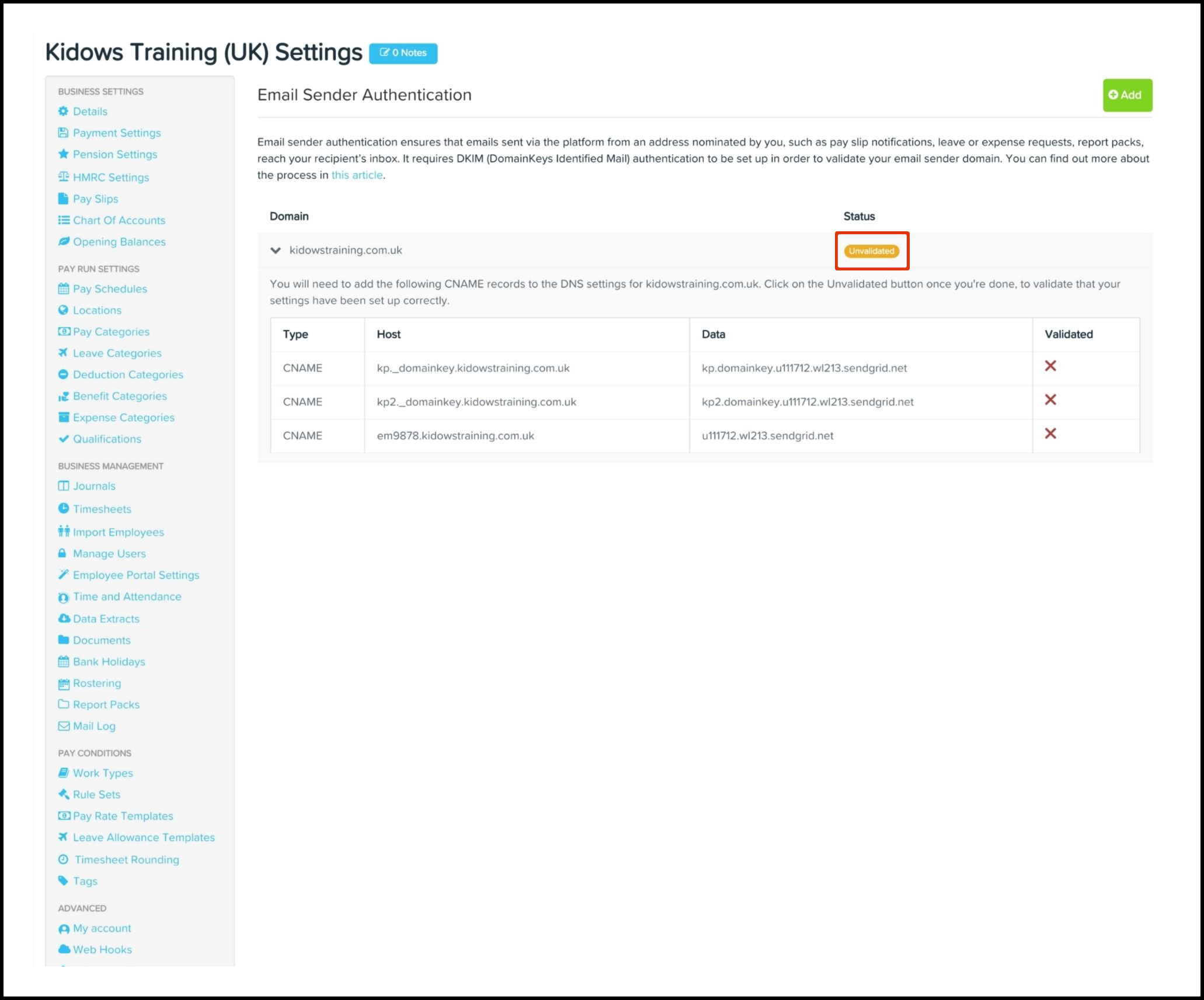 The payroll platform will now generate a set of CNAME records, and you will need to add these to your DNS settings.