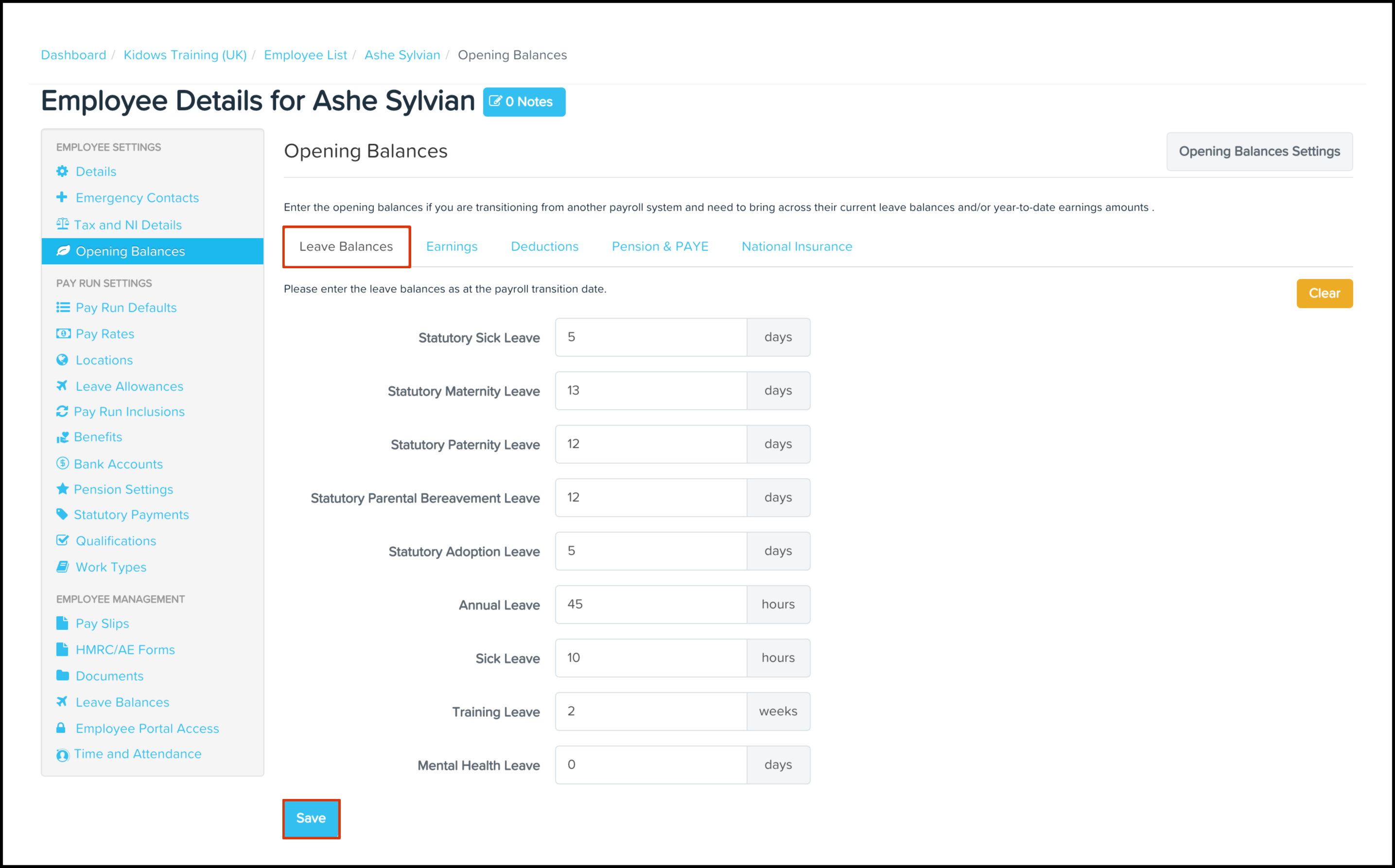 The Opening Balances Leave Balances feature lets you select an employee file and enter their accrued YTD leave balances. You can also use this feature to clear the opening balances if you entered the wrong YTD figures in their employee file.