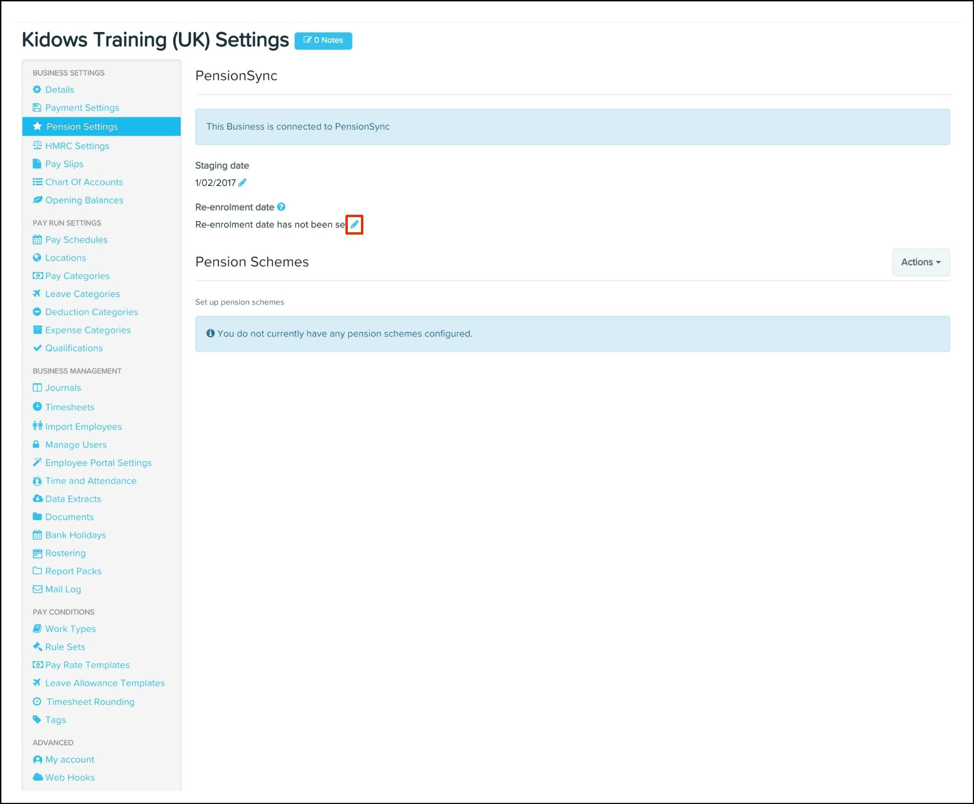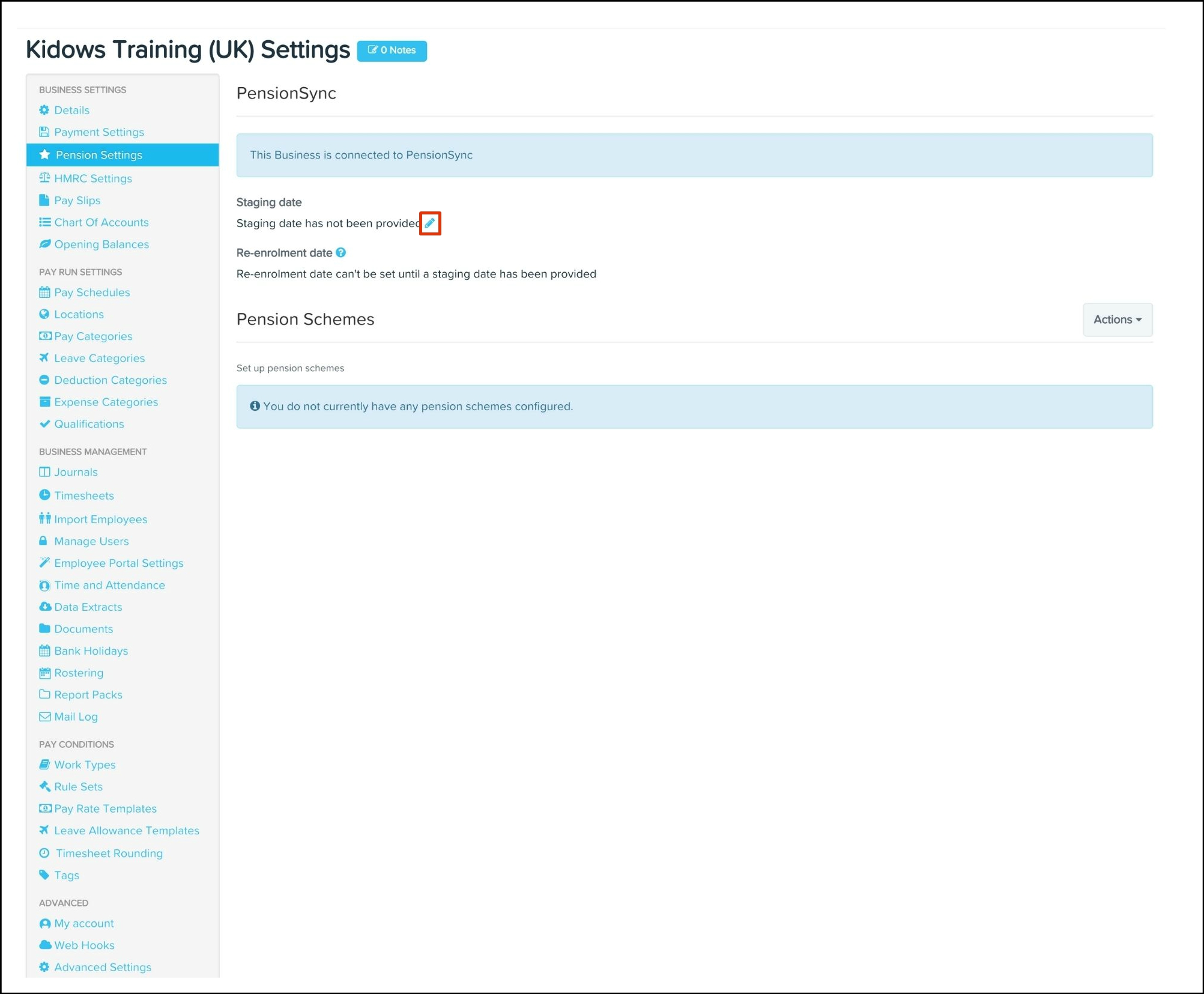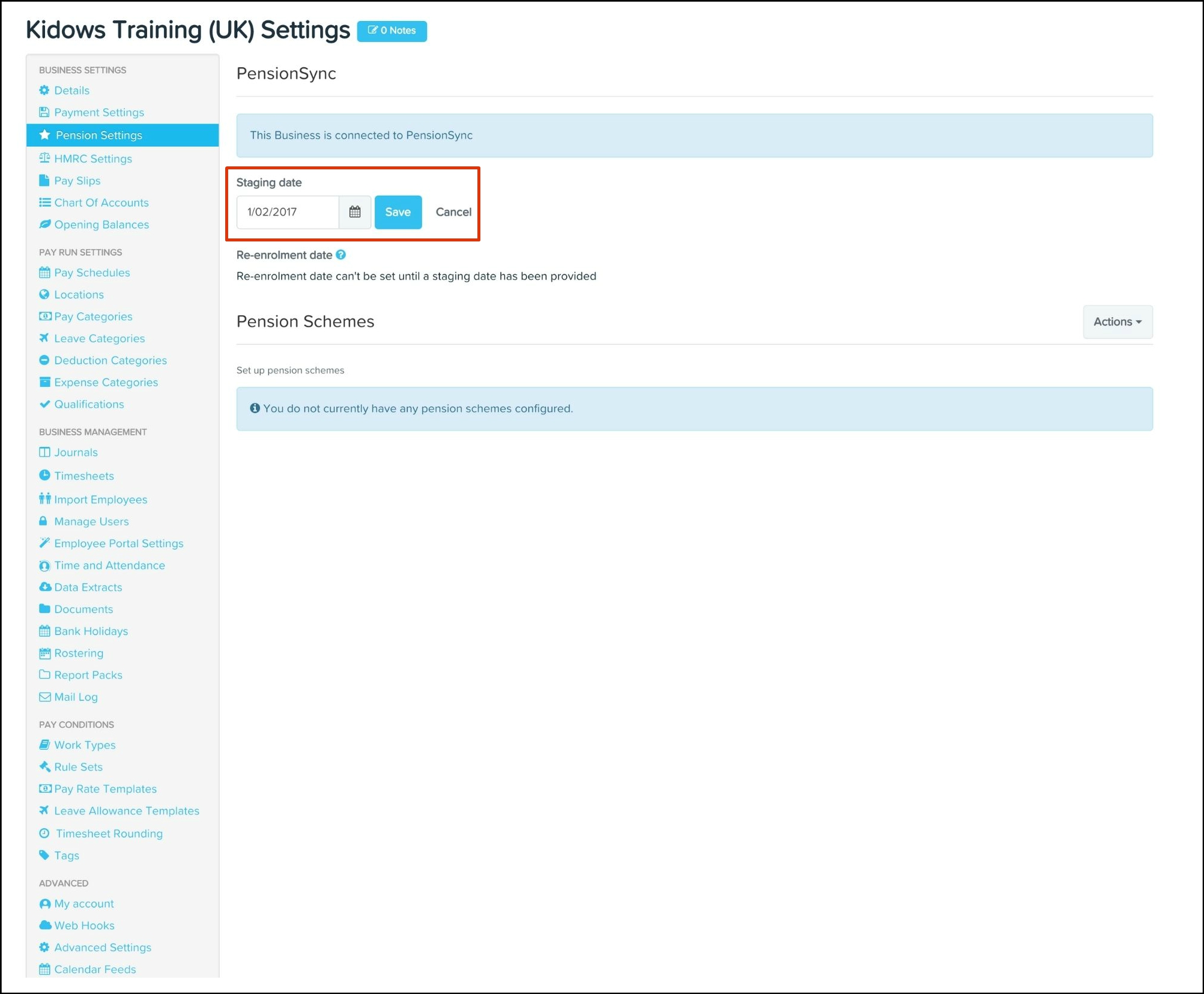 The Pension Settings feature is where you set up your workplace pension details, such as your staging date and re-enrolment dates. The feature also allows you to choose to either sync with an existing provider or you can add your pension schemes and contribution plans manually to payroll classic.