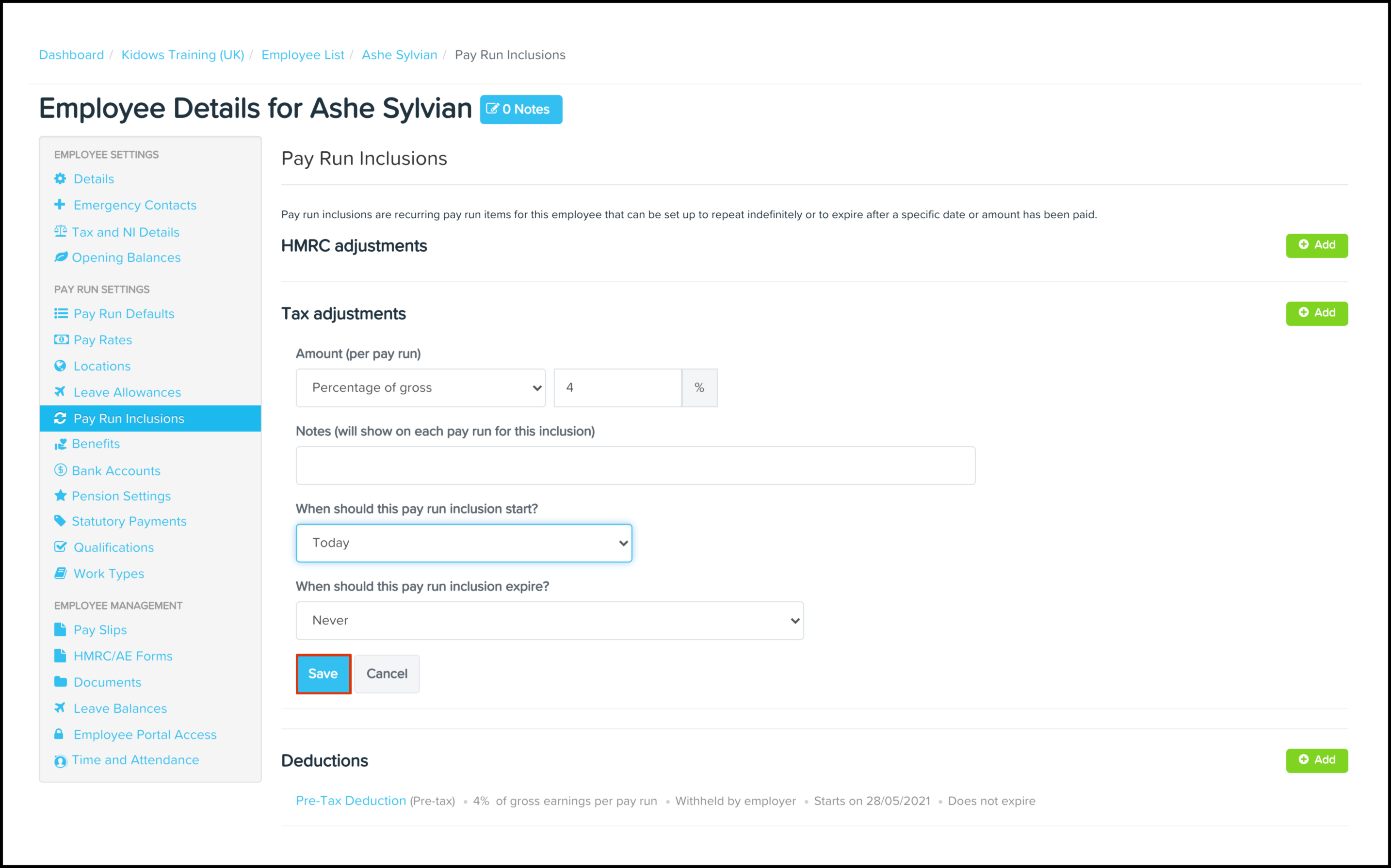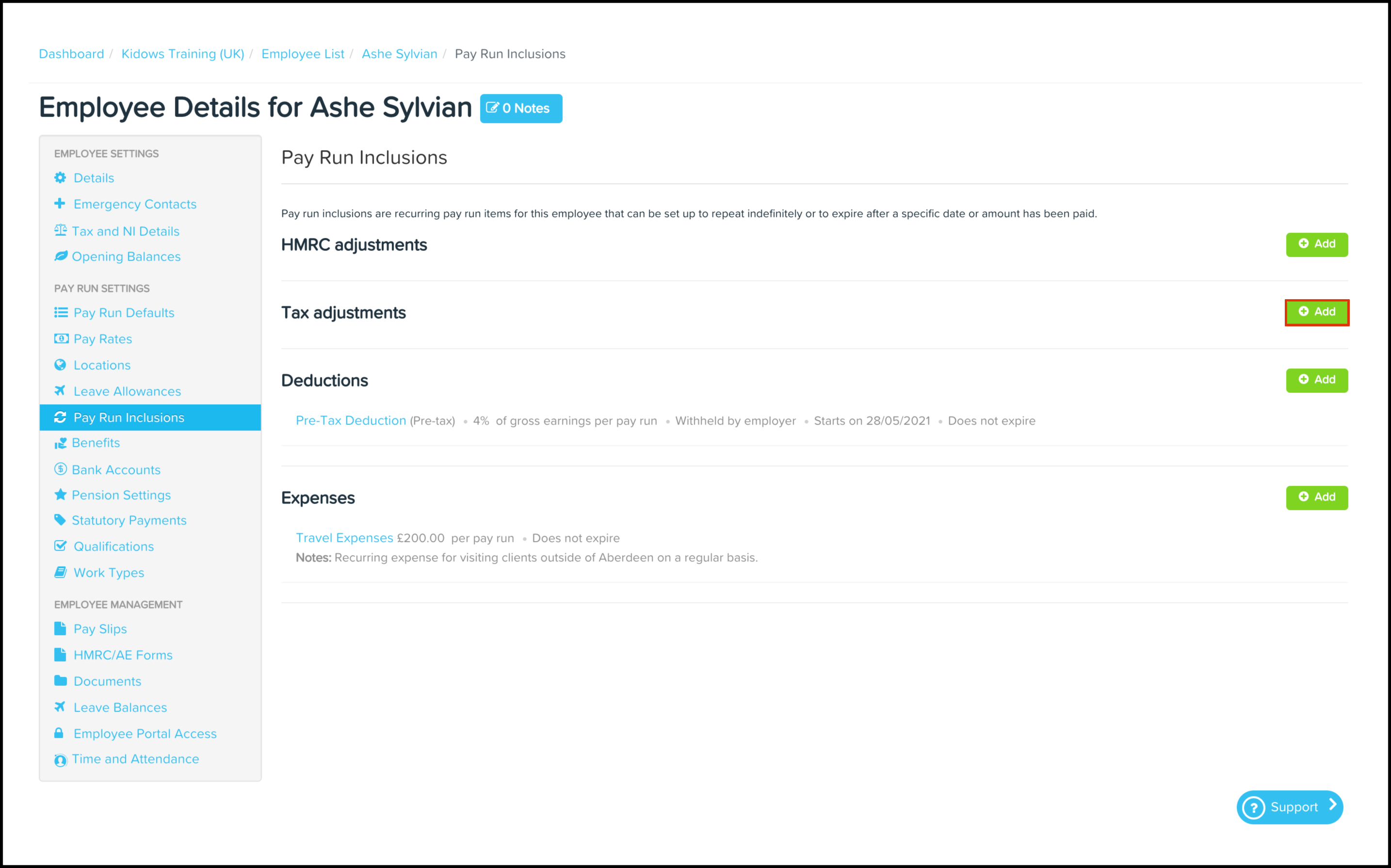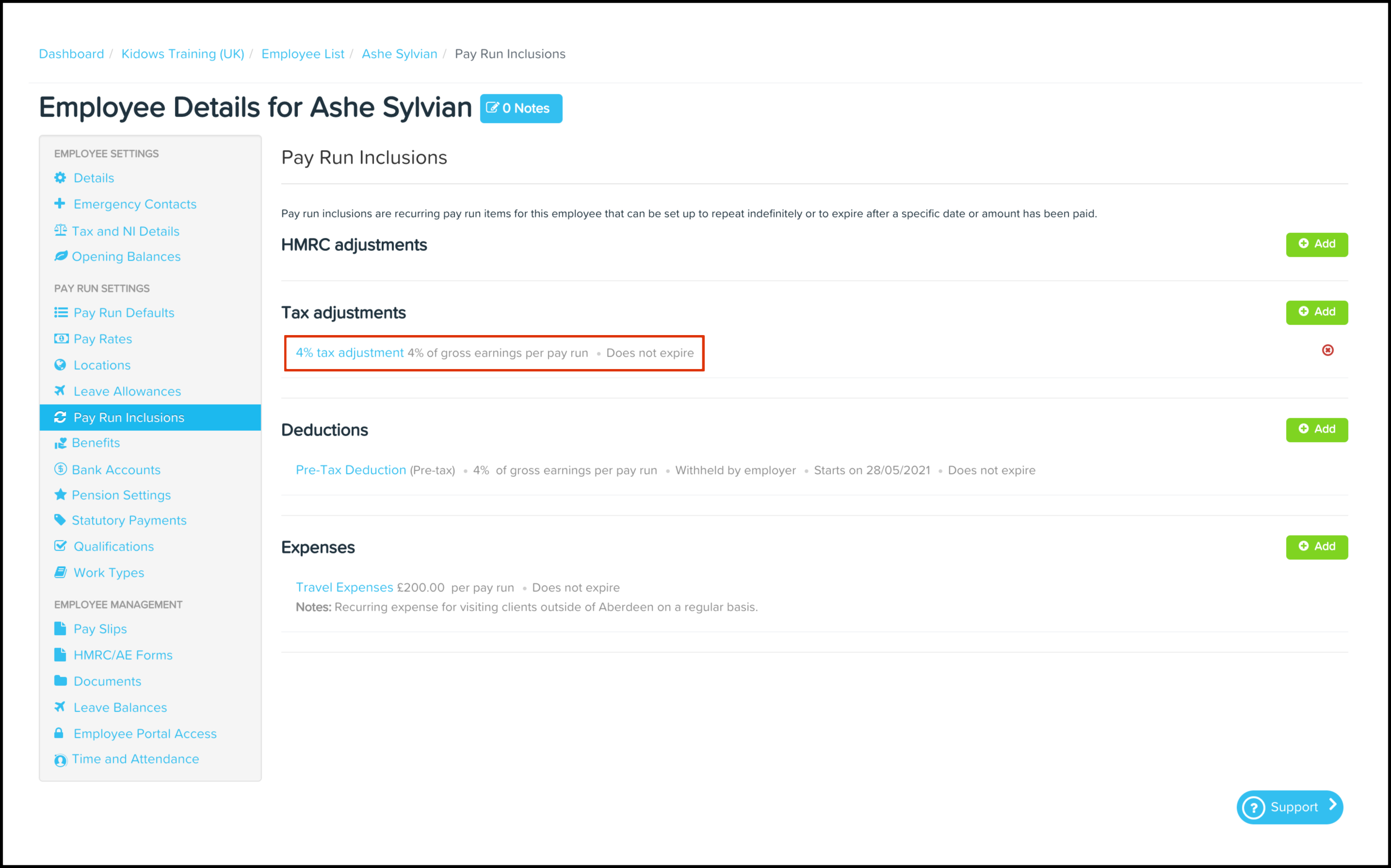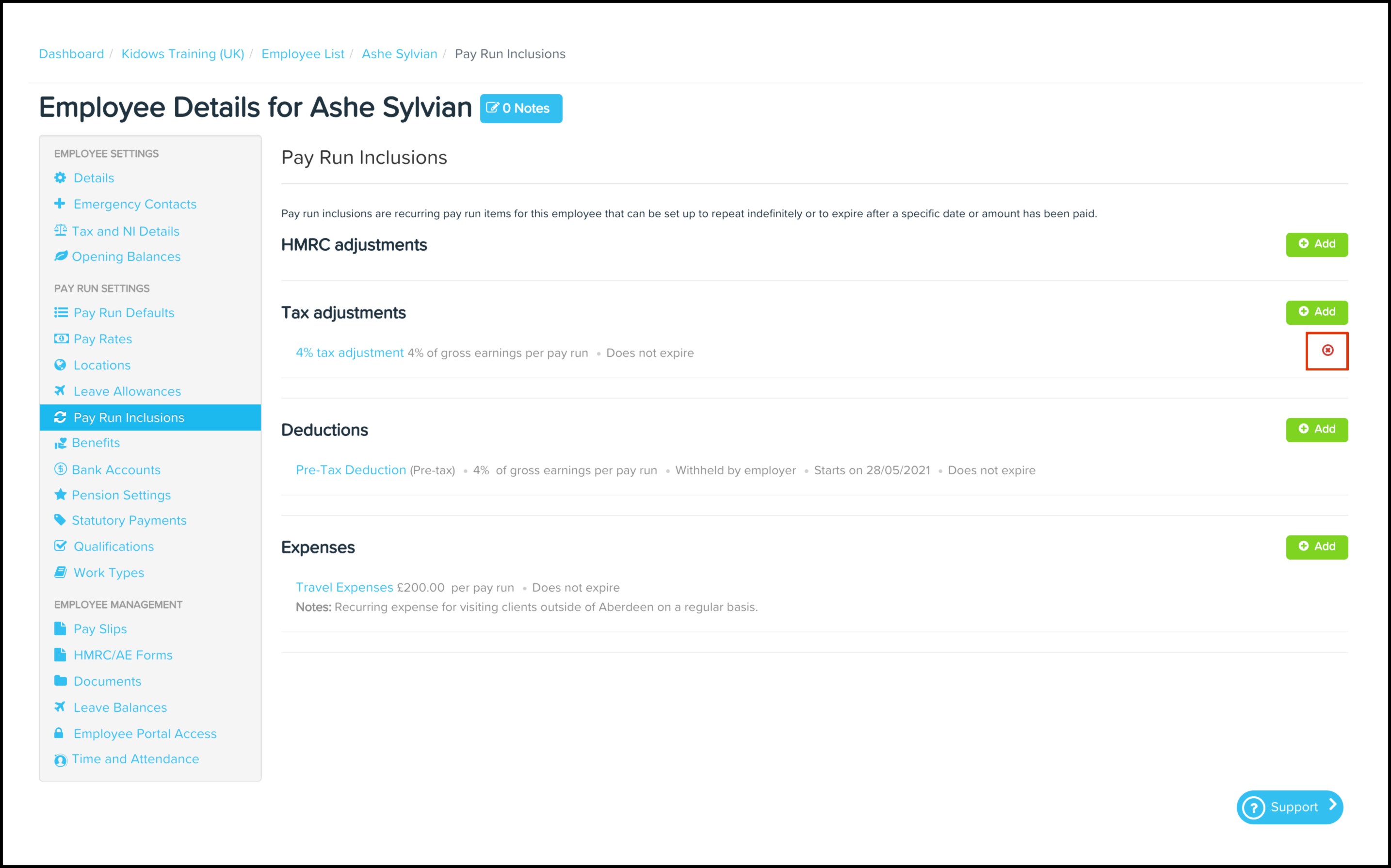 The Pay Run Inclusions Tax Adjustments feature allows you to set up an automated tax adjustment where you can choose the date the inclusion starts on, when it will expire, and the taxable amount. You can also use this feature to edit any information entered previously and delete a record that is no longer required.